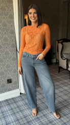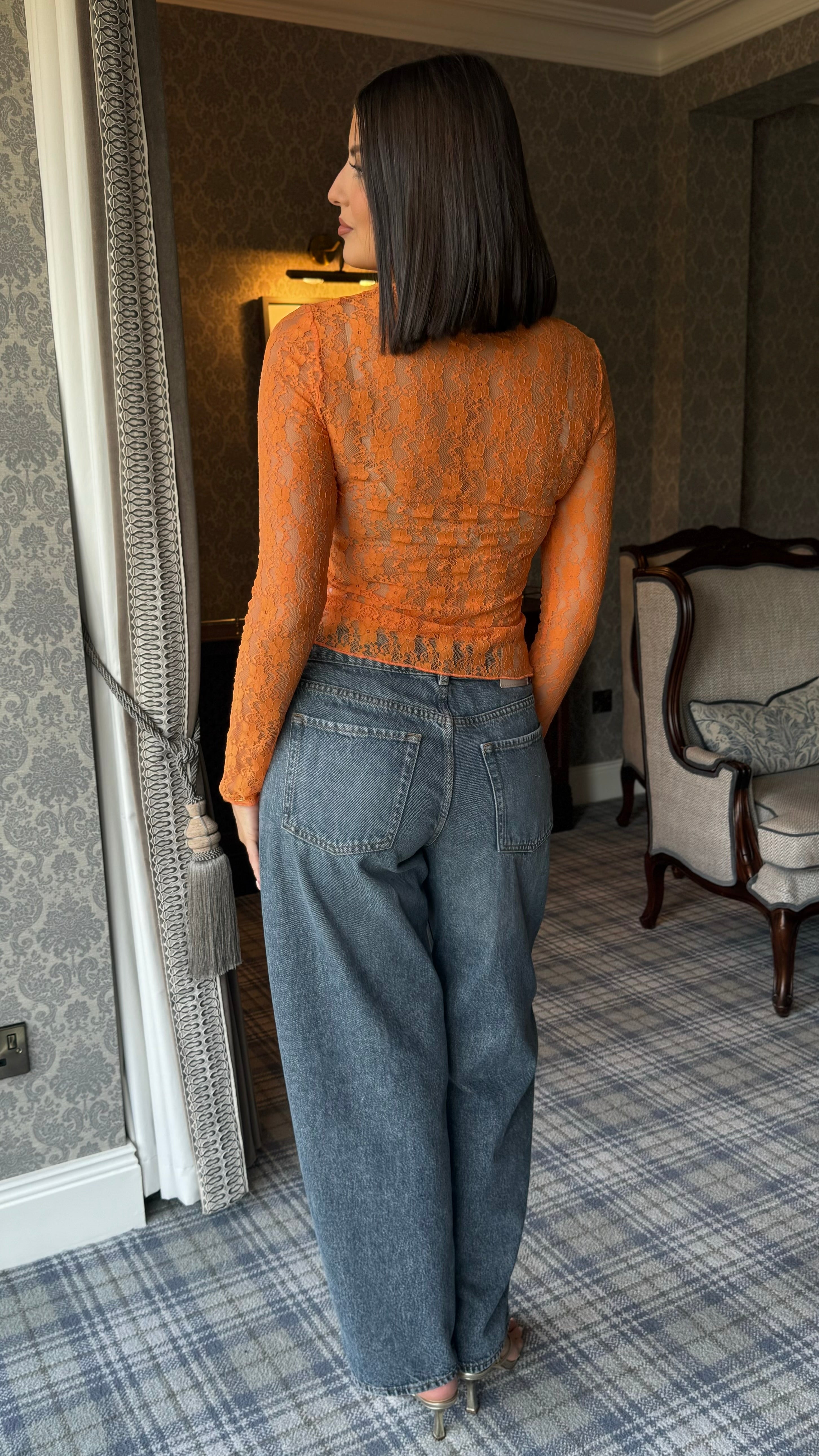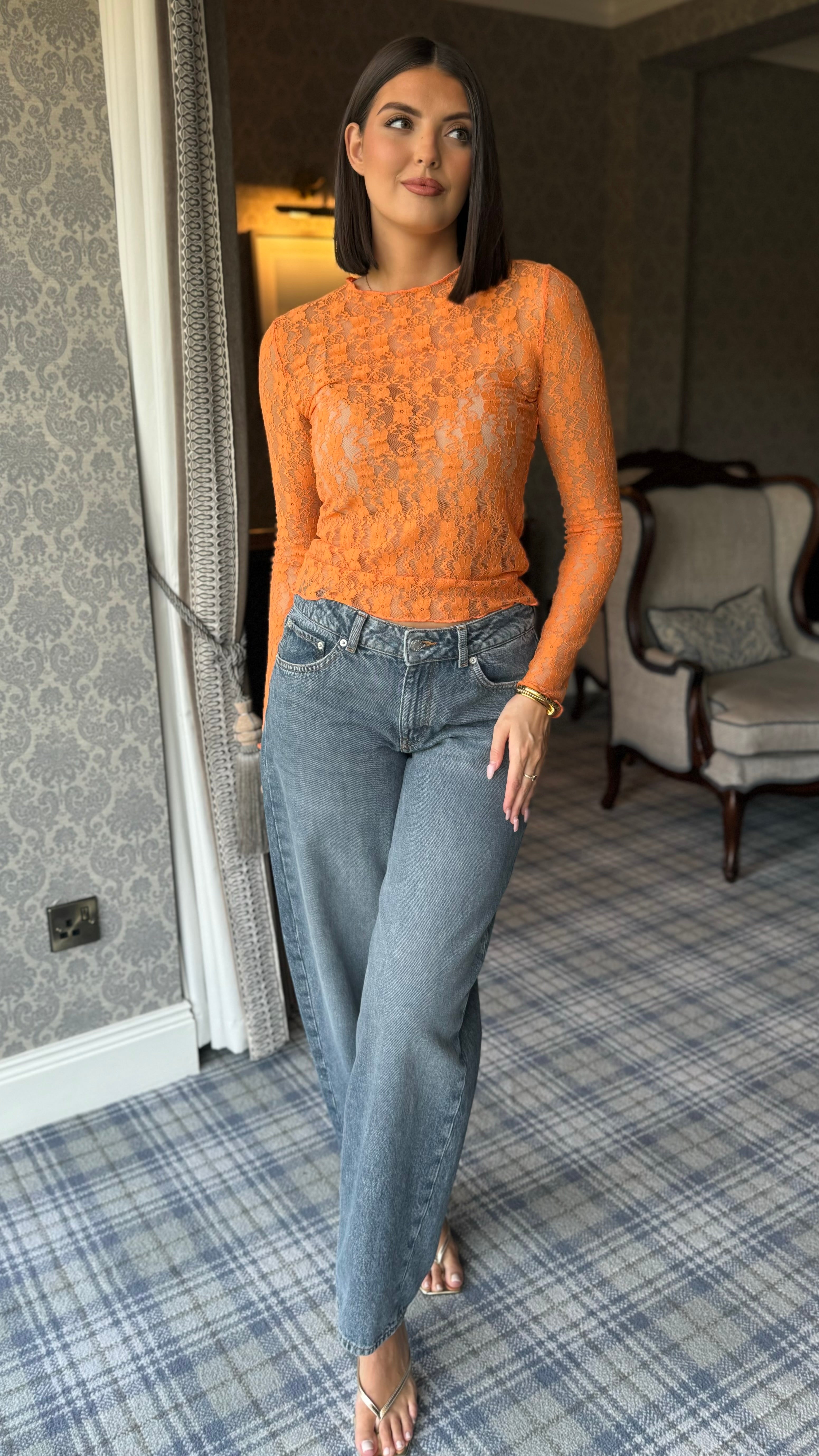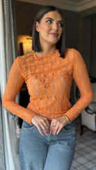 Effortless elegance meets everyday wear with this orange lace long sleeve top. The delicate lace fabric creates a refined, textured look while the round neckline offers a flattering, versatile silhouette. Long sleeves provide coverage and sophistication, making it perfect for layering or wearing solo. The structured lace construction maintains its shape through wear and washing, delivering a premium finish that elevates any outfit.