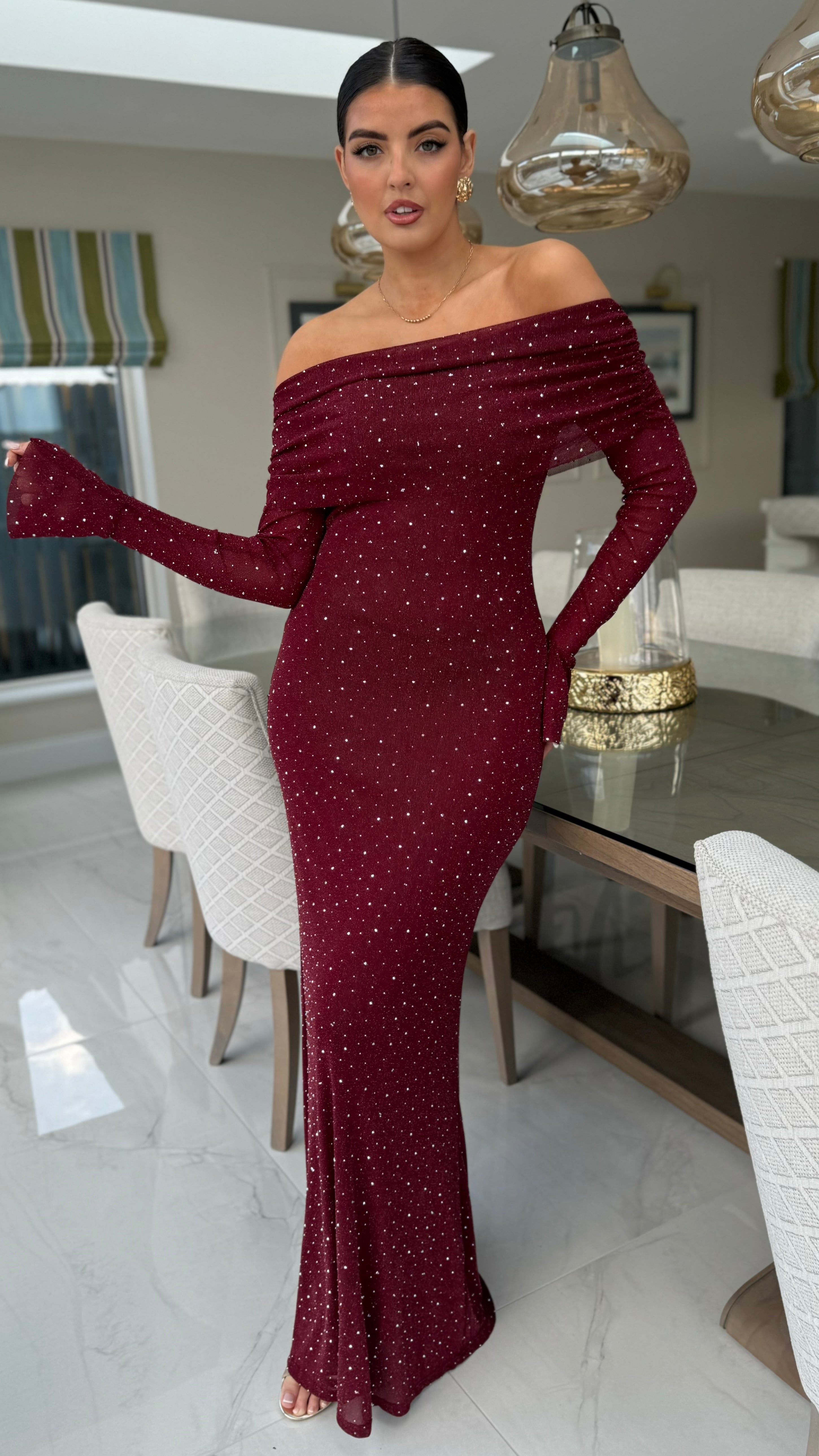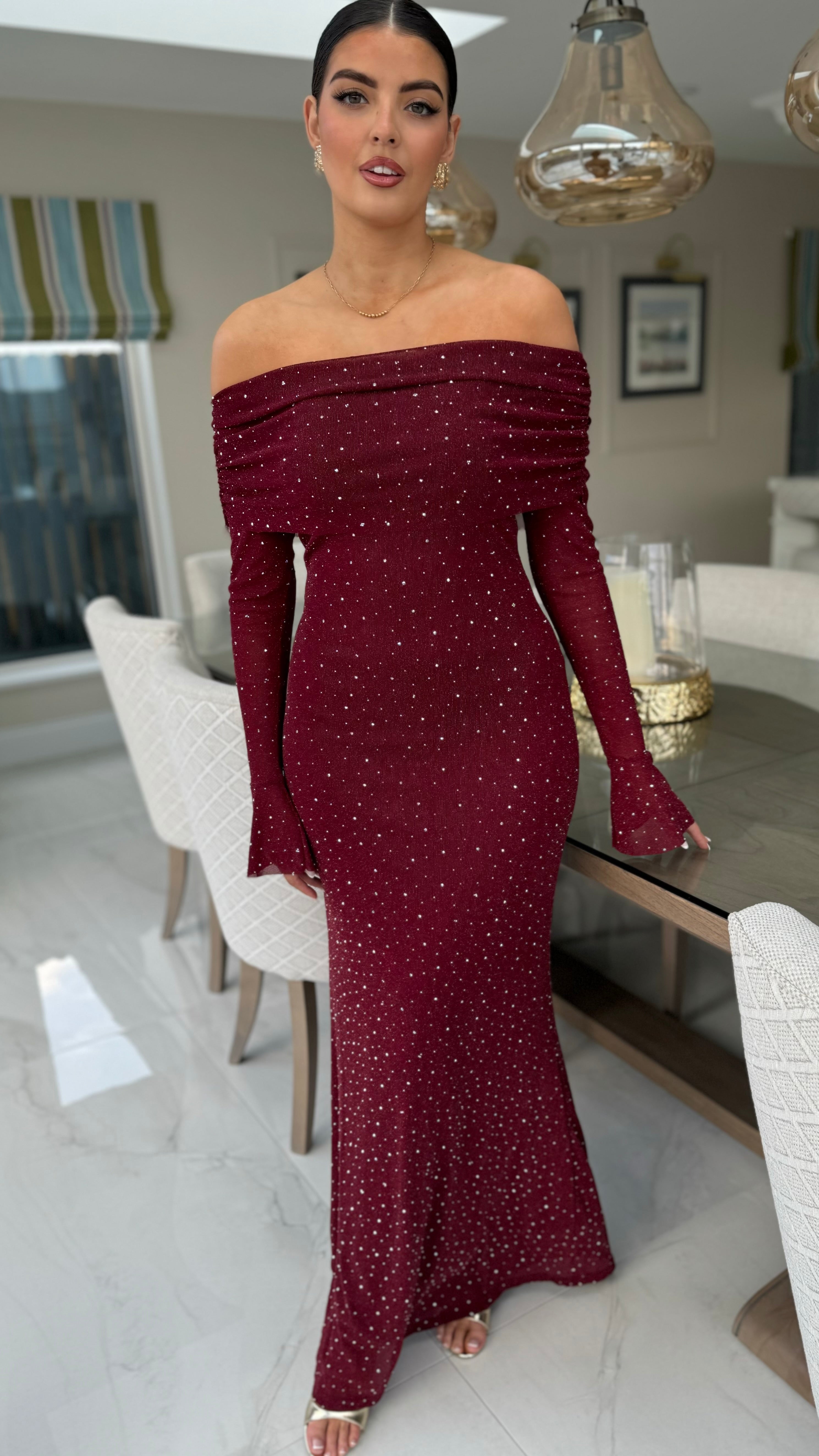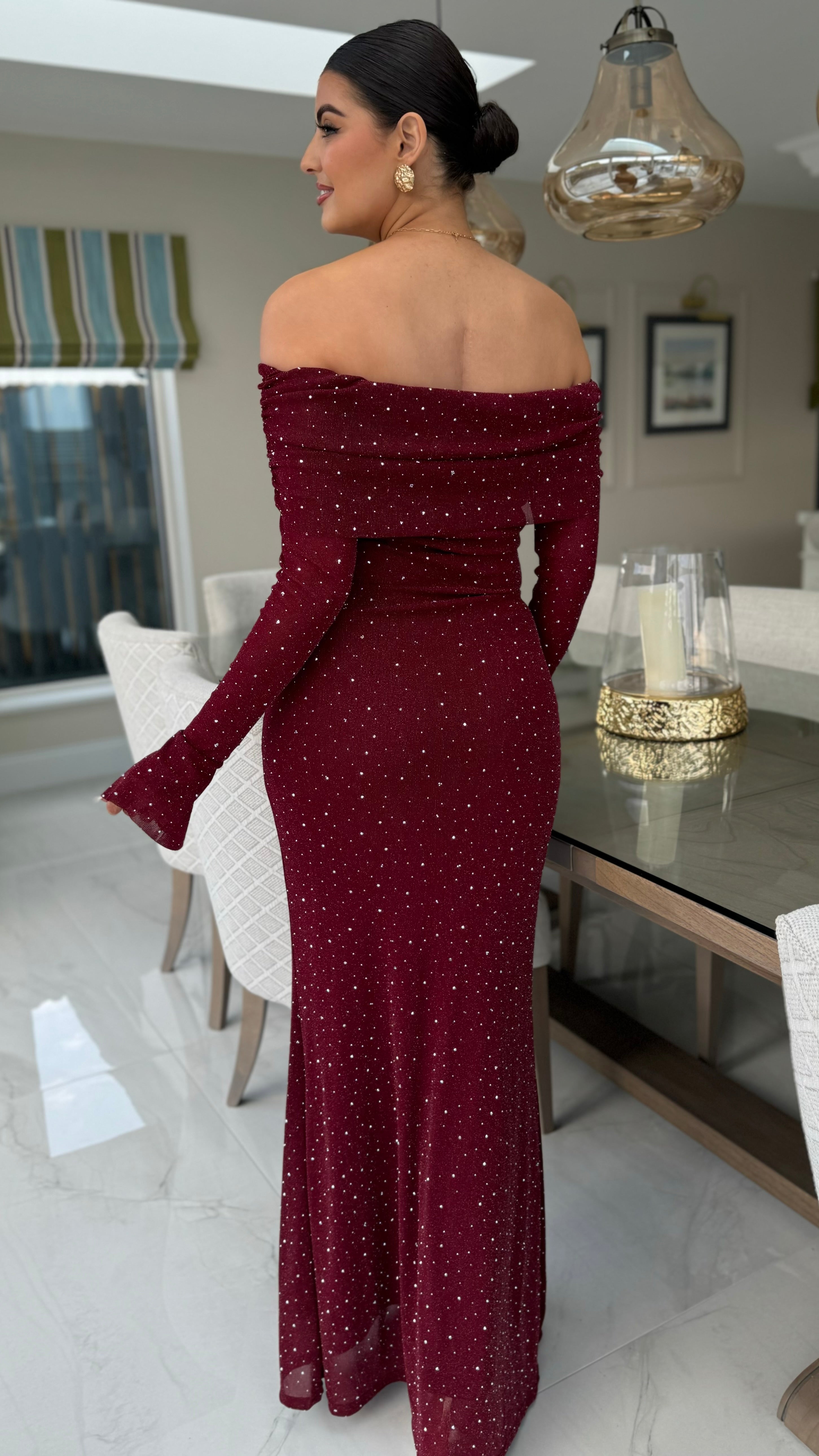 Elfrida Burgundy Sequin Off Shoulder Maxi Dress