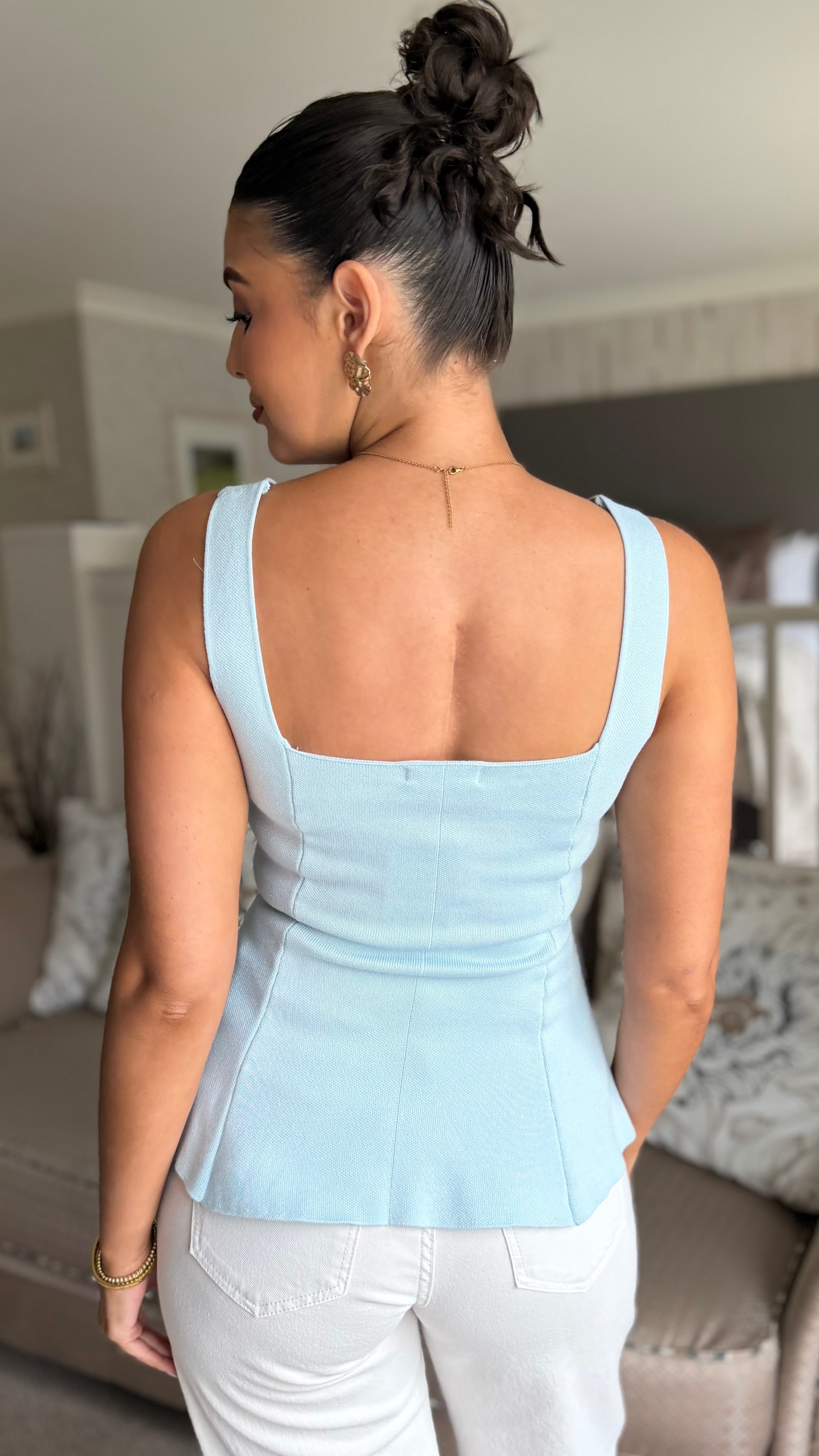 Elevate your everyday wardrobe with this striking blue peplum top, designed for both comfort and style. The soft, stretchy knit fabric moves with you throughout the day, while the structured square neckline creates a flattering silhouette. Delicate gold star details on the straps add a touch of playful sophistication, and the peplum hem brings contemporary flair to a timeless shape. Perfect for dressing up or down, this piece is your go-to for effortless polish.
