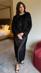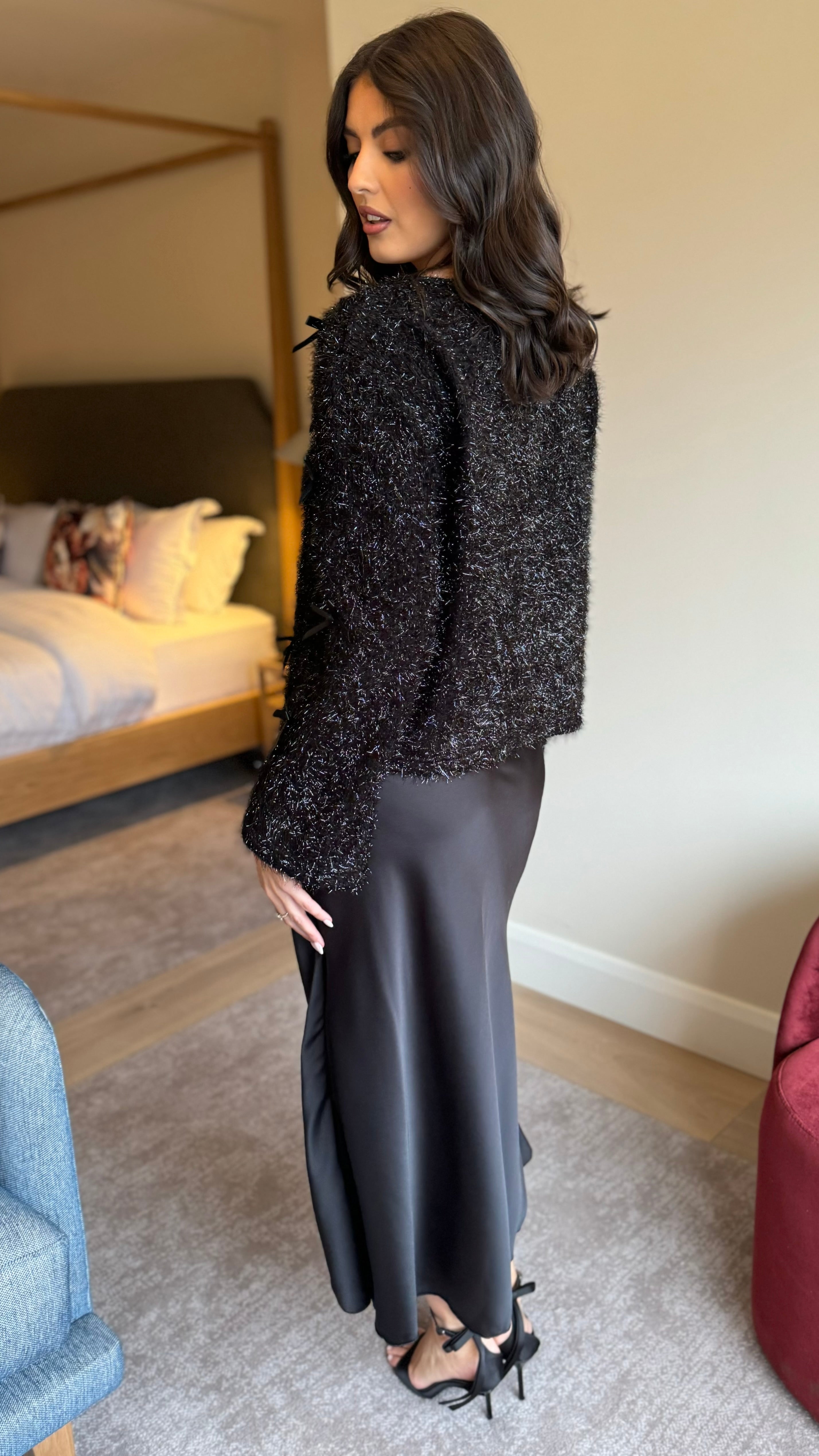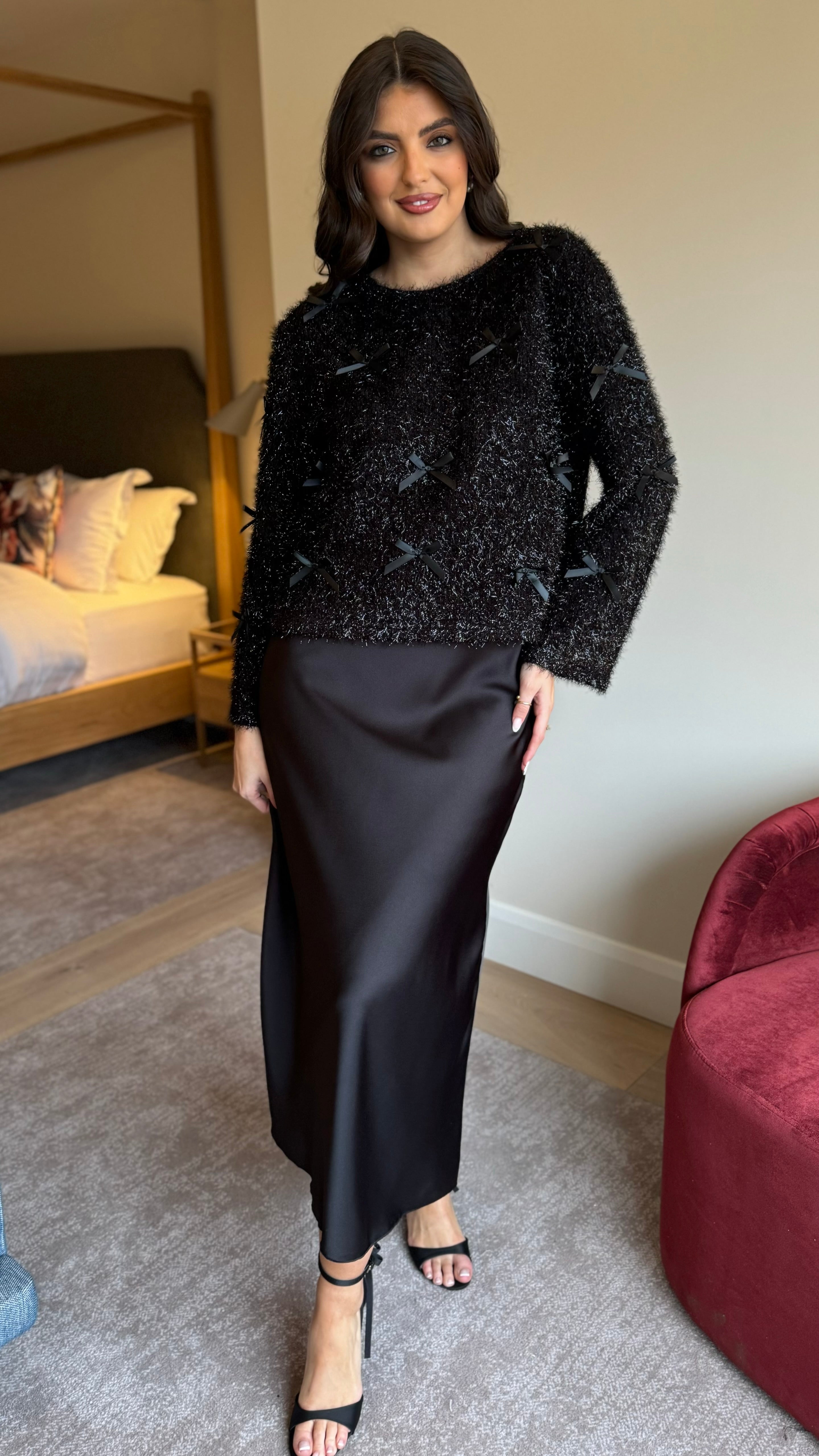This Elliott Black Bow Detailed Knit Jumper adds a playful touch with its charming bow and cozy chenille detail. Stay warm and stylish this season with this unique knit jumper.