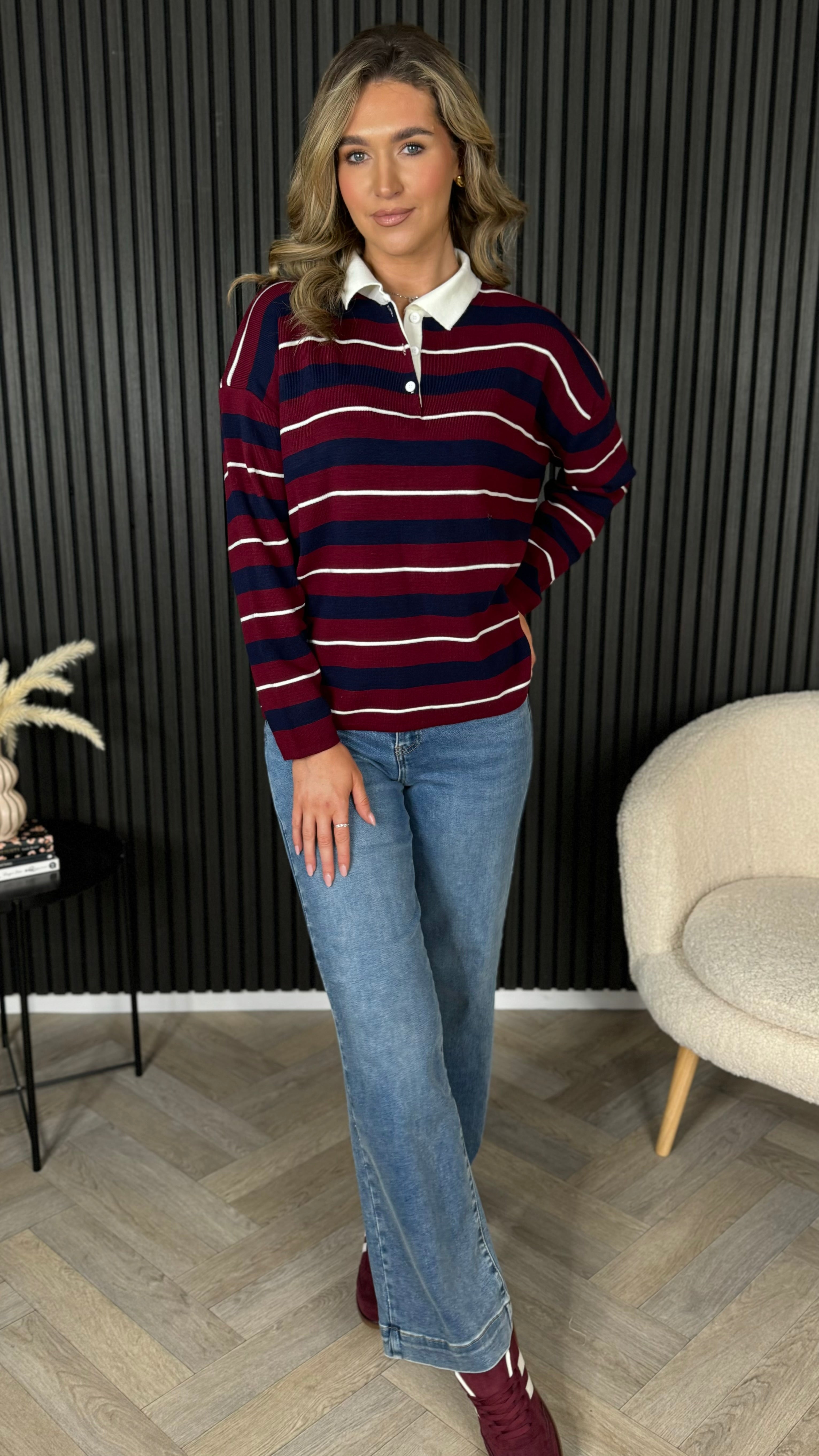 Slip into effortless style with this oversized rugby stripe jumper that's equal parts cosy and cool. Featuring bold burgundy and navy stripes with a classic collar detail, it's crafted from soft ribbed knit that feels as good as it looks. Perfect for lazy weekends or throwing over your favourite tee, this jumper brings that relaxed, sporty-chic vibe to any outfit. Your new go-to for comfort that doesn't compromise on style.