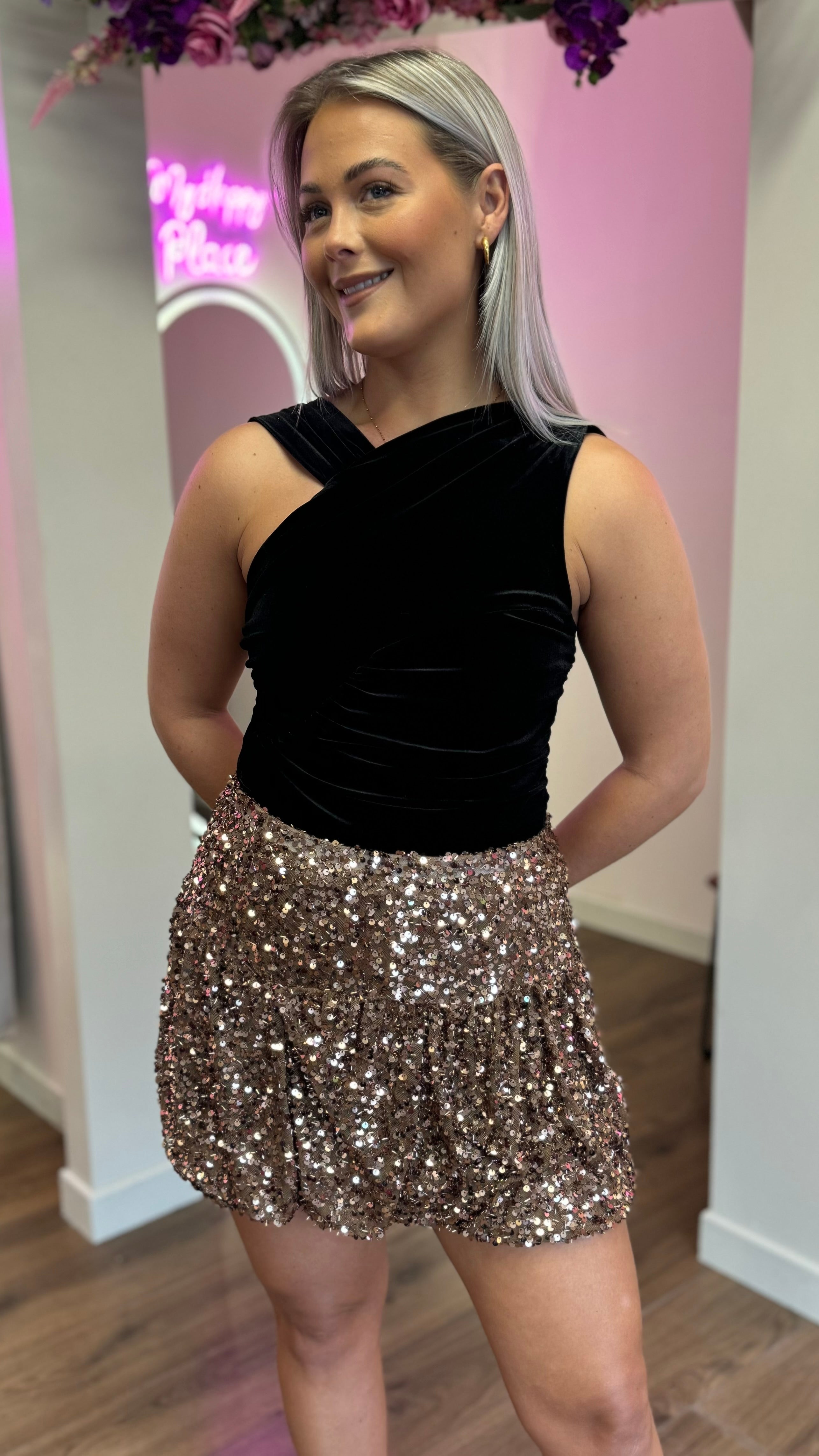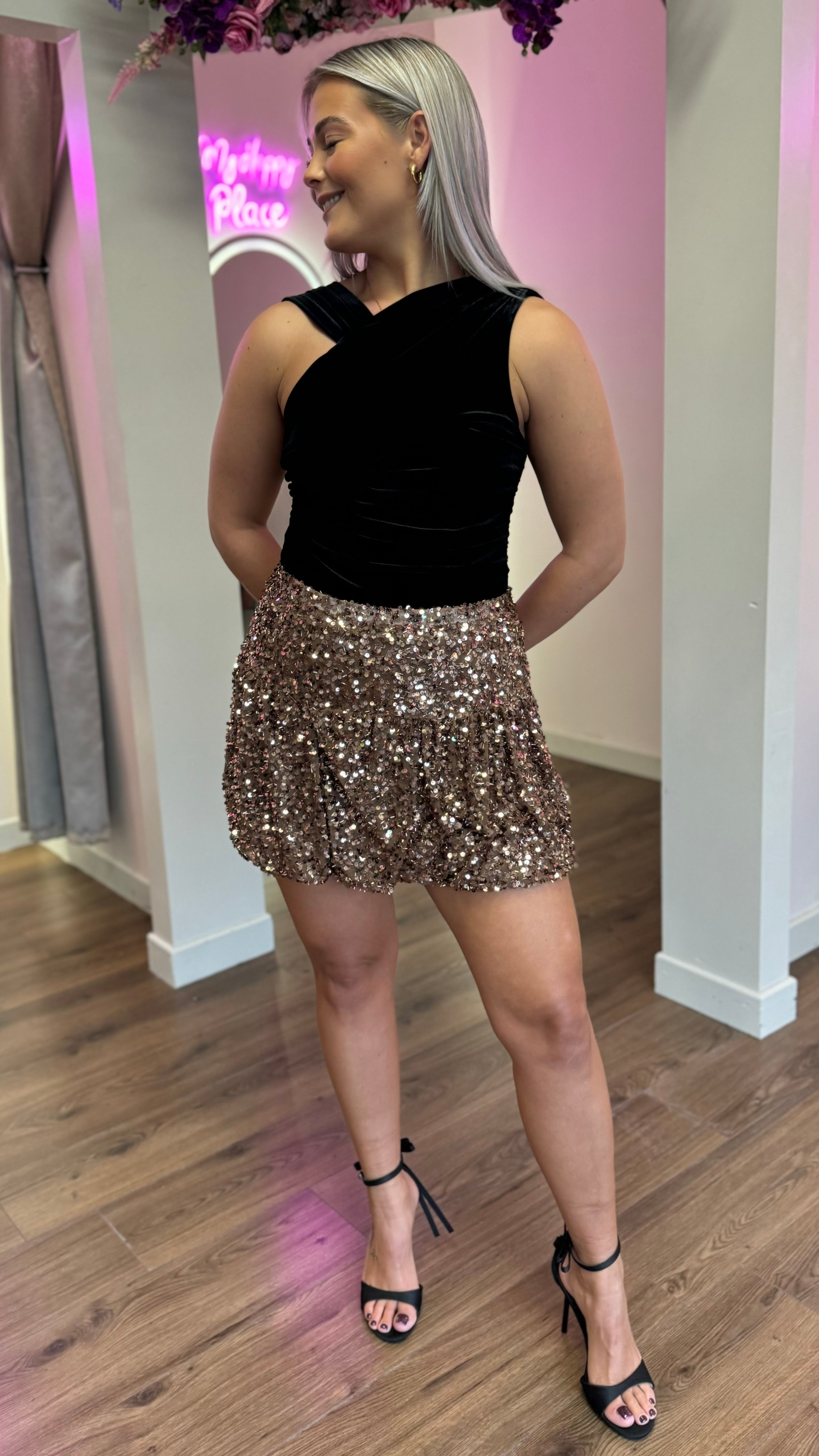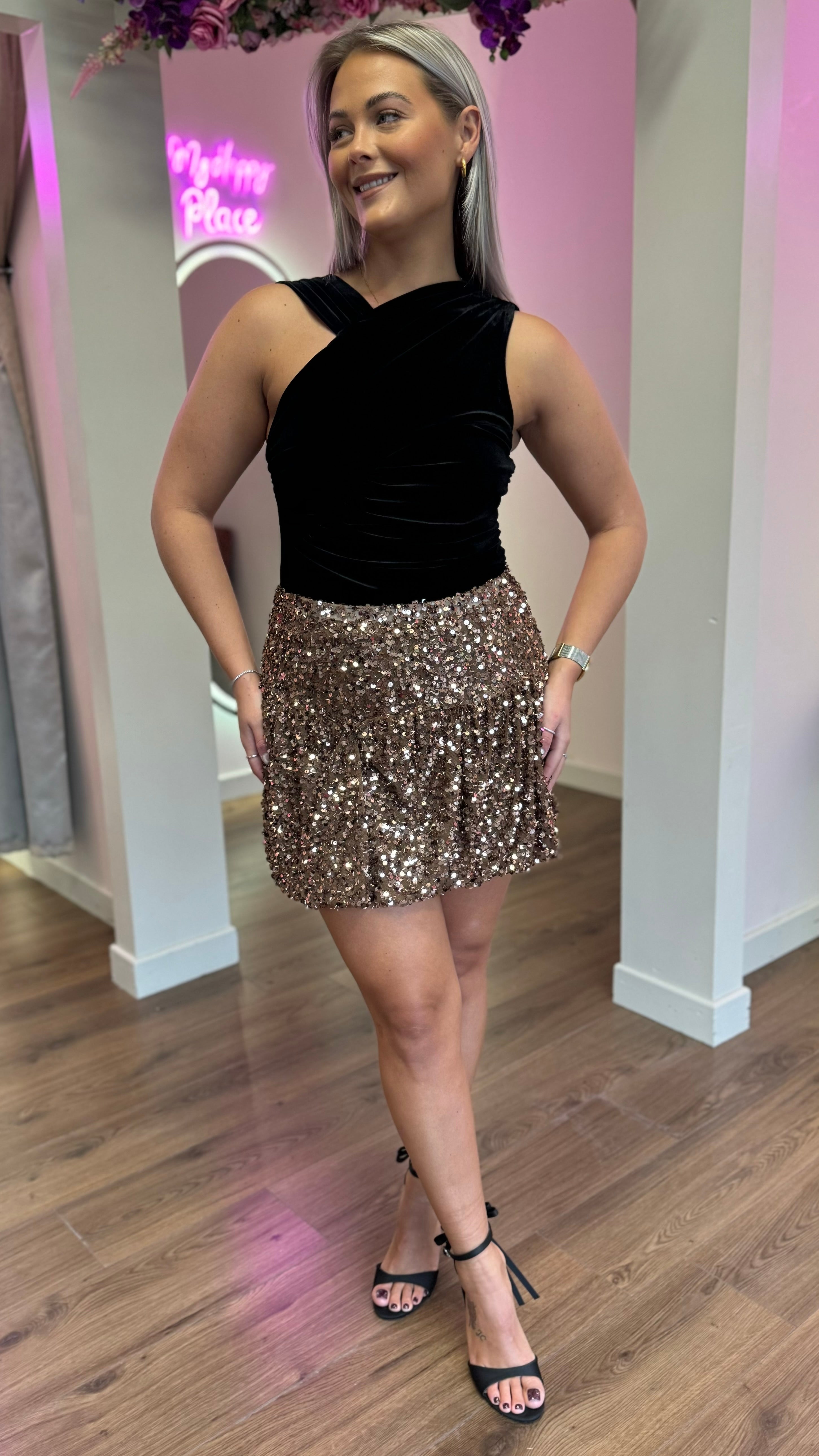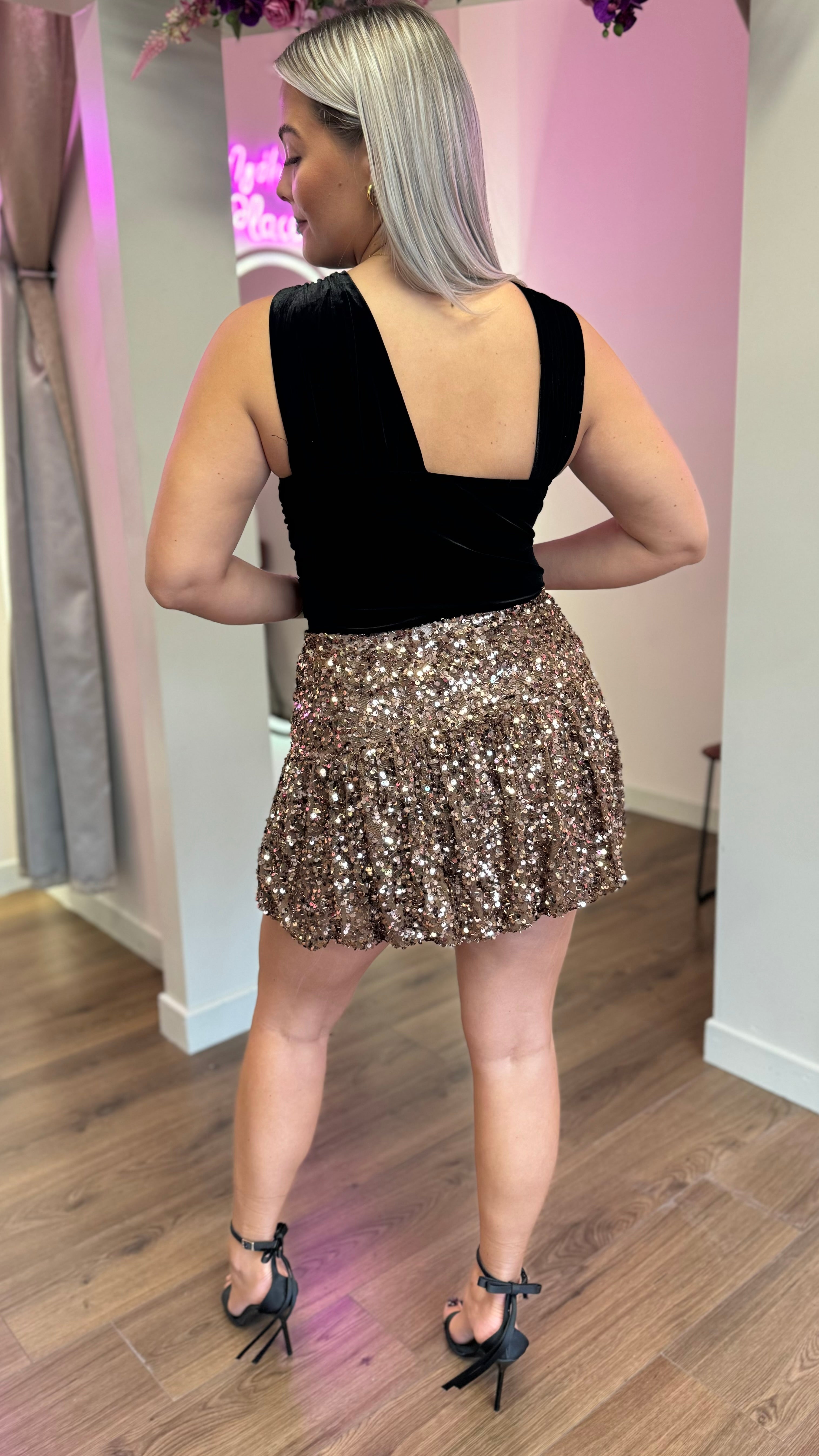 Shimmer and twirl in this show-stopping mini skirt! Covered in eye-catching sequins from top to bottom, it's guaranteed to catch the light—and all the compliments. The playful frill hem adds a flirty touch, while the elasticated waistband ensures a comfortable, secure fit all night long. Perfect for parties, nights out, or whenever you want to add some sparkle to your wardrobe.