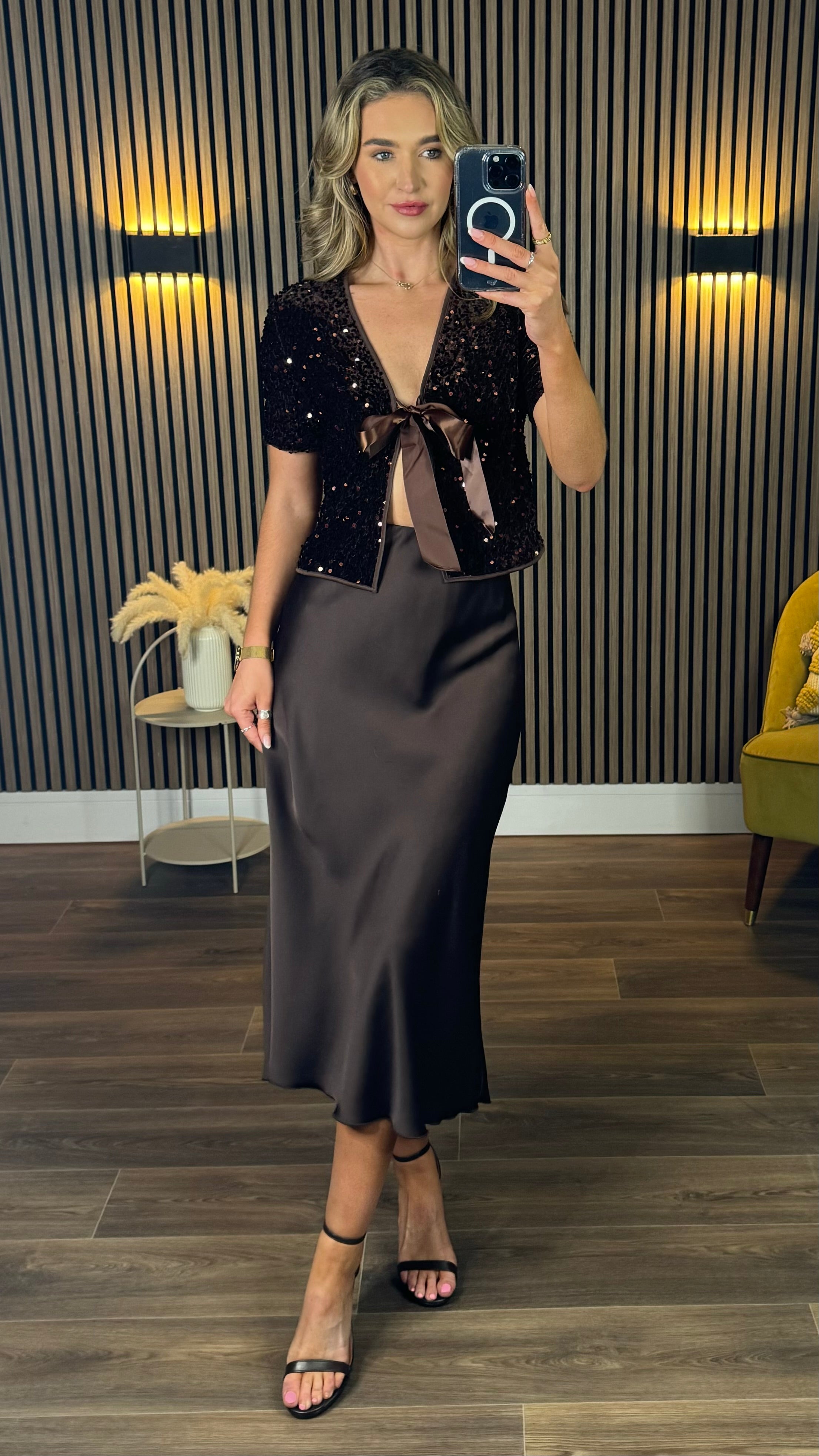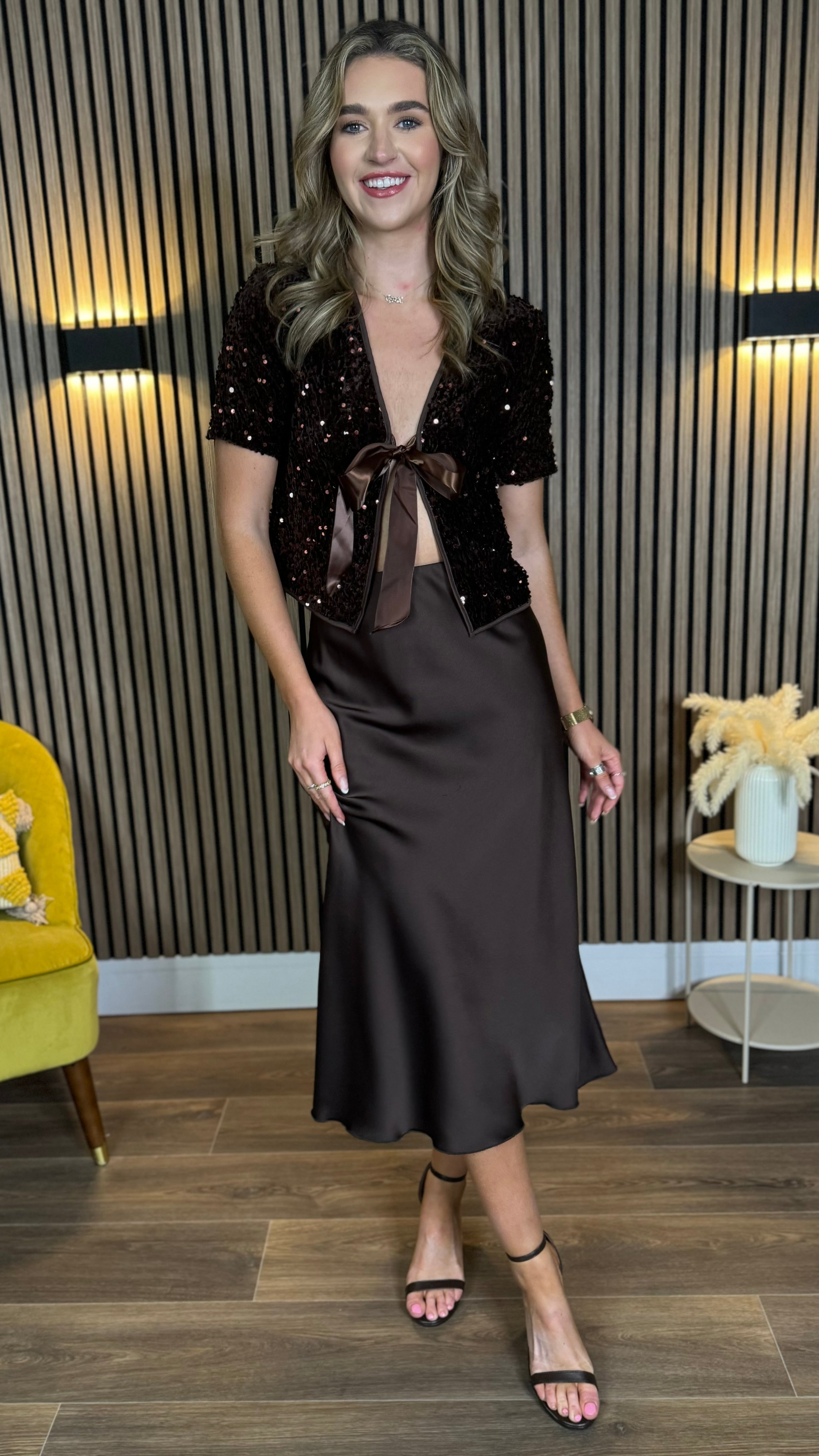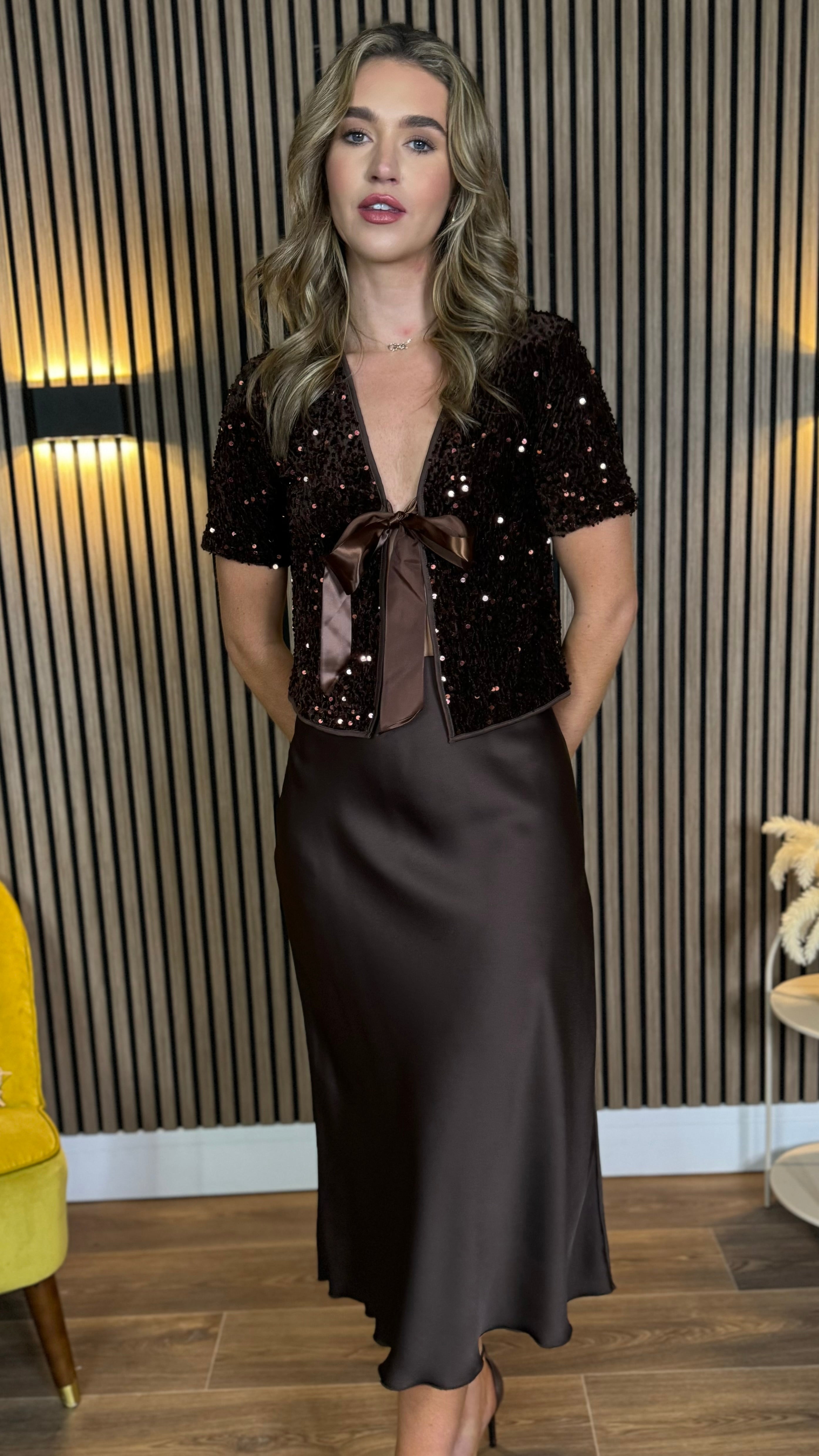 Add a touch of sparkle to your look with the Fia Brown Sequin Tie Detail Top. Featuring a playful V-neck and a chic satin bow, this on-trend piece brings fun to your wardrobe. Its half-length sleeves offer the perfect balance between coverage and comfort, making it ideal for day-to-night wear. Shine bright and stand out with this stylish top!