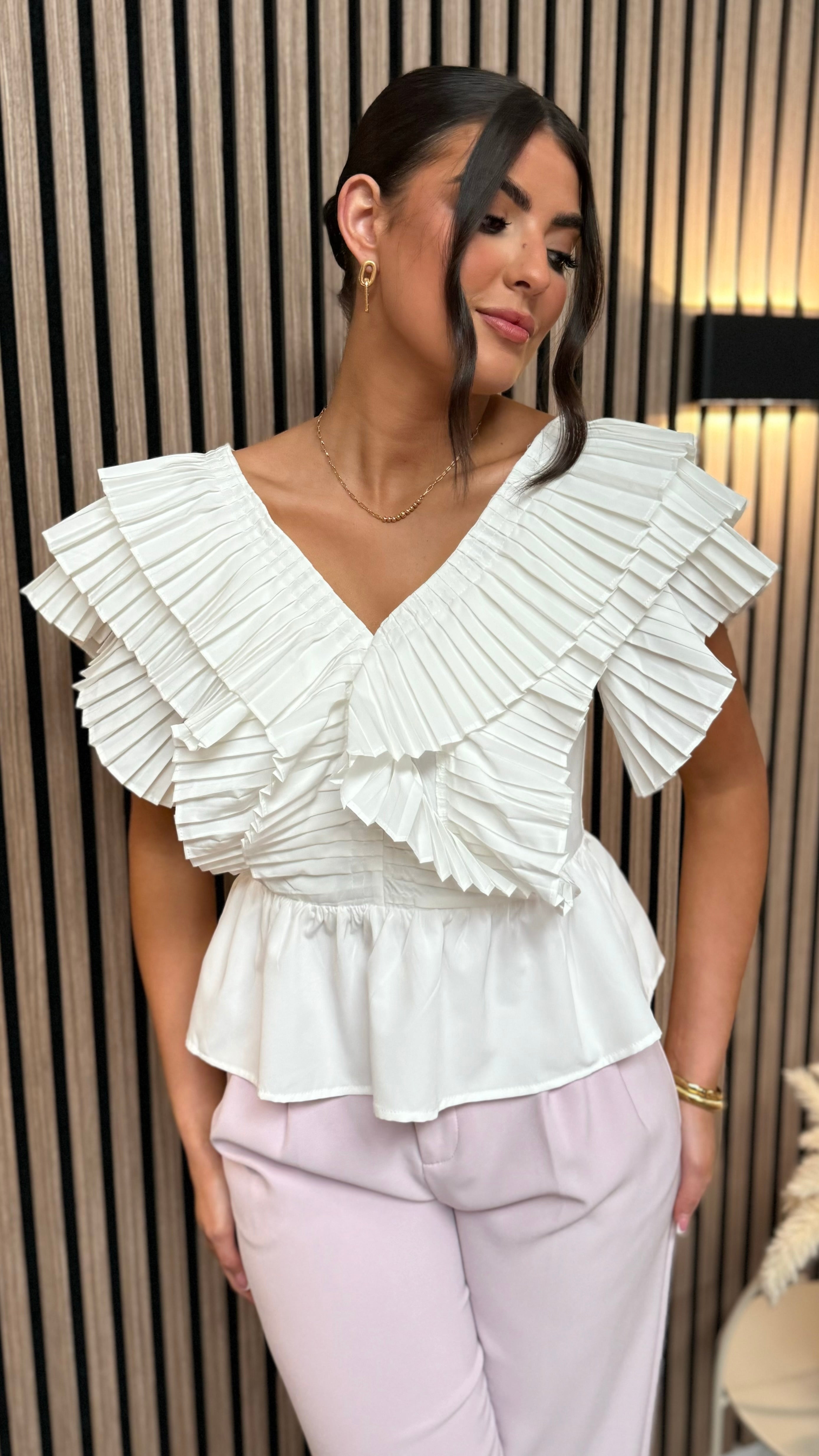 Get ready to turn heads with the Gabriella White Ruffle Detail Peplum Top! This playful top features a flirty v neckline and stylish ruffle detail, perfect for adding a touch of whimsy to any outfit. The wide short sleeves offer a comfortable and trendy look. 🔥