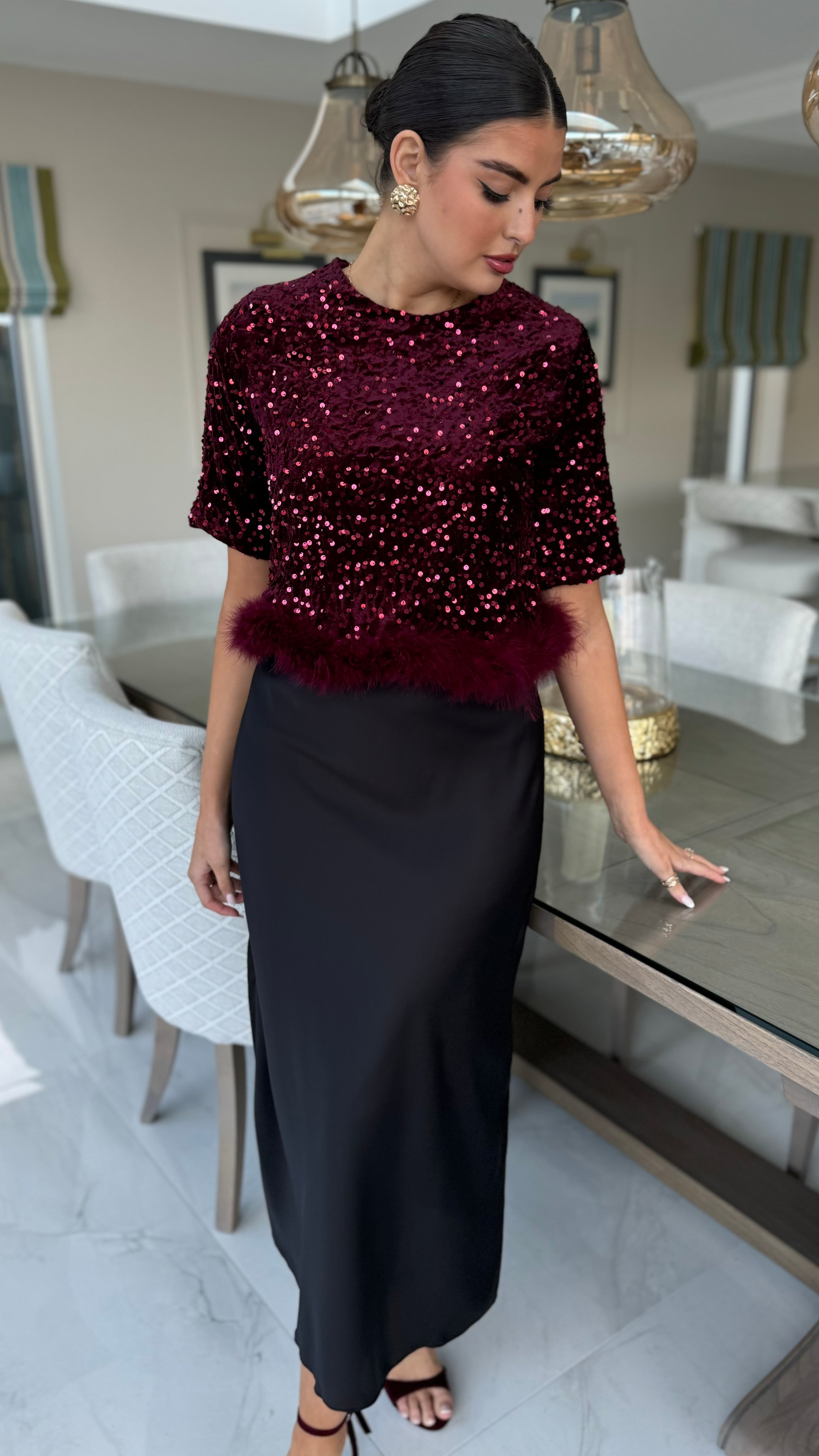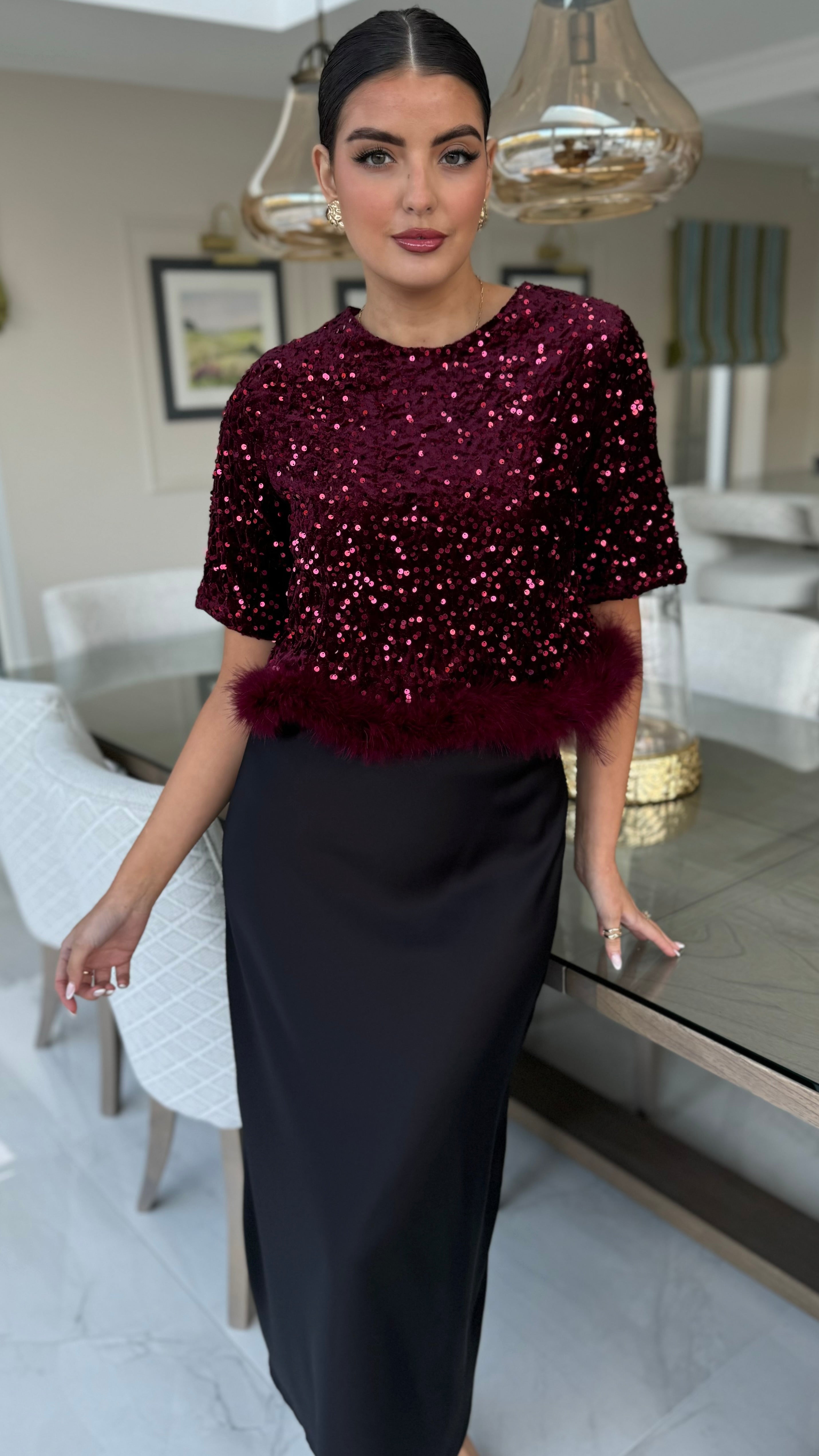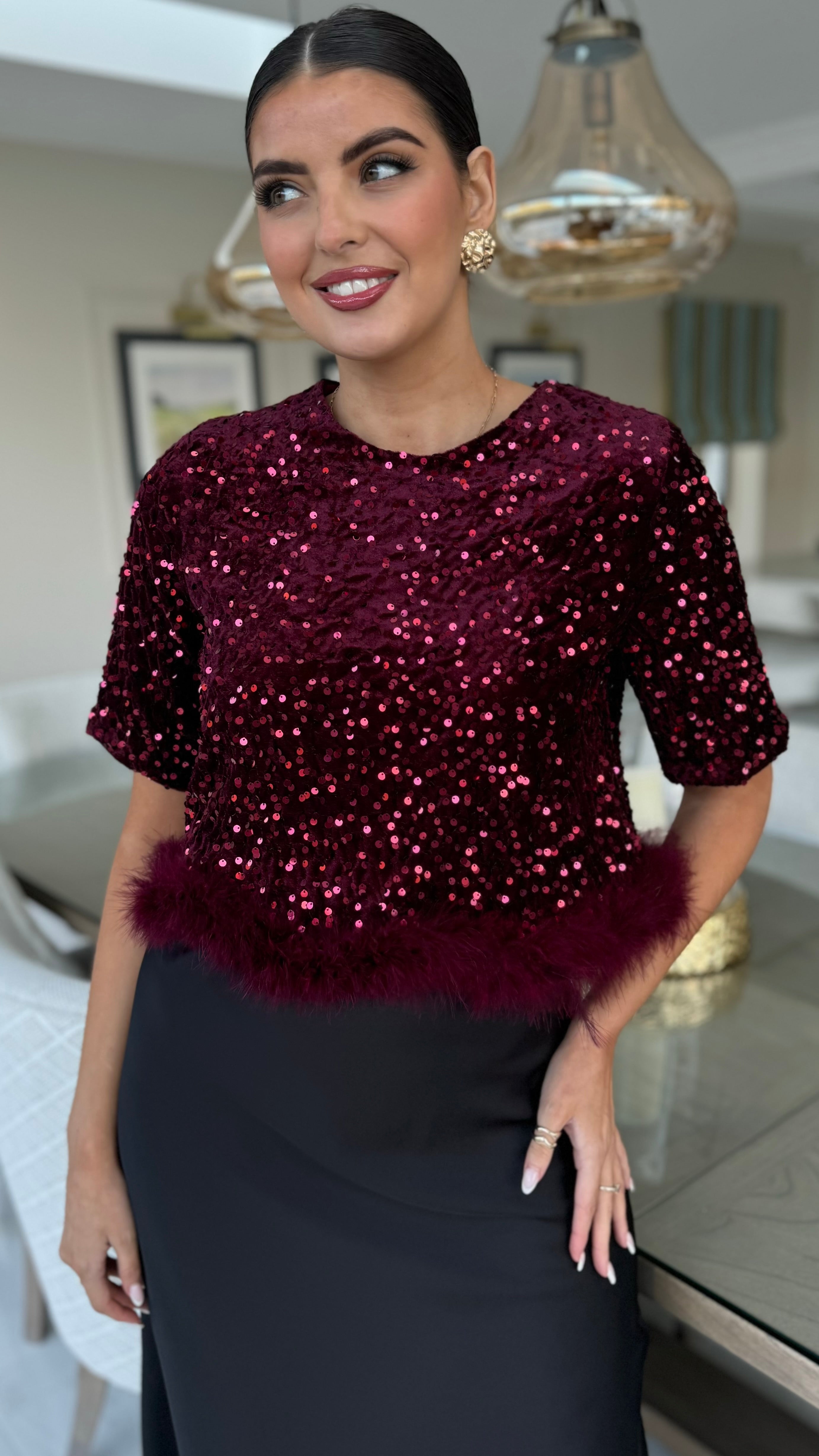 Elevate your evening look with this show-stopping burgundy sequin top! Featuring a chic round neckline and relaxed half-length sleeves, it's the perfect balance of glam and comfort. The luxe faux fur hem adds a touch of sophistication, while the discreet back zip makes dressing effortless. Whether you're heading to a party or a night out, this piece delivers serious sparkle with an undeniable edge.