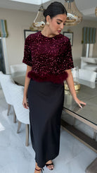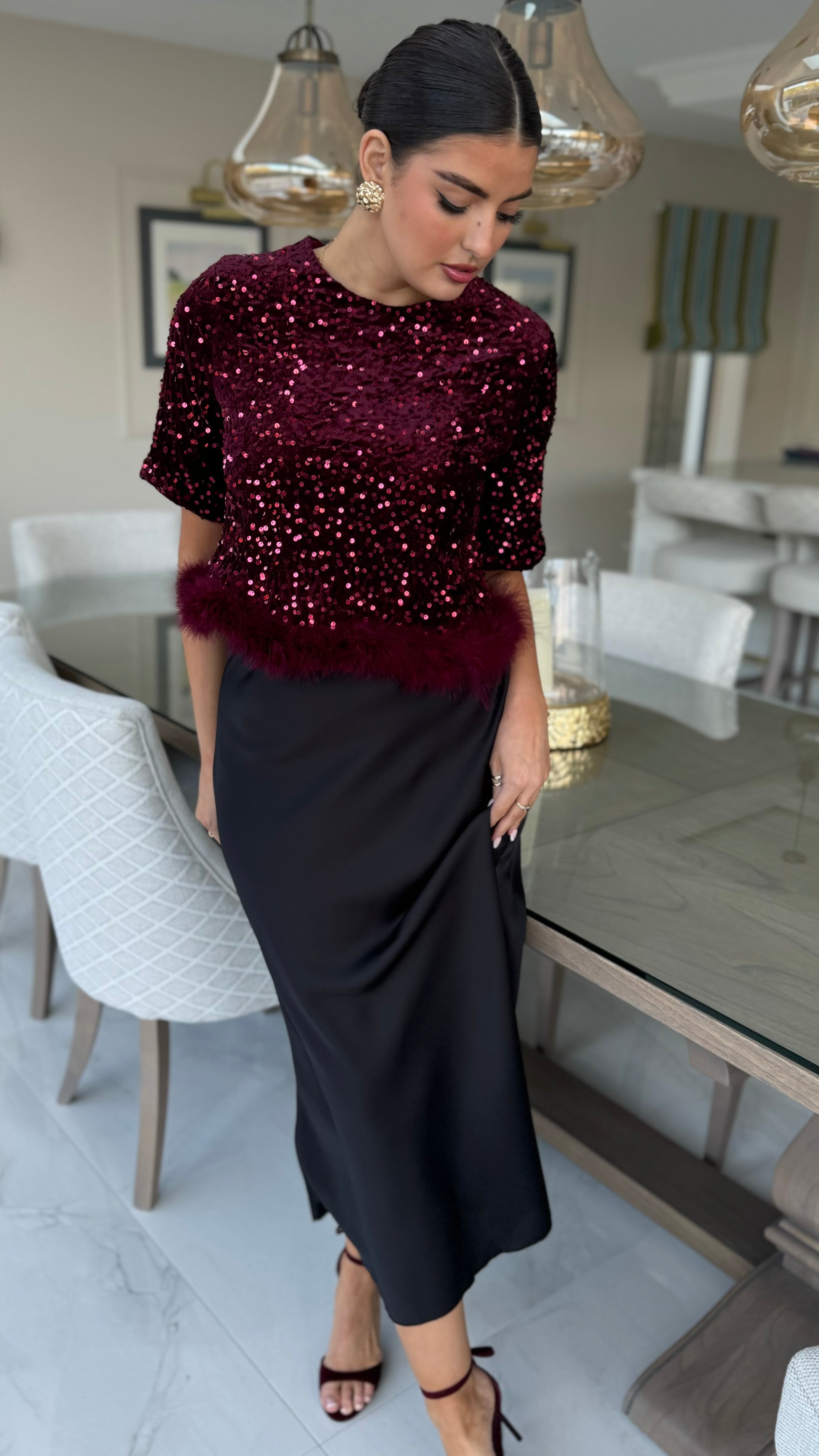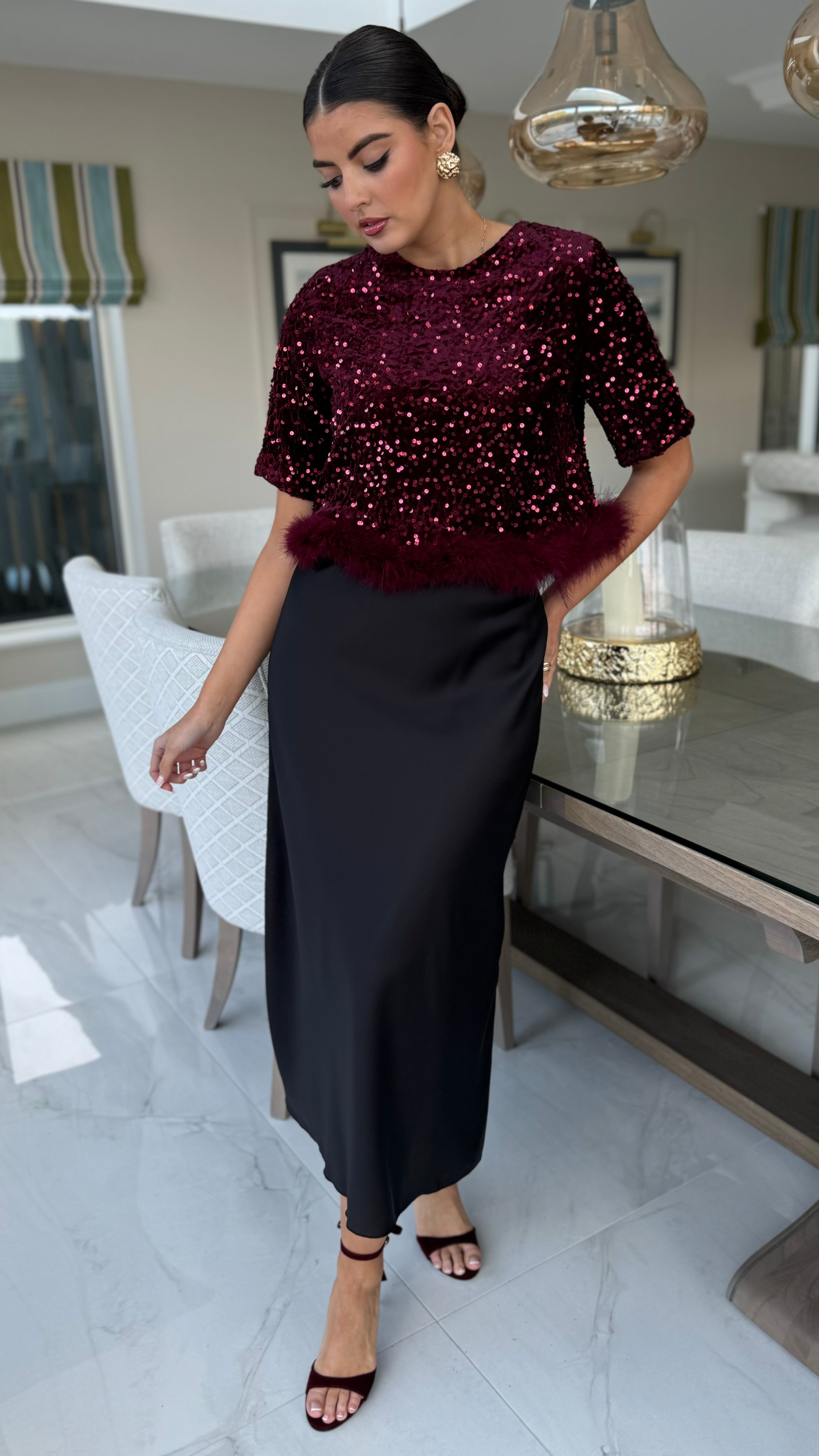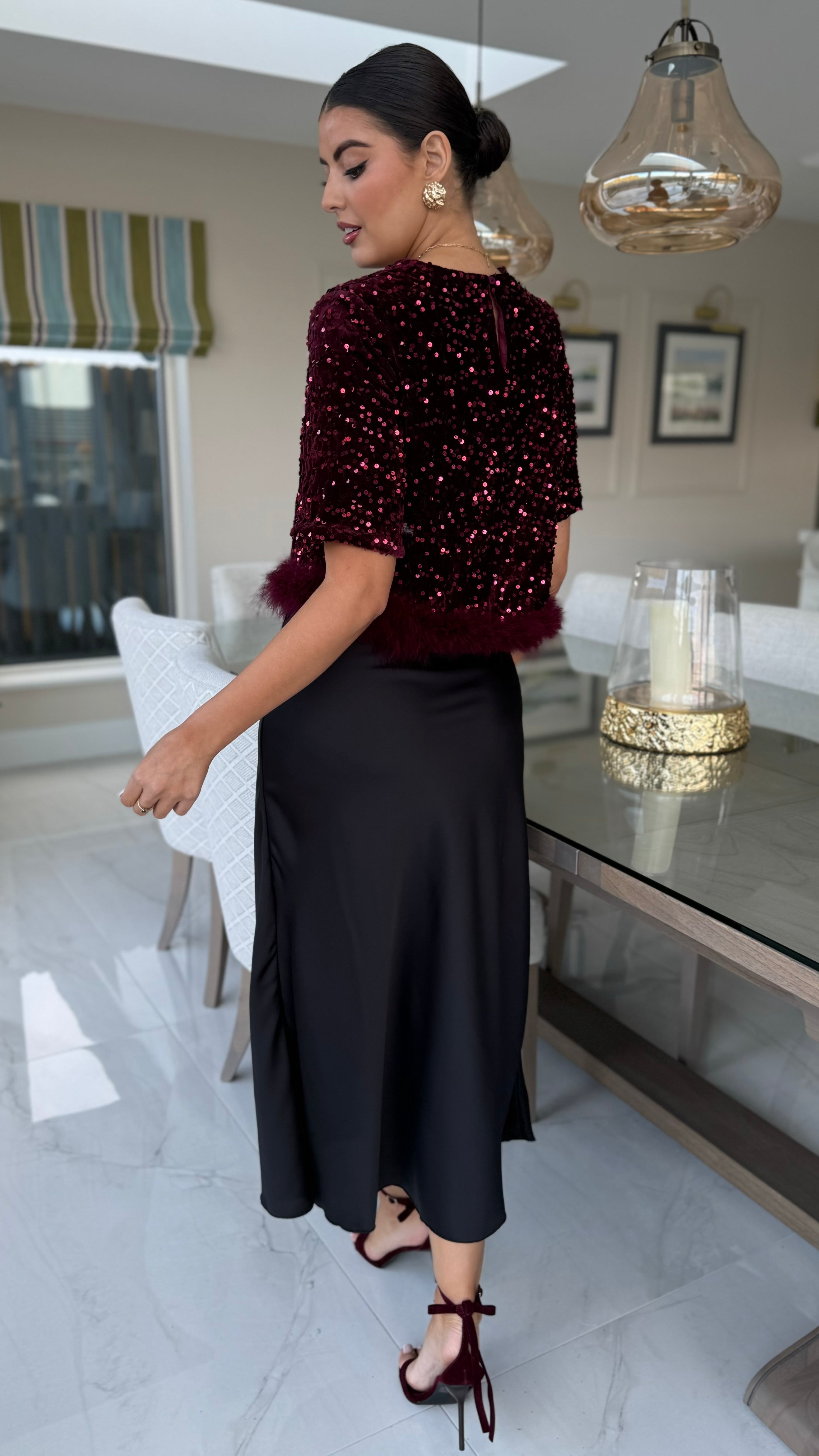 Elevate your evening look with this show-stopping burgundy sequin top! Featuring a chic round neckline and relaxed half-length sleeves, it's the perfect balance of glam and comfort. The luxe faux fur hem adds a touch of sophistication, while the discreet back zip makes dressing effortless. Whether you're heading to a party or a night out, this piece delivers serious sparkle with an undeniable edge.