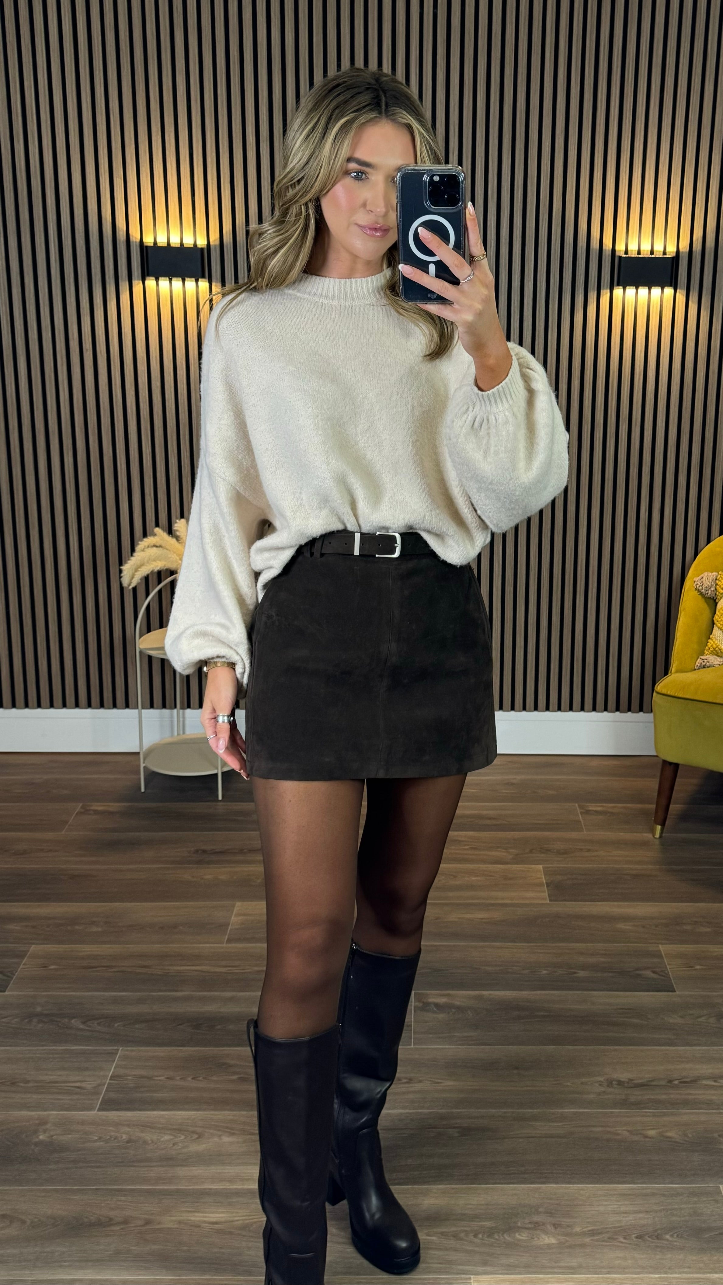 Step out in style with the Gwyneth Chocolate Brown Belted Mini Skirt. Crafted from soft suede, this playful mini features a flattering belt with shiny silver hardware and handy pockets for a touch of practicality. Perfect for adding a chic edge to any outfit while keeping things fun and flirty.