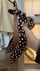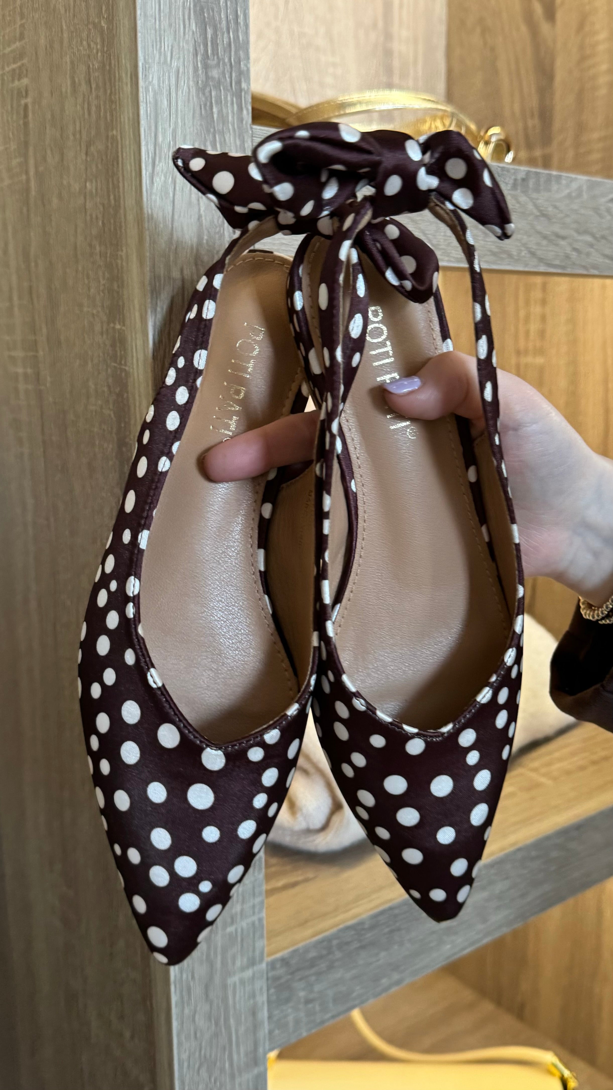 Elegant brown ballet flats with a playful polka dot pattern and distinctive pointy toe silhouette. Features an open back design with a delicate tie closure at the ankle for a secure, adjustable fit. Perfect for adding a touch of refined style to everyday wear or dressier occasions. Crafted for comfort and versatility, these flats transition seamlessly from day to night.