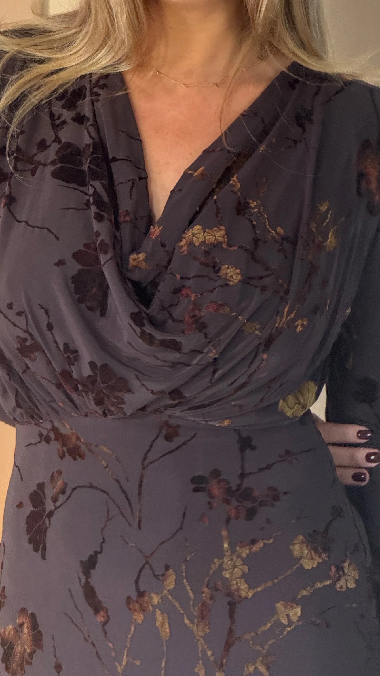 Havana Brown Floral Embossed Cowl Neck Midi Dress (PRE-ORDER)