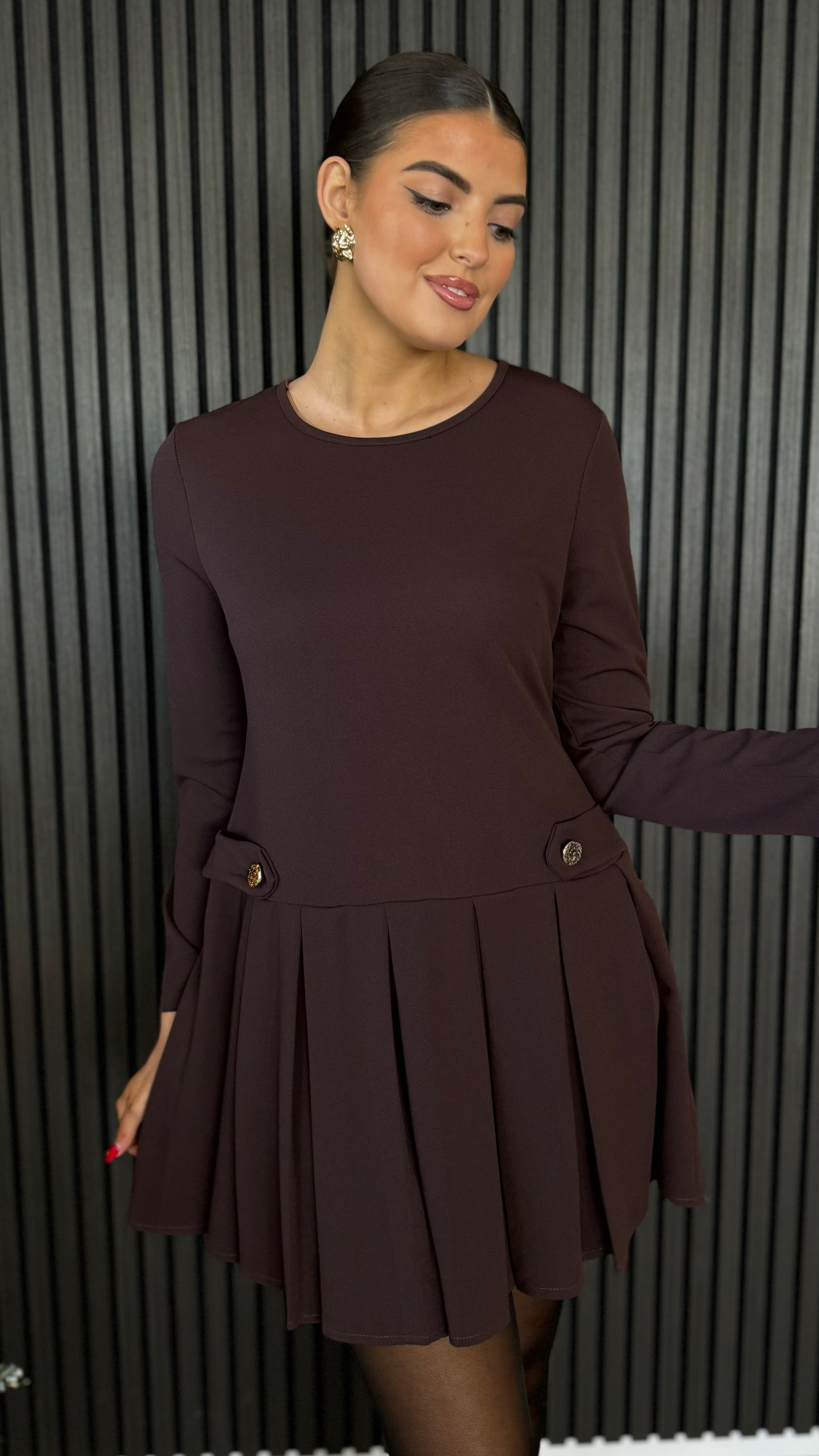 Elevate your everyday style with the Hendrix Brown Pleated Detail Mini Dress—a playful piece that effortlessly blends comfort with charm. Featuring a classic round neckline and cozy long sleeves, this dress wraps you in soft, touchable fabric that feels as good as it looks. The standout pleated skirt detail adds movement and dimension, while delicate button accents bring a touch of vintage-inspired flair. Perfect for casual outings or dressed-up occasions, this versatile mini dress is your new go-to for looking put-together without the fuss.