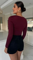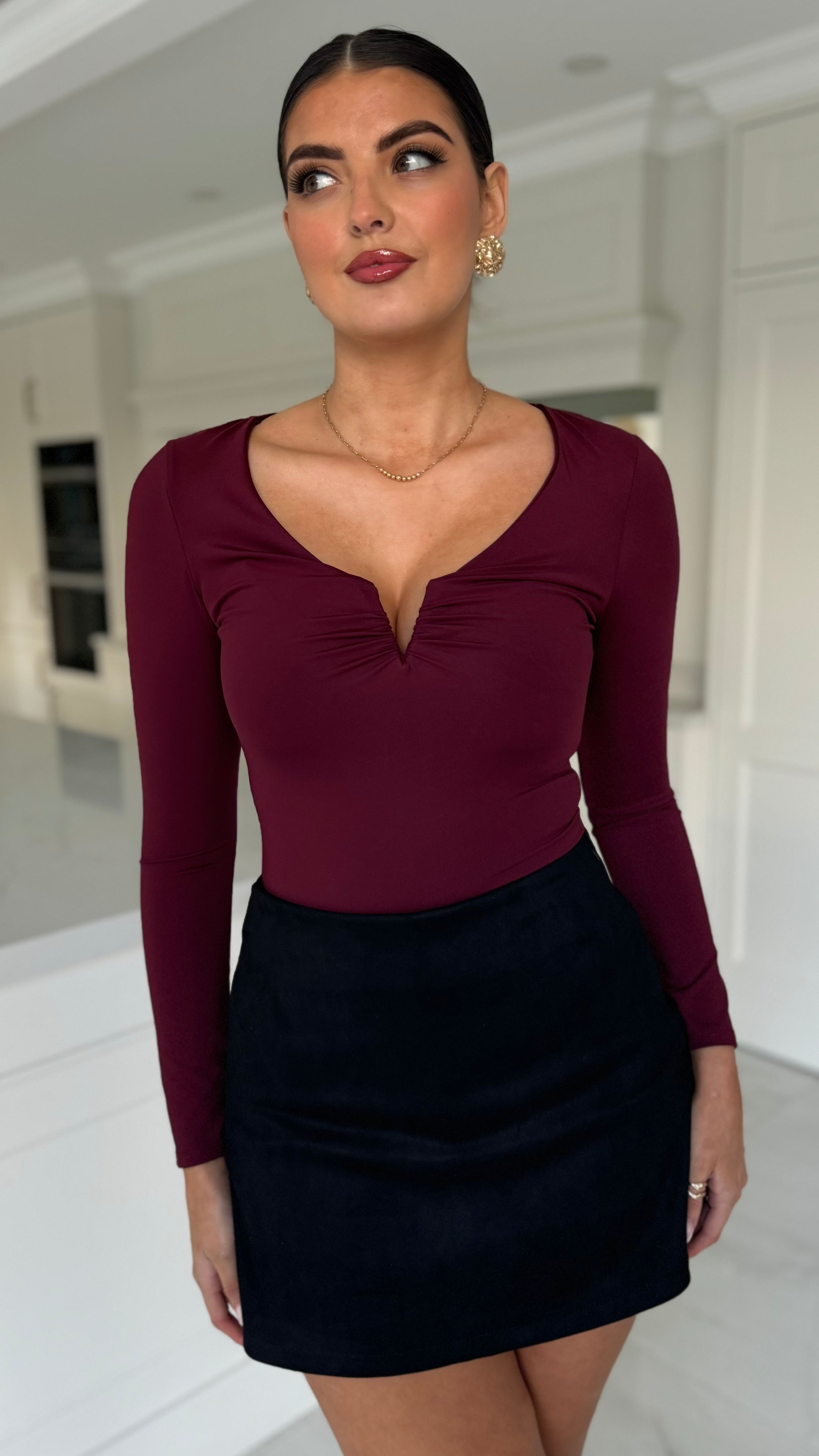Elevate your everyday wardrobe with the Holland Burgundy V Neck Bodysuit—a cheeky essential that hugs you in all the right ways. Featuring a flattering scoop and V neckline with strategic ruching at the bust, this piece is designed to celebrate your silhouette. Slip into the soft, stretchy fabric and secure it with the convenient clasp fastening. Long sleeves keep things polished while the figure-hugging fit works overtime. Whether you're dressing it up or keeping it casual, this burgundy beauty is your new go-to for looking effortlessly put-together.