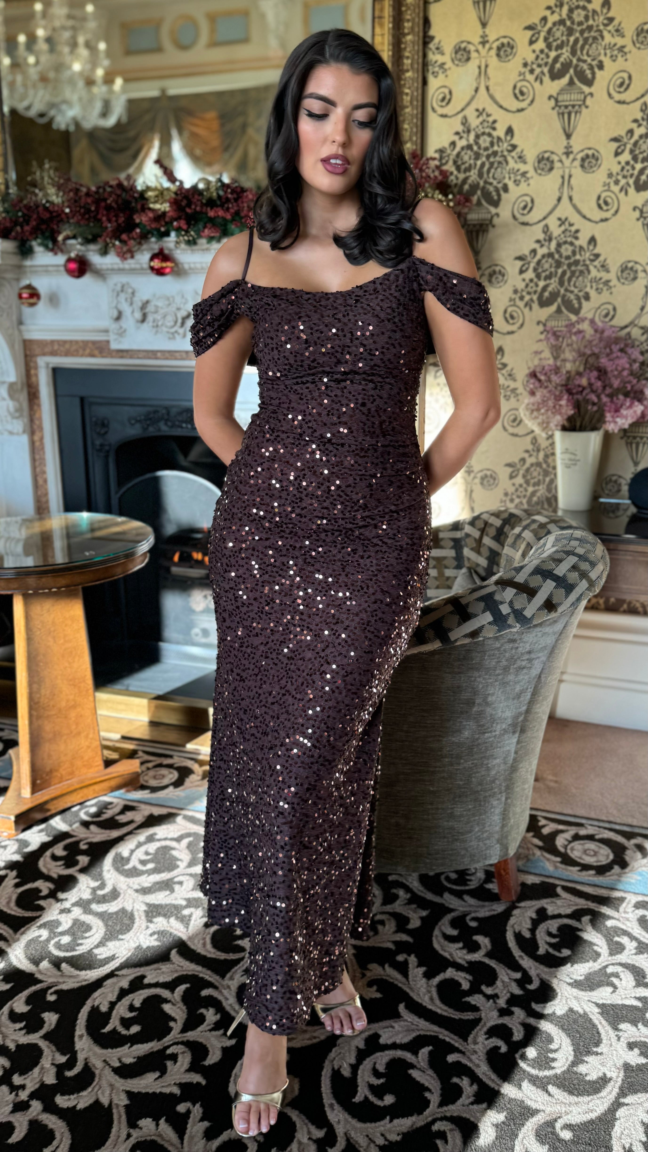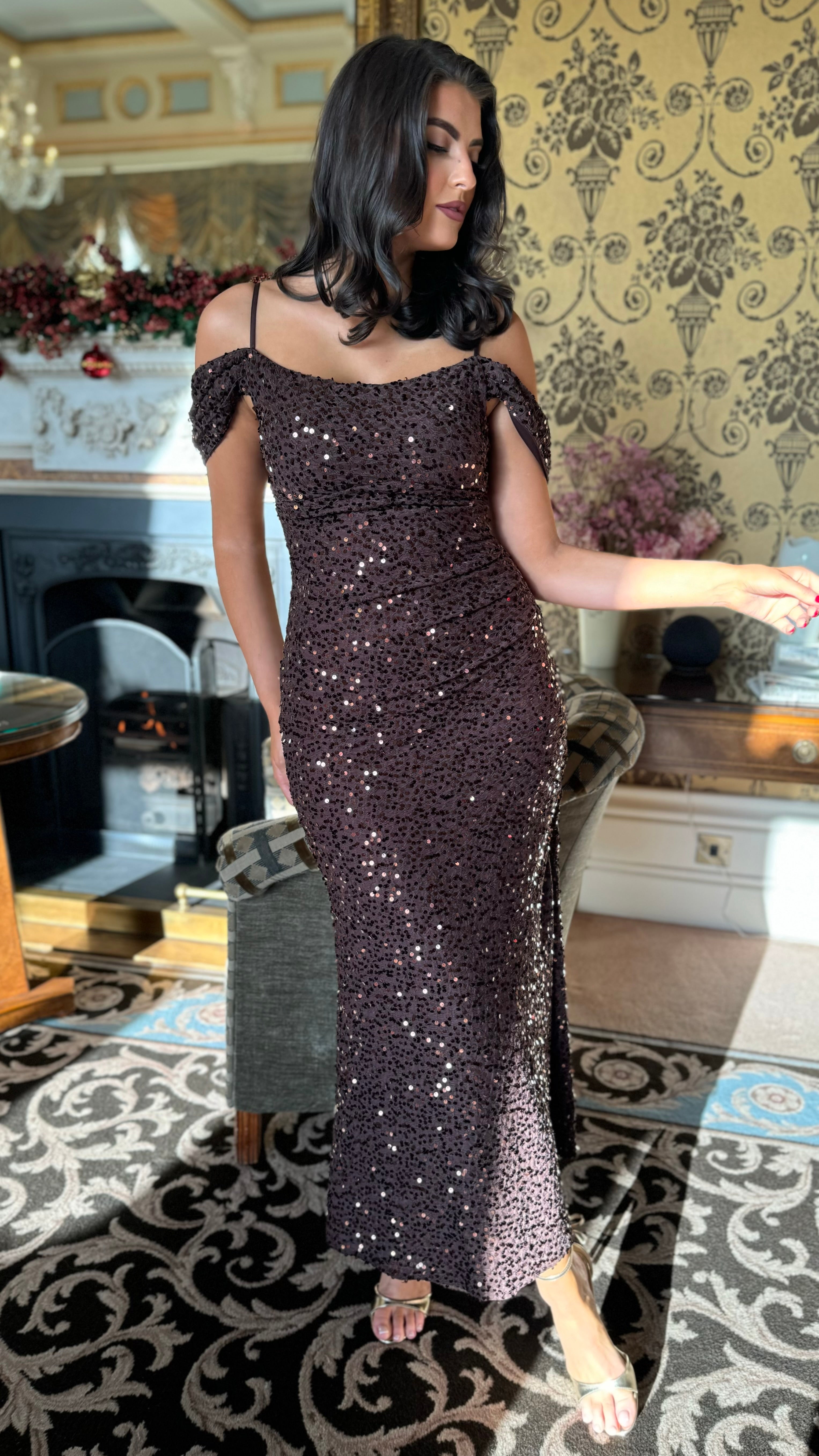 Indiana Brown Sequin Drop Sleeve Maxi Dress (PRE ORDER)
