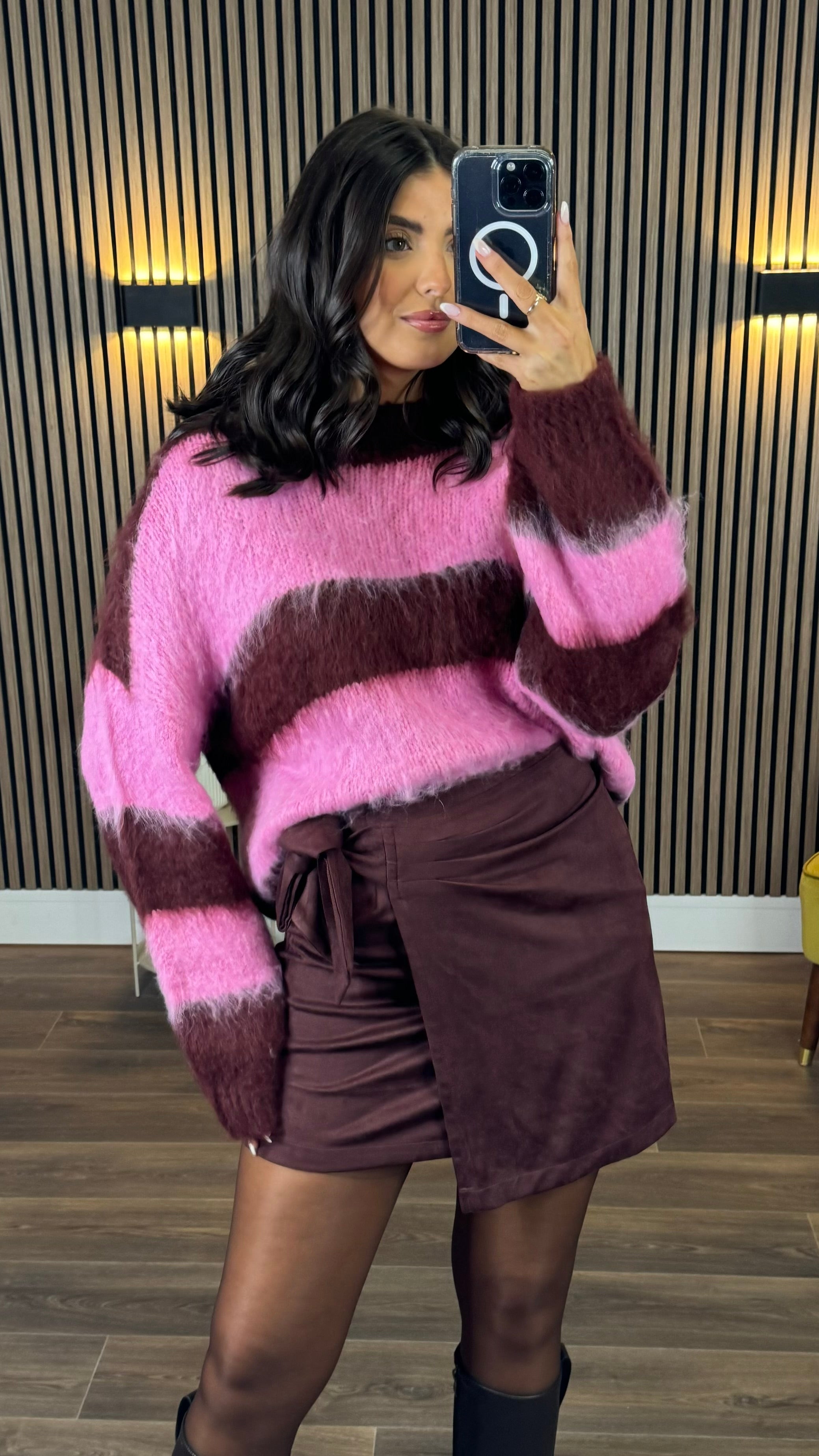Elevate your wardrobe with this gorgeous burgundy suede skirt that's equal parts chic and fun. Featuring a flattering wrap style with a charming side bow tie, this piece brings effortless elegance to any outfit. The luxurious suede fabric drapes beautifully while the ruched detailing adds texture and dimension for a modern silhouette. Perfect for dressing up or down, this skirt is your new go-to for looking polished with personality.