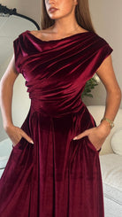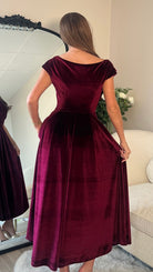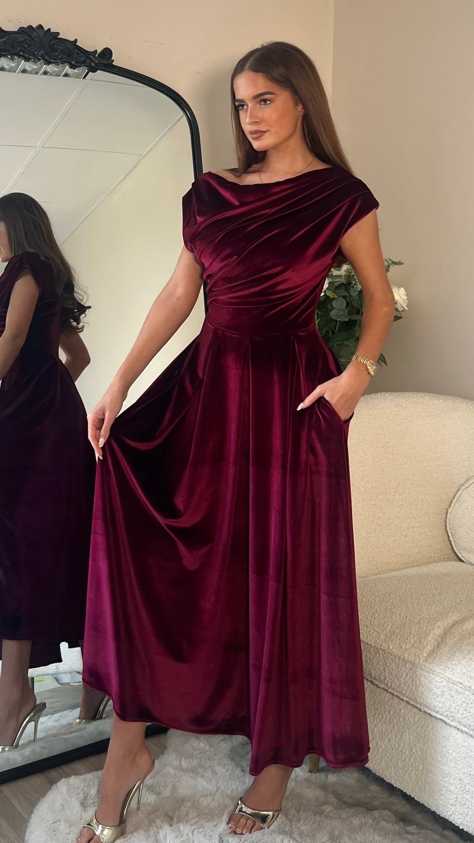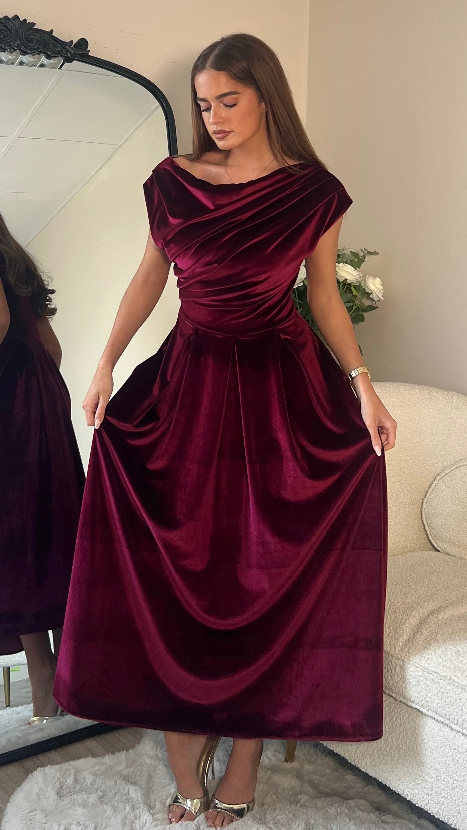 Jezebel Burgundy Velvet Asymmetric Neck Skater Dress (PRE-ORDER)