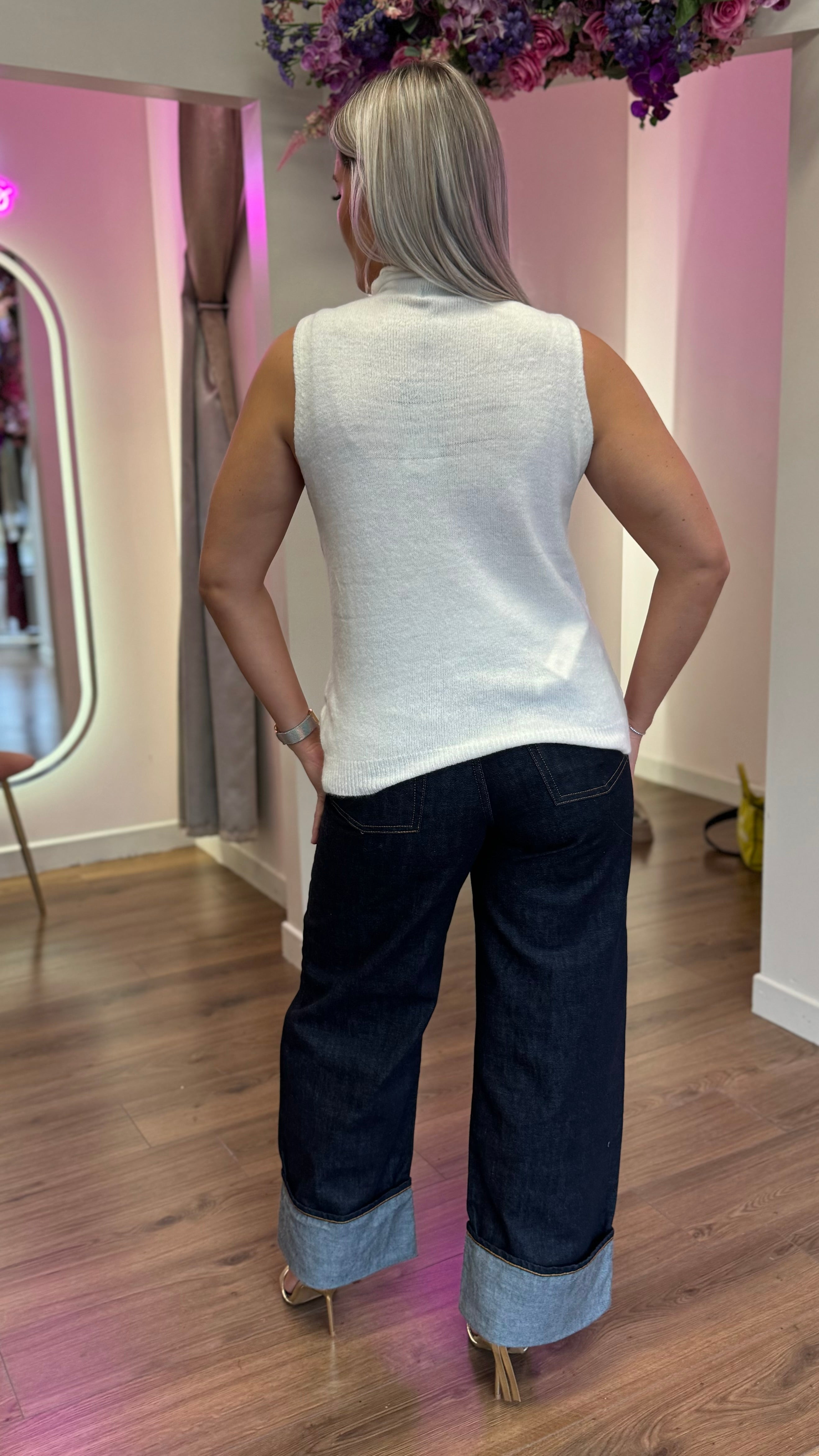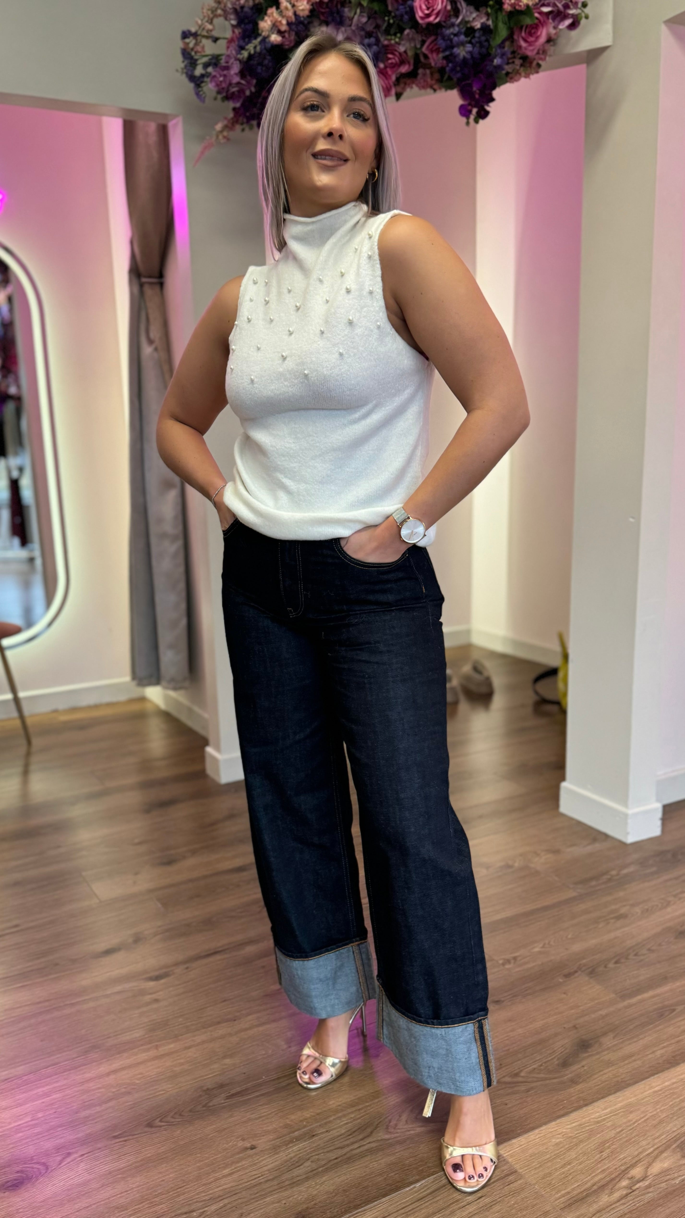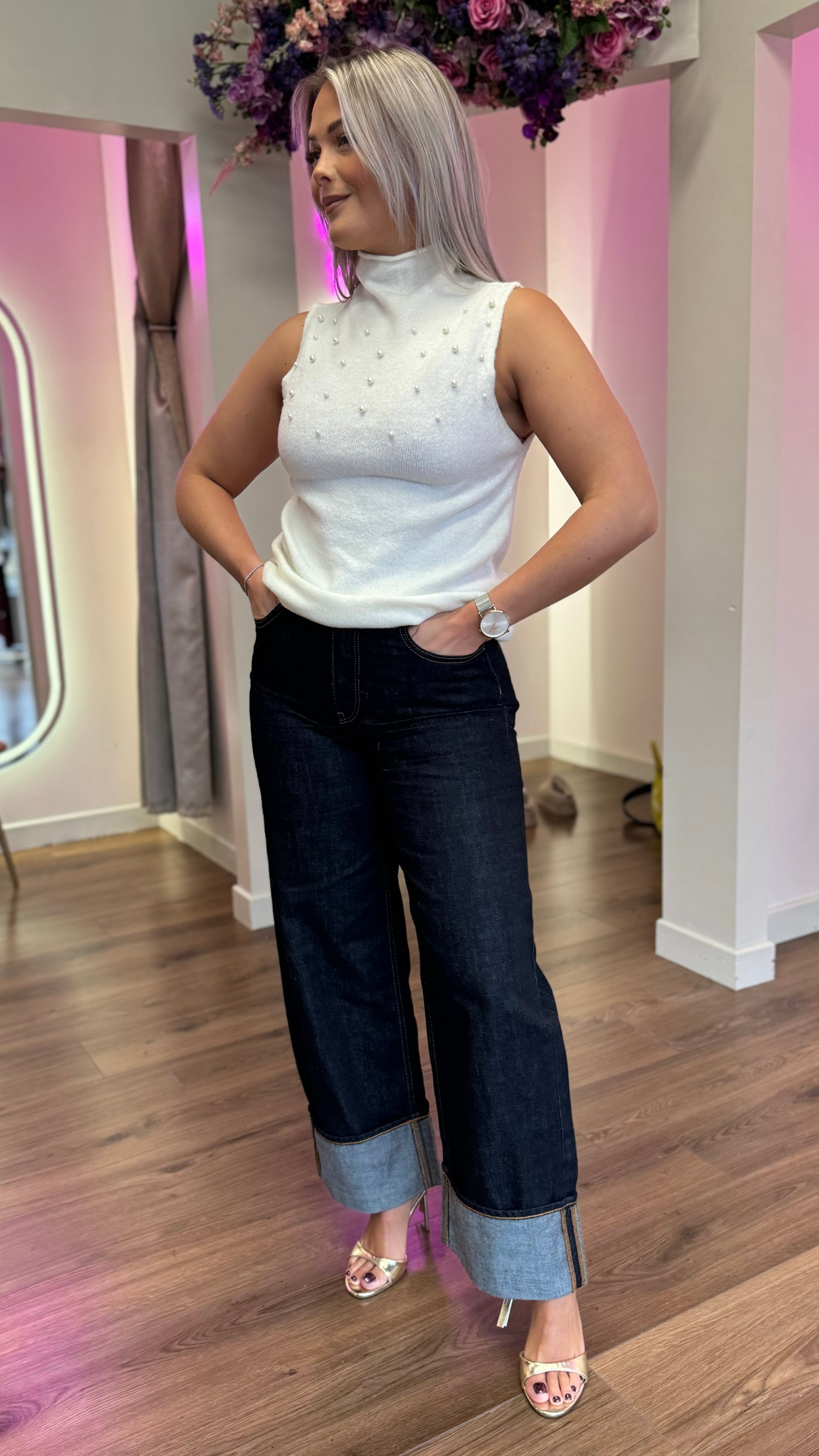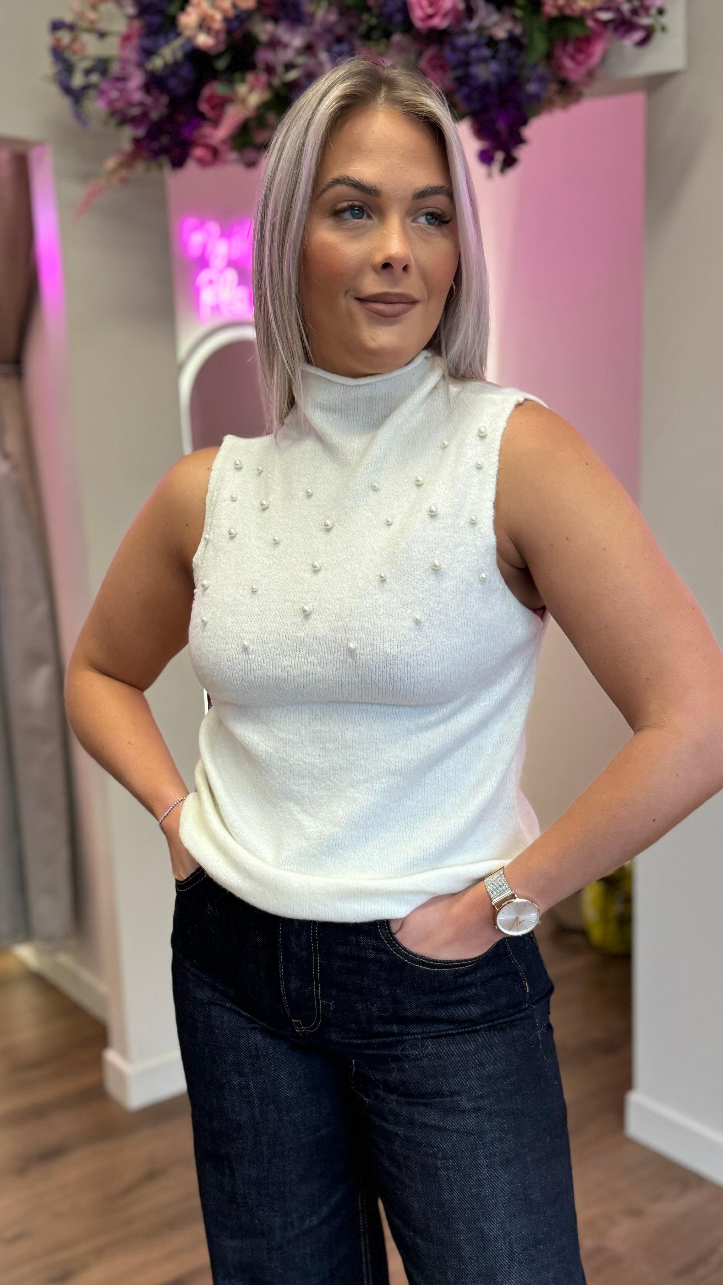 Kathryn Cream Pearl Embellished High Neck Knit Vest