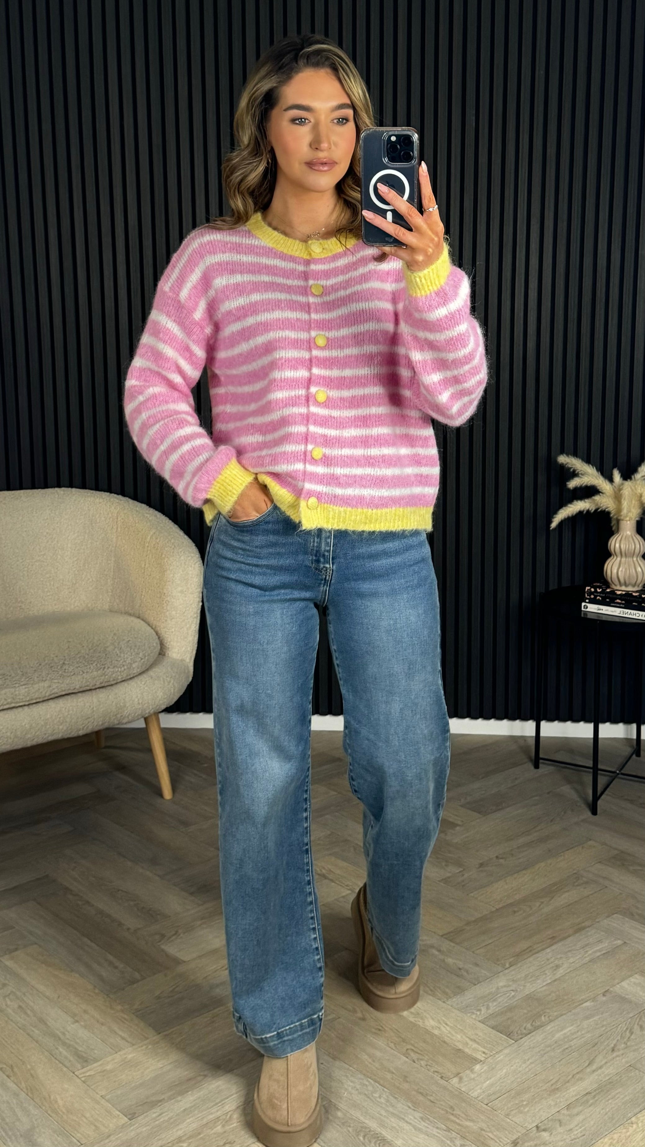 Wrap yourself in comfort with the Kaylee Pink & Yellow Stripe Cardigan—a playful layer that brings warmth and style together. Featuring soft, cosy fabric that feels like a gentle hug, this cardigan boasts self-covered buttons for a polished finish. The cheerful yellow contrast detailing on the neck and cuffs adds a pop of personality to the classic pink and yellow stripes. Perfect for those moments when you want to feel snug without sacrificing style.
