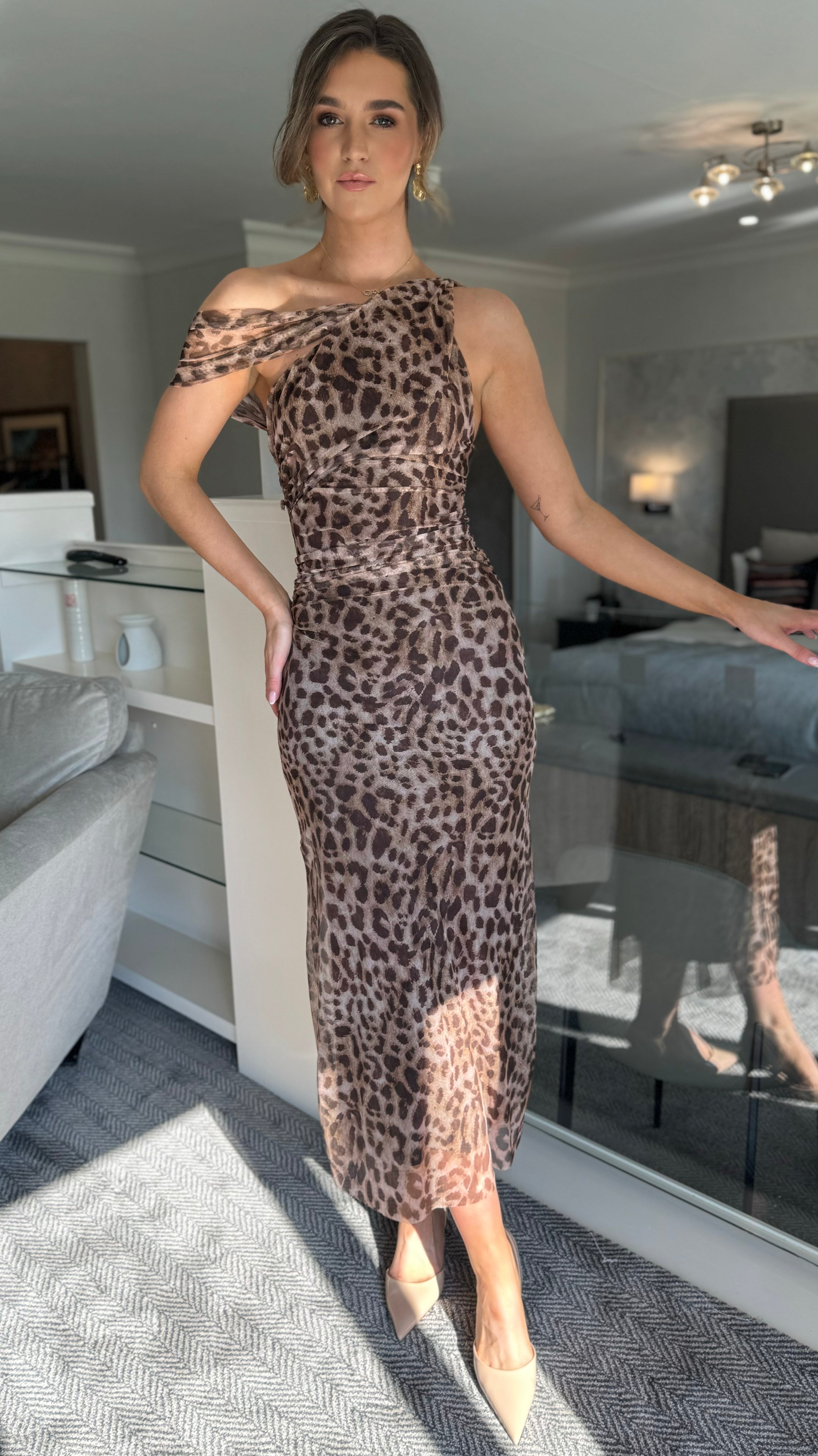 Keegan Beige & Brown Leopard Printed Strap Detail Midi Dress