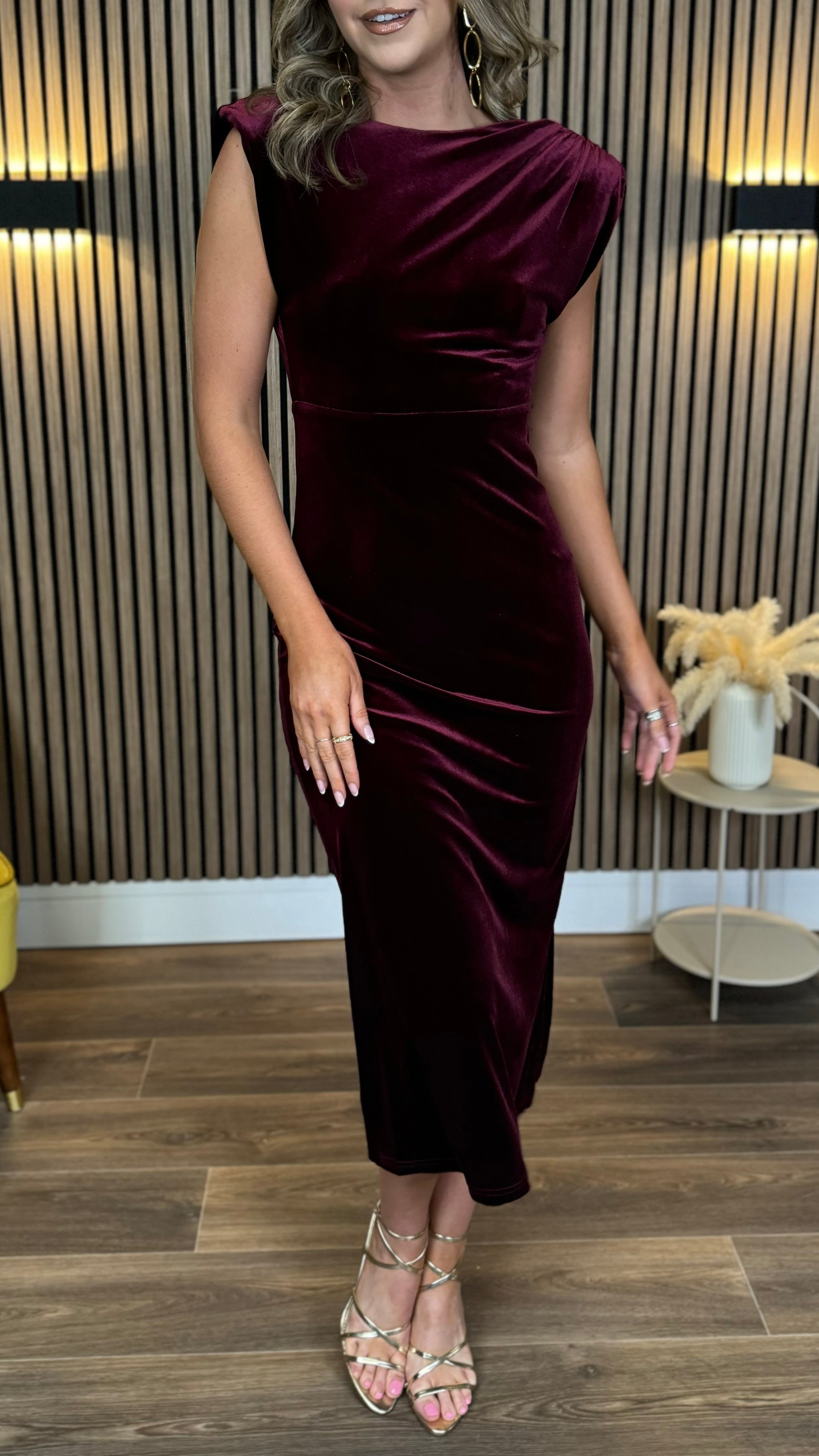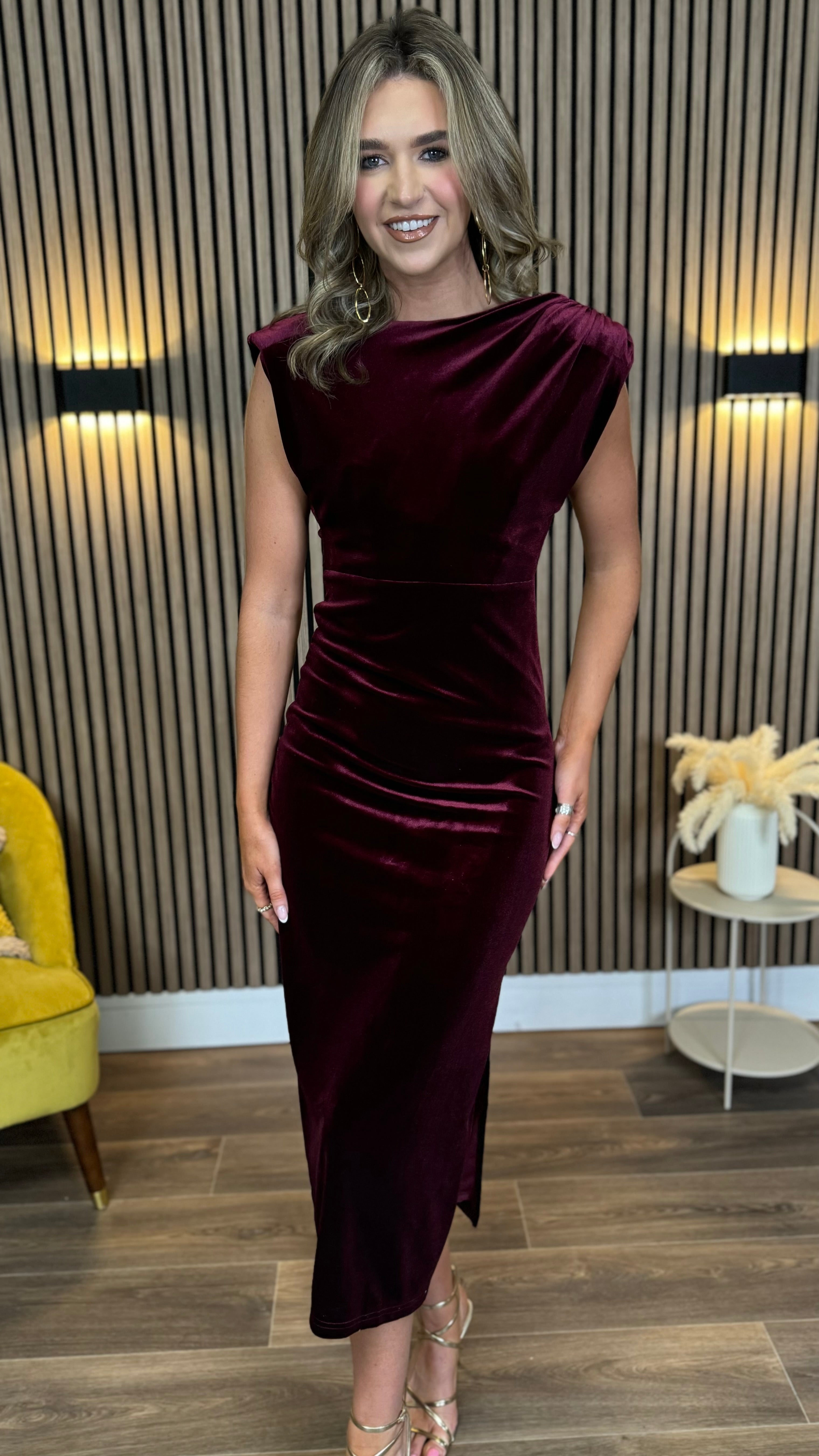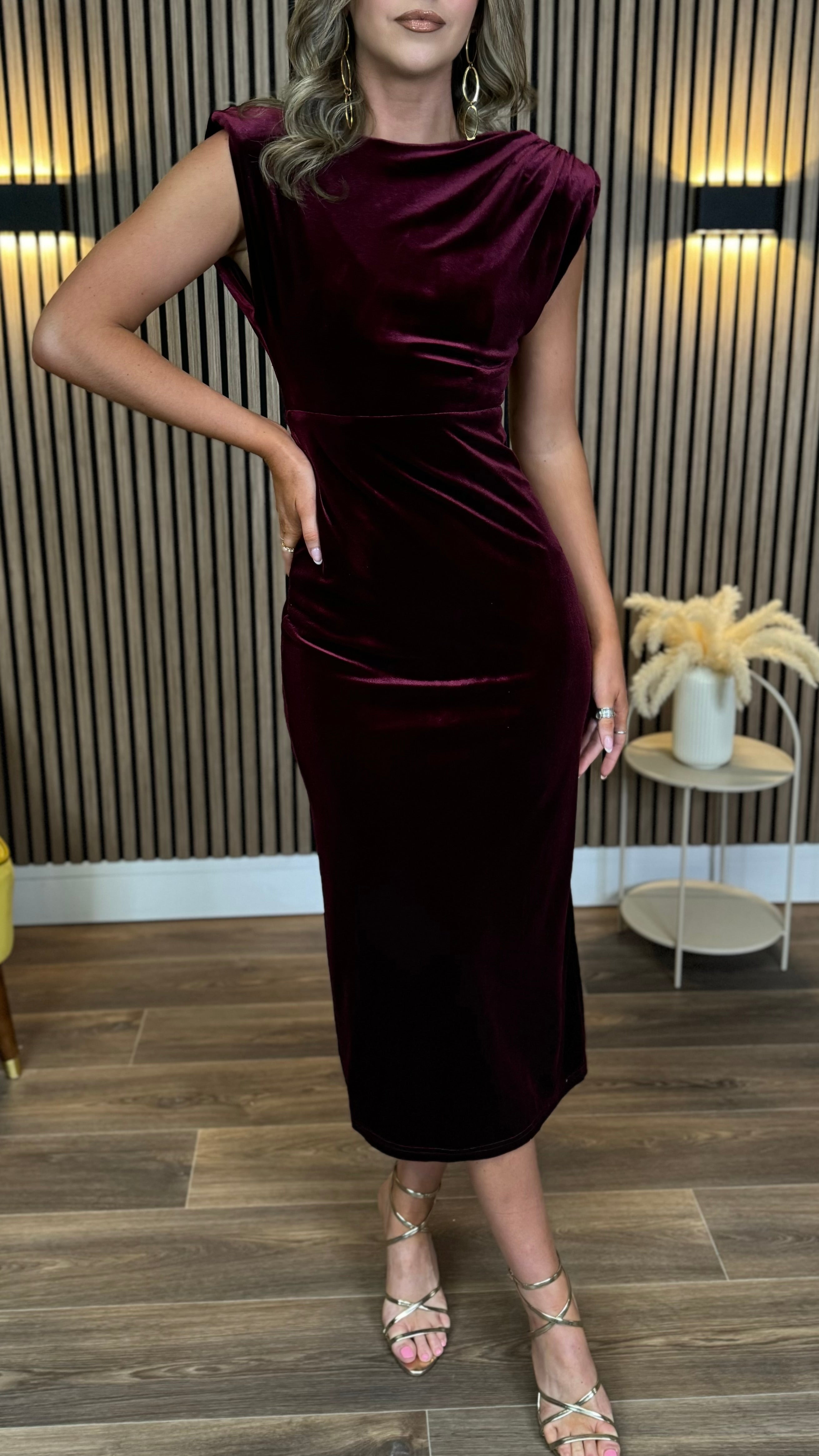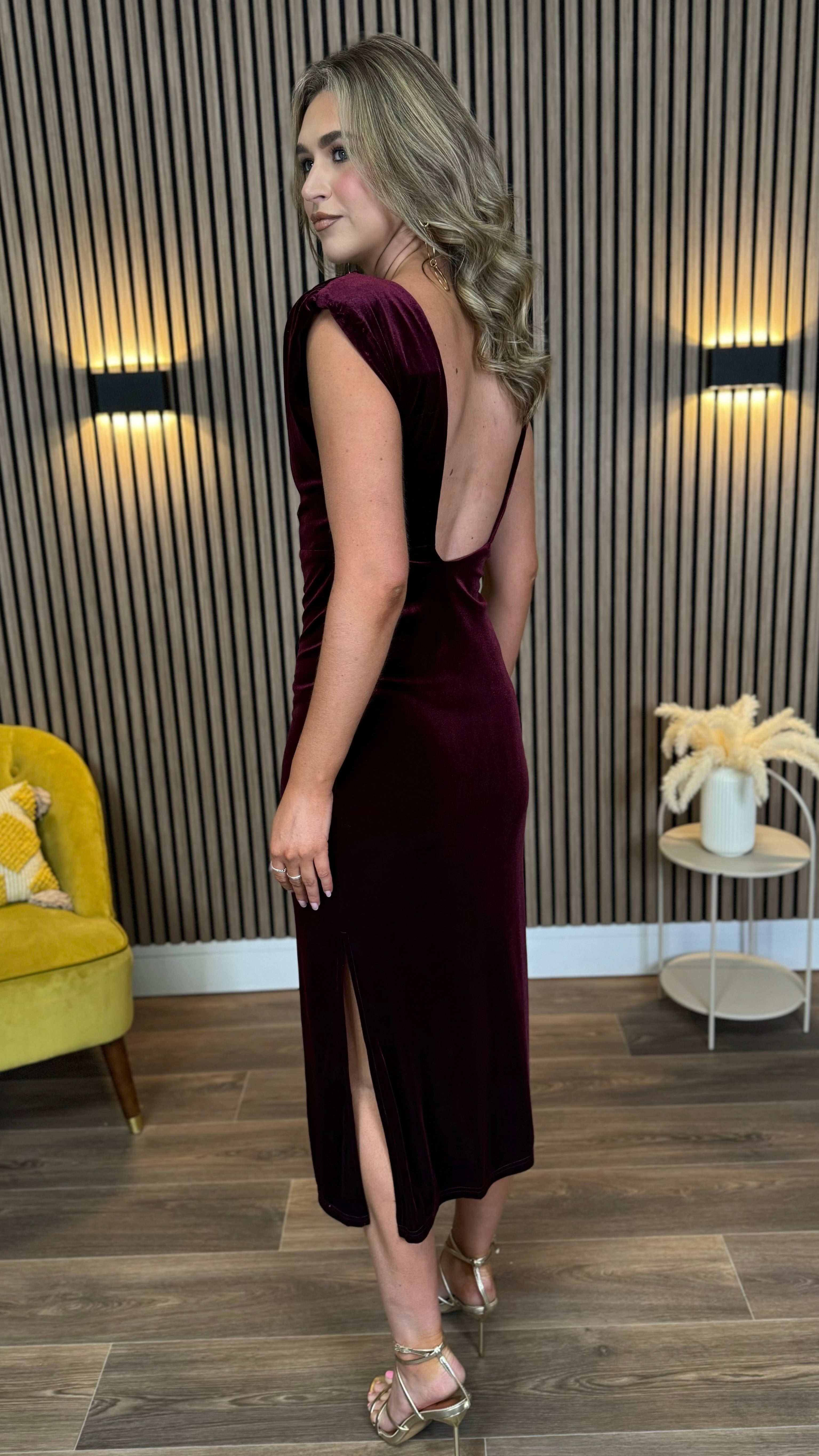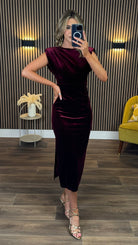 This Kimberley Burgundy Velvet Midi Dress is a playful mix of elegance and comfort. Featuring flirty cap sleeves and a ruched bodice that flatters your figure, it’s finished with an open back for a touch of allure. The elasticated waistband ensures a perfect fit, while the slit at the back adds a dash of drama and ease of movement. Perfect for turning heads at any event!