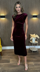 Kimberley Burgundy Velvet Cap Sleeve Ruched Midi Dress