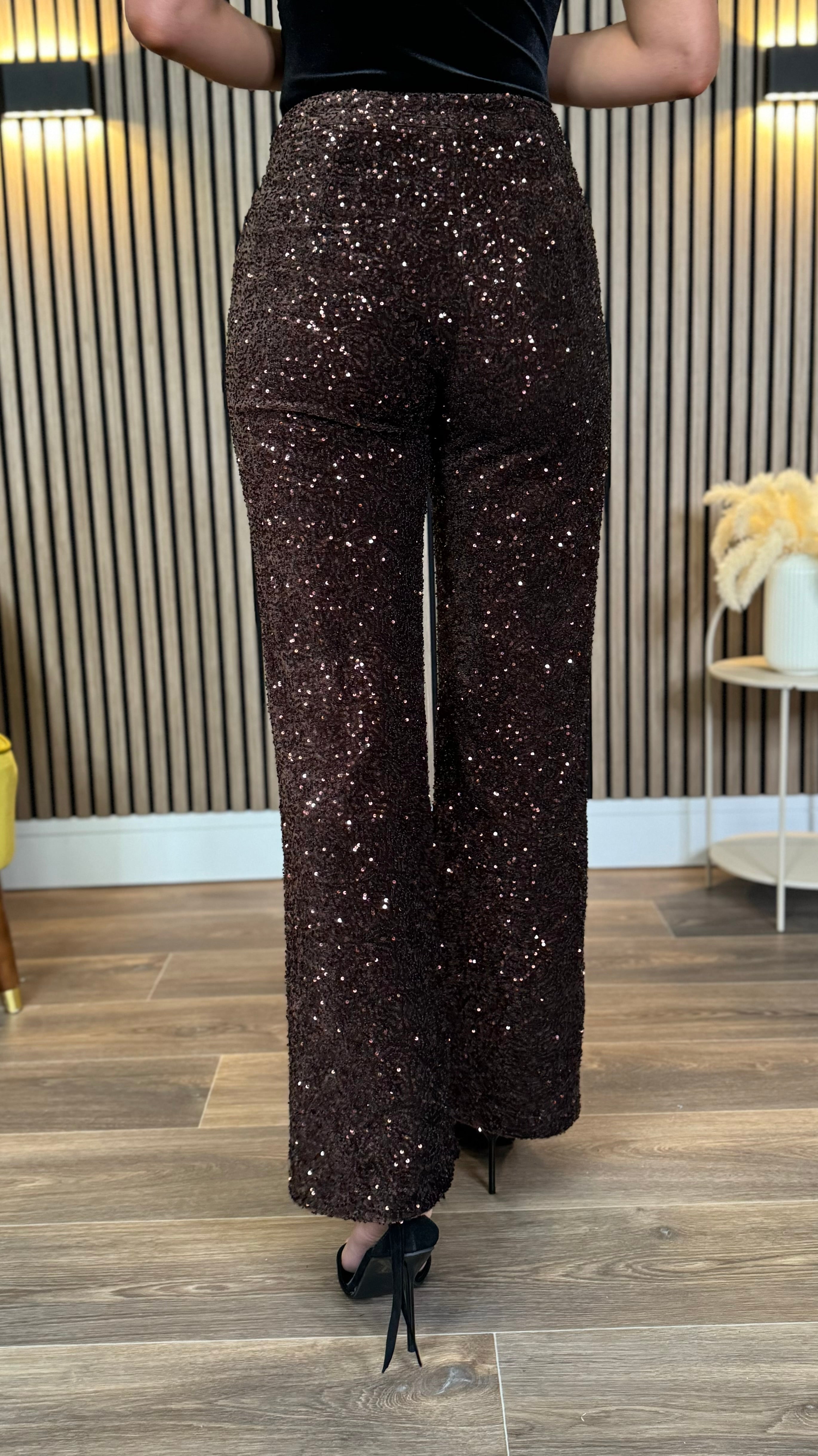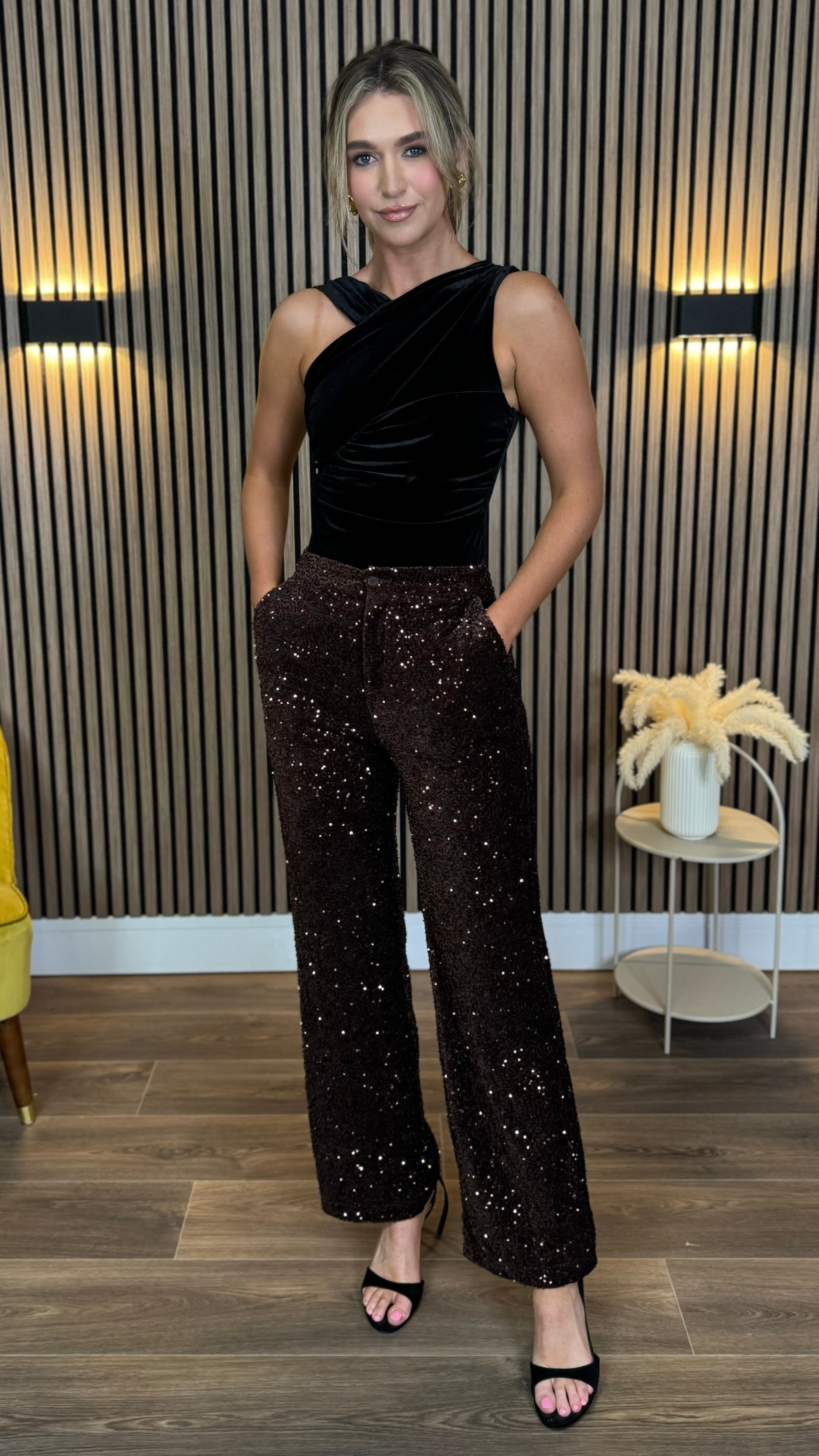 These Labhaoise Brown Velvet Sequin Trousers bring a playful twist to your wardrobe with their high-waisted design and sleek black button detail. Featuring handy front pockets and a straight fit, they combine comfort with style effortlessly. Perfect for adding a sparkling touch while keeping things chic and fun!