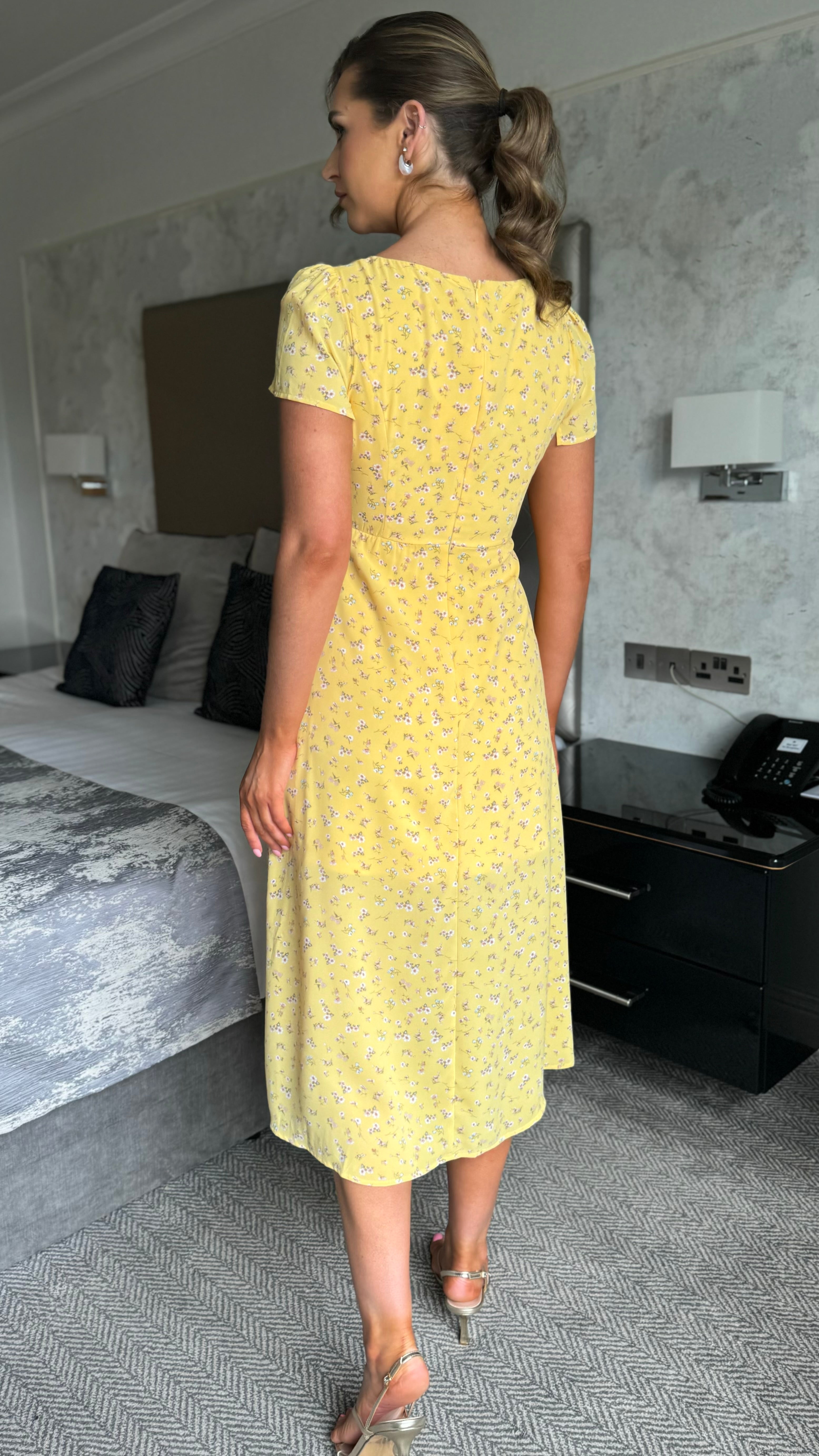 Laura Yellow Floral Print Sweetheart Midi Dress