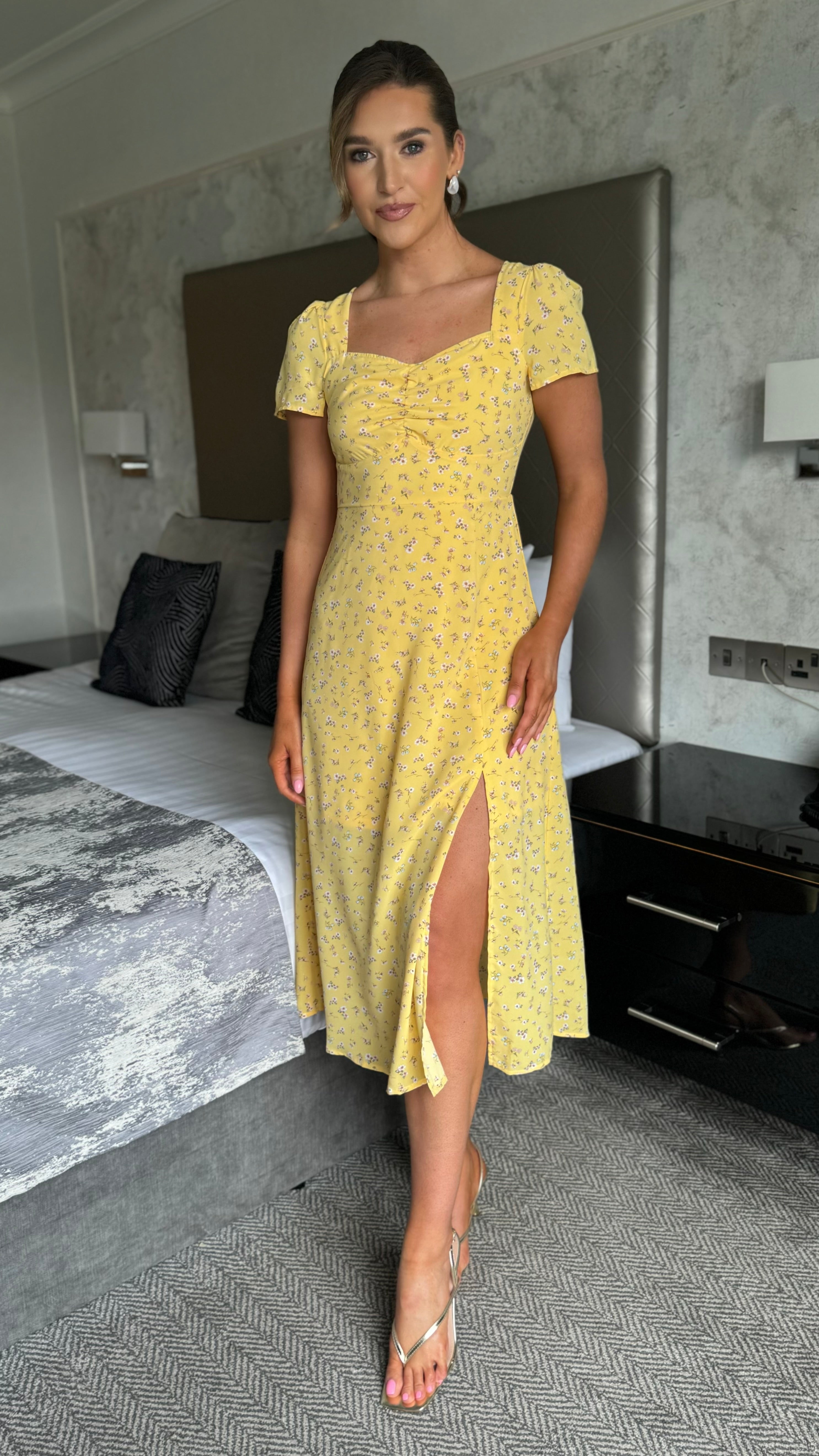 Elegant midi dress in a vibrant yellow floral print, designed with a flattering sweetheart neckline that frames the shoulders beautifully. Ruched detailing at the bust creates a sculpted, feminine silhouette while the front slit adds movement and contemporary edge. Concealed zip fastening ensures a seamless, polished finish. Perfect for occasions that call for understated sophistication with a touch of botanical charm.