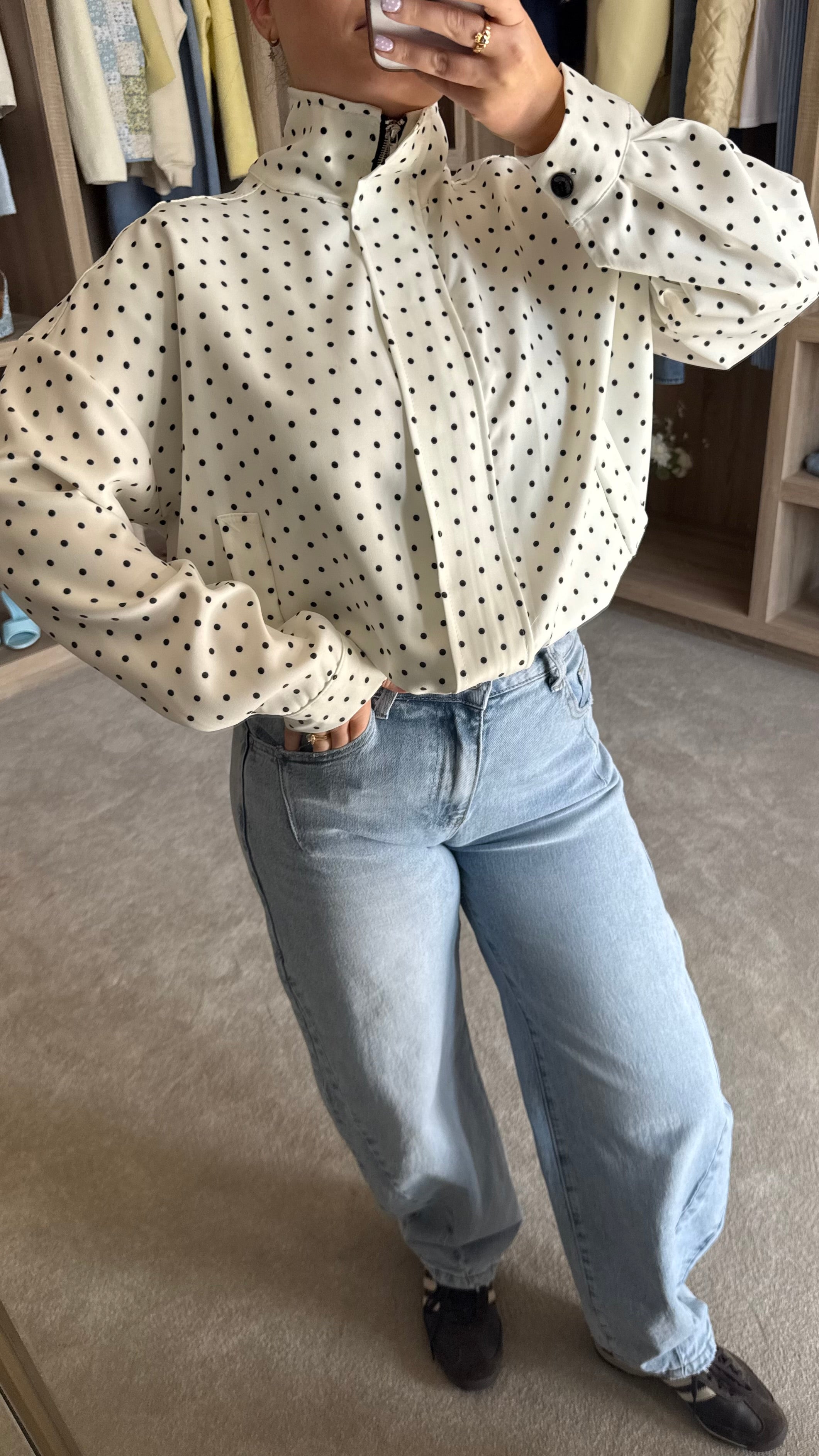 Effortless layering meets playful style with the Lexi White Polka Dot Jacket. Designed with a classic collar detail and smooth zip-up front for easy on-and-off wear, this lightweight piece transitions seamlessly from day to evening. The adjustable drawstring waist lets you customize the fit, creating a flattering silhouette whether worn loose or cinched. Perfect for layering over dresses or pairing with co-ords, the Lexi brings contemporary polish to any wardrobe.