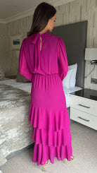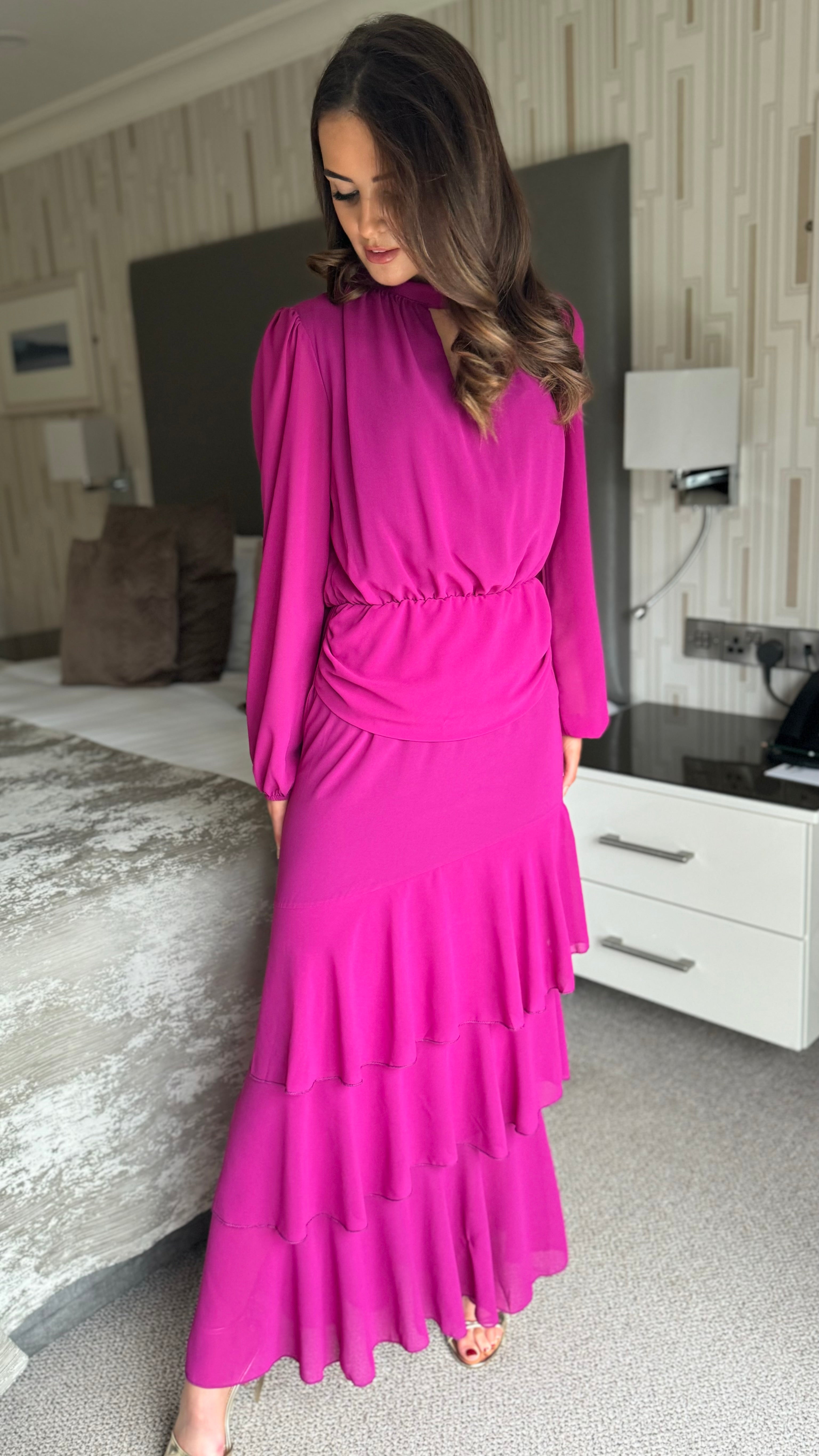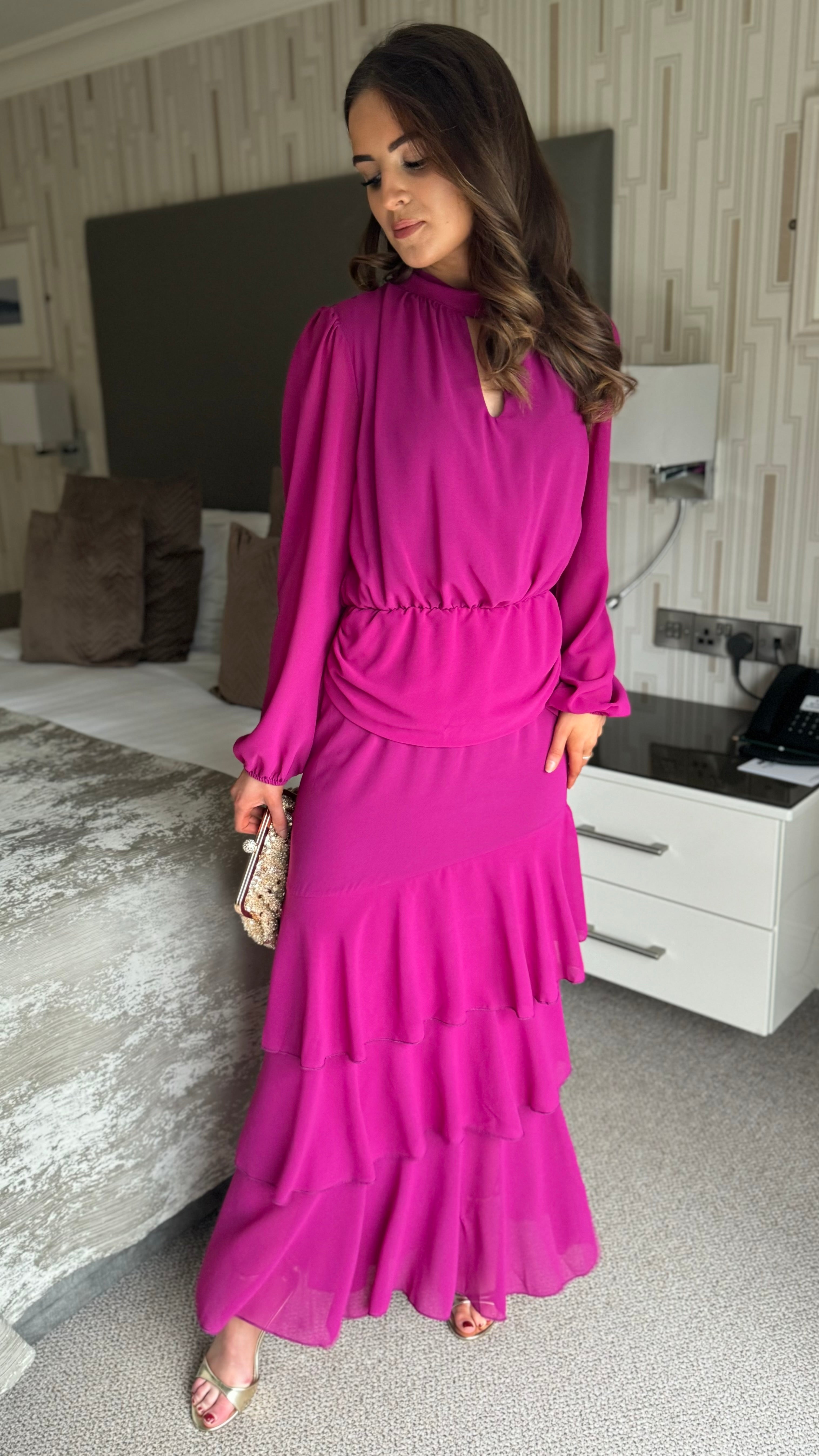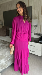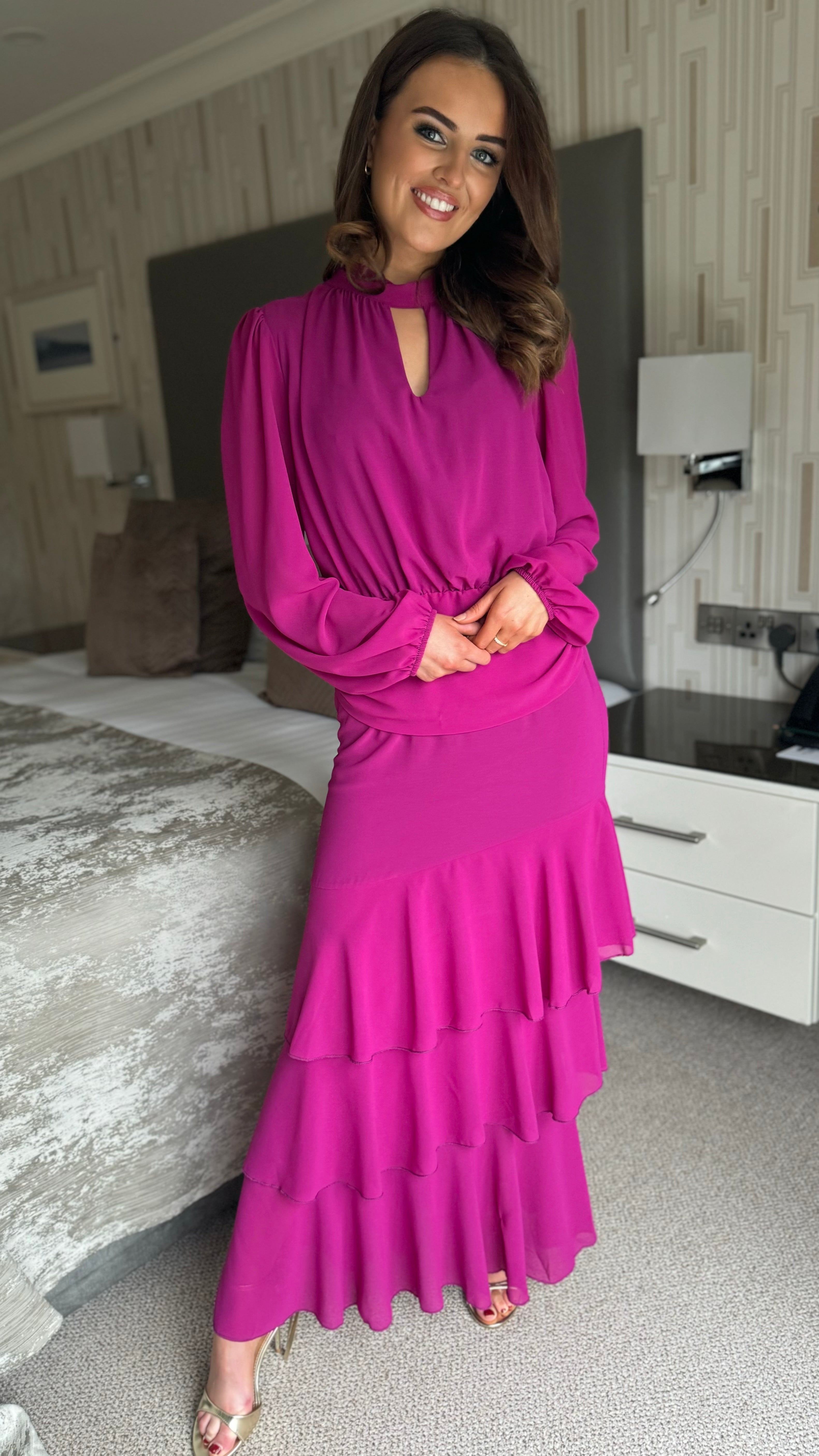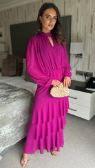 Effortless elegance meets fun with this purple chiffon dress. The keyhole neckline adds a flirty touch, while the ruffled details bring movement and personality to every wear. Elasticated waistband and cuffs ensure a comfortable, flattering fit that moves with you, and the adjustable ties at the back of the neck let you customize your look. Fully lined for confidence and comfort. Perfect for elevating your everyday style with a dash of playful sophistication.
