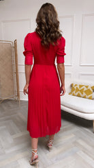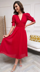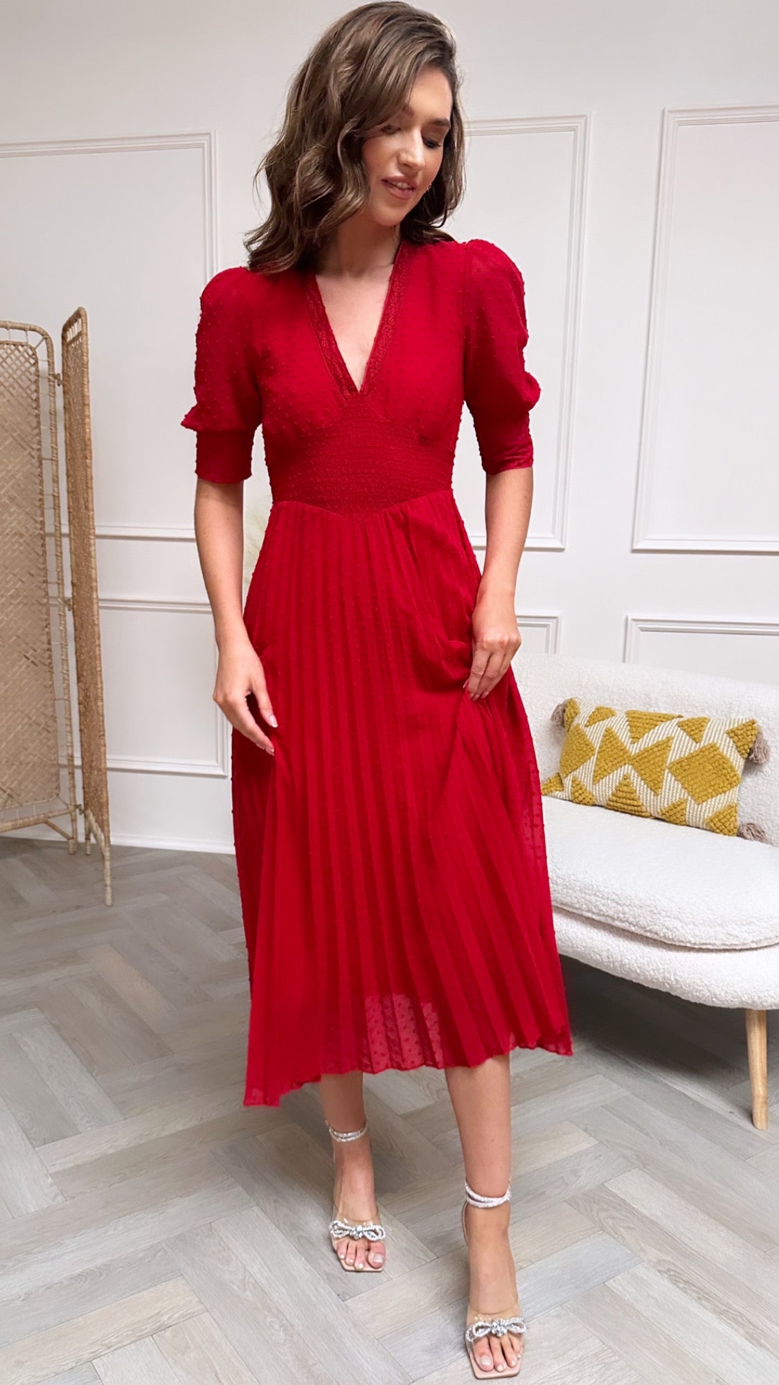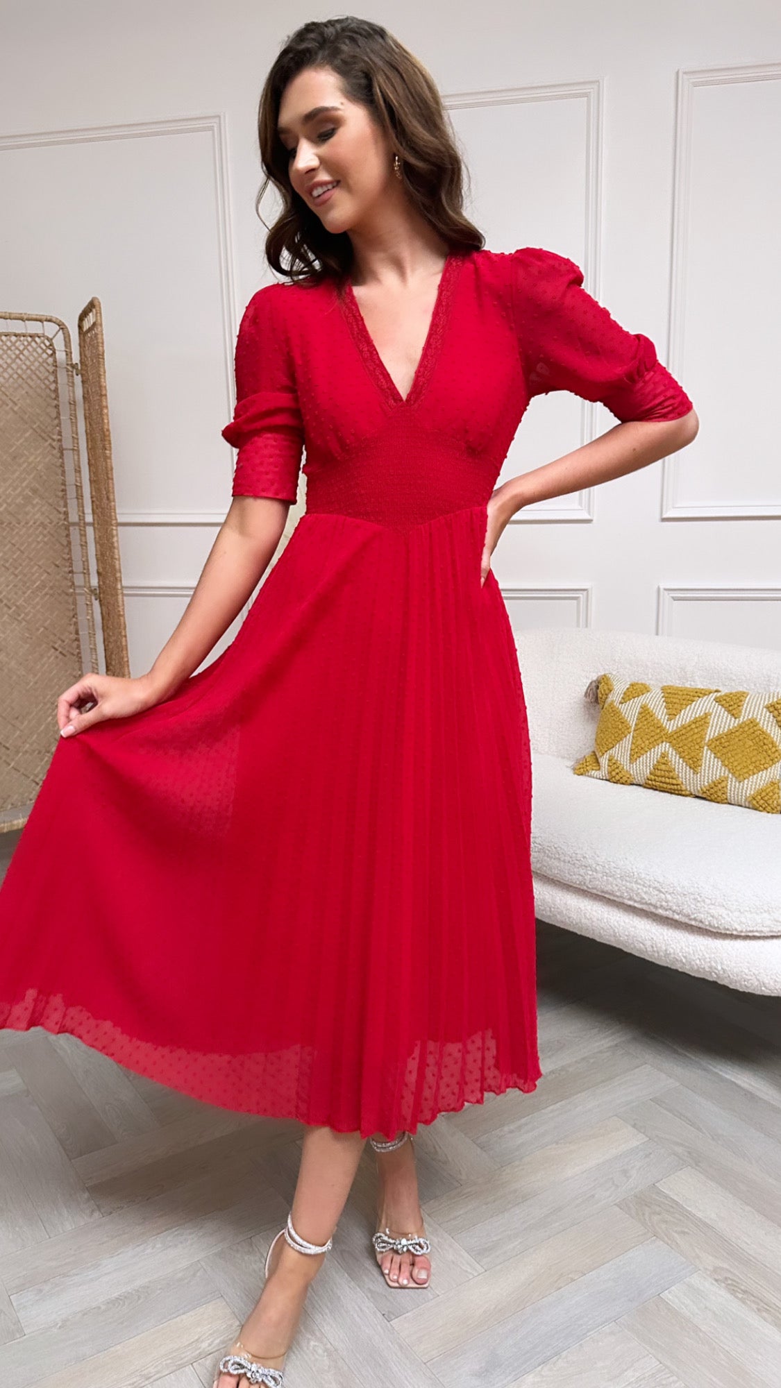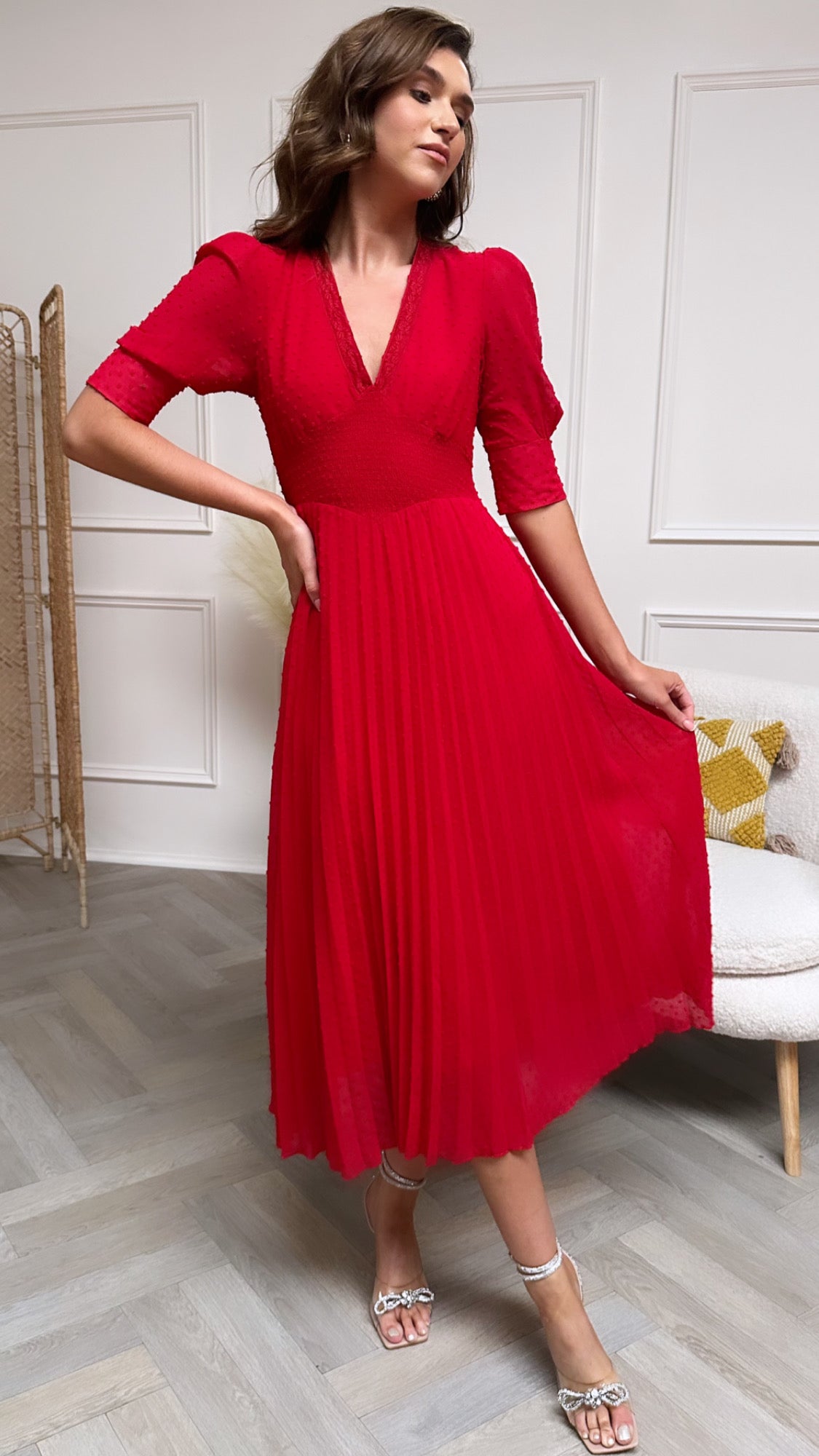 Introducing the Mariella Red Dobby Pleated Midi Dress—where comfort and style meet! Enjoy a pop of colour and look amazing in the pleated skirt and embroidered V neckline. With a flattering elasticated waist and 3/4 sleeves, you'll look as great as you feel! Plus, you don't have to worry about constantly adjusting the dress either; it comes with a concealed back zip to keep everything securely in place 👍