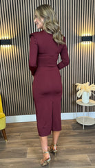 Turn heads in the Mary Burgundy & Gold Detail Ruched Midi Dress, designed to hug your curves with its fitted silhouette and stretchy fabric. The long sleeves and structured shoulder pads add a bold edge, while the asymmetric neckline and gold metallic detail bring a touch of glam. A playful front cross drape and ruching enhance the shape, and a back slit lets you move with confidence and flair. Perfect for making a stylish statement wherever you go!