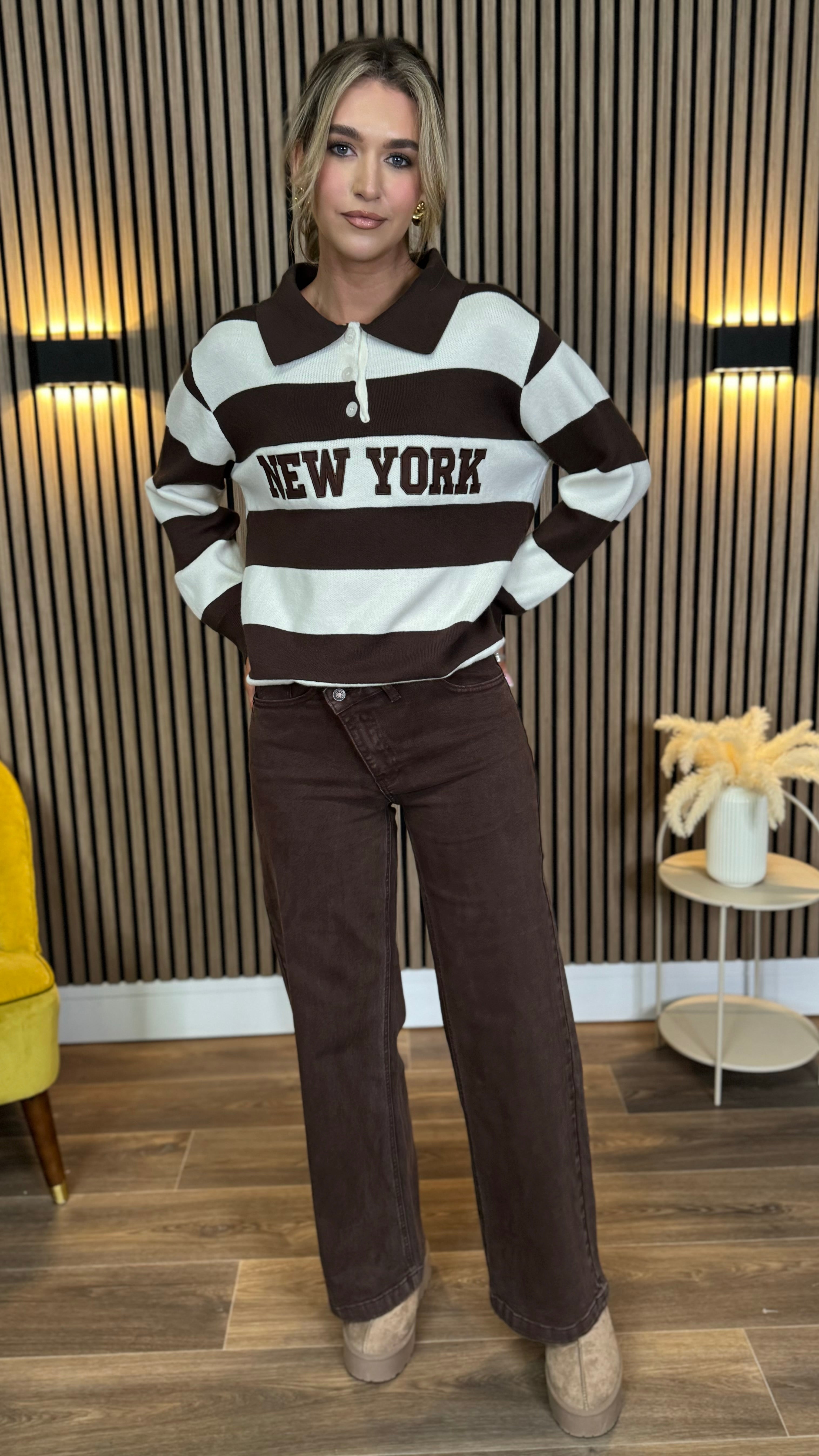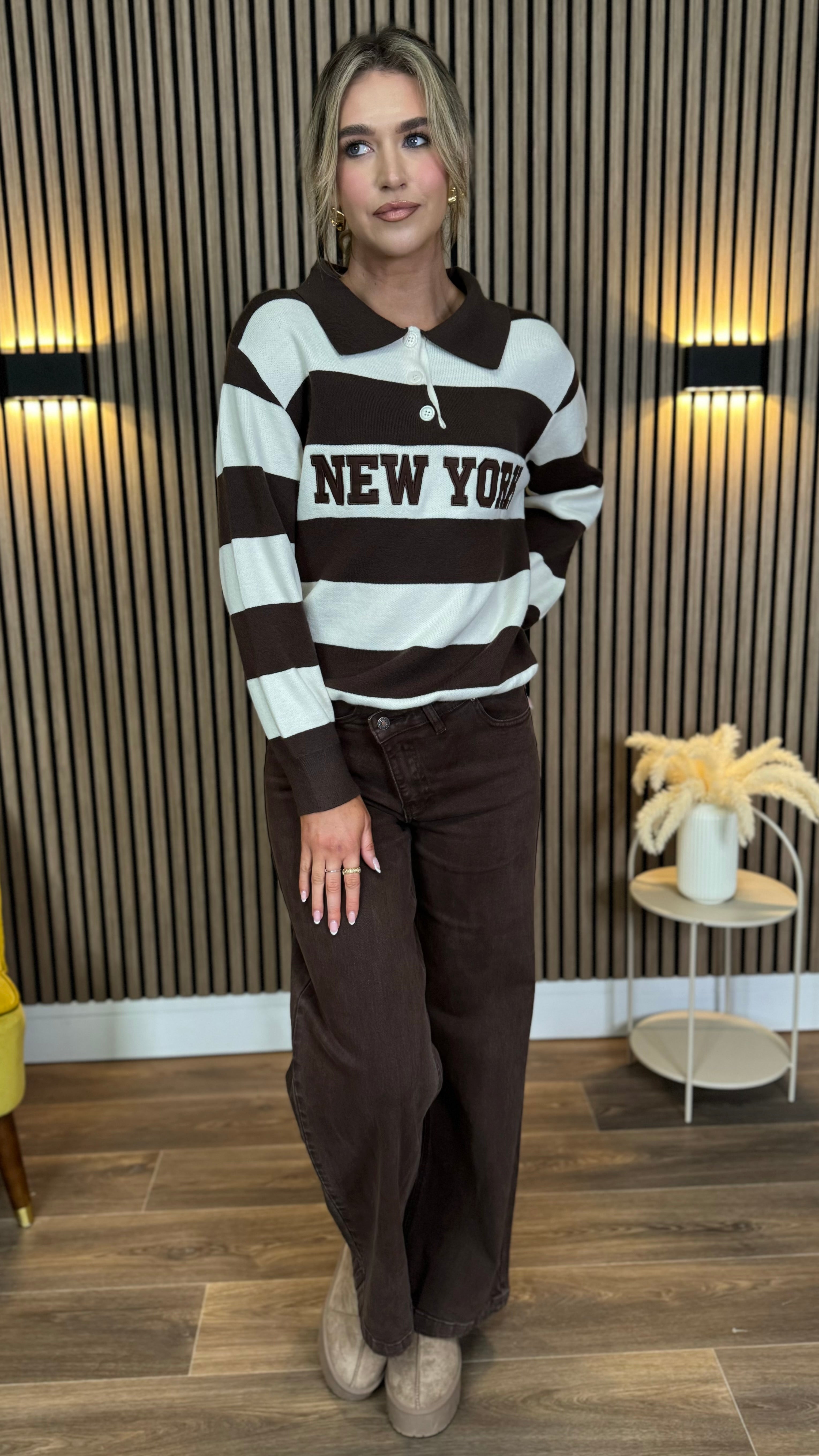 Cozy up in the Maverick Brown Stripe 'New York' Jumper, where bold brown and cream stripes meet a fun oversized fit. Featuring a charming collar detail and stylish button accents, this jumper adds a playful twist to your casual wardrobe while keeping you comfy all day. Perfect for layering or solo style adventures!