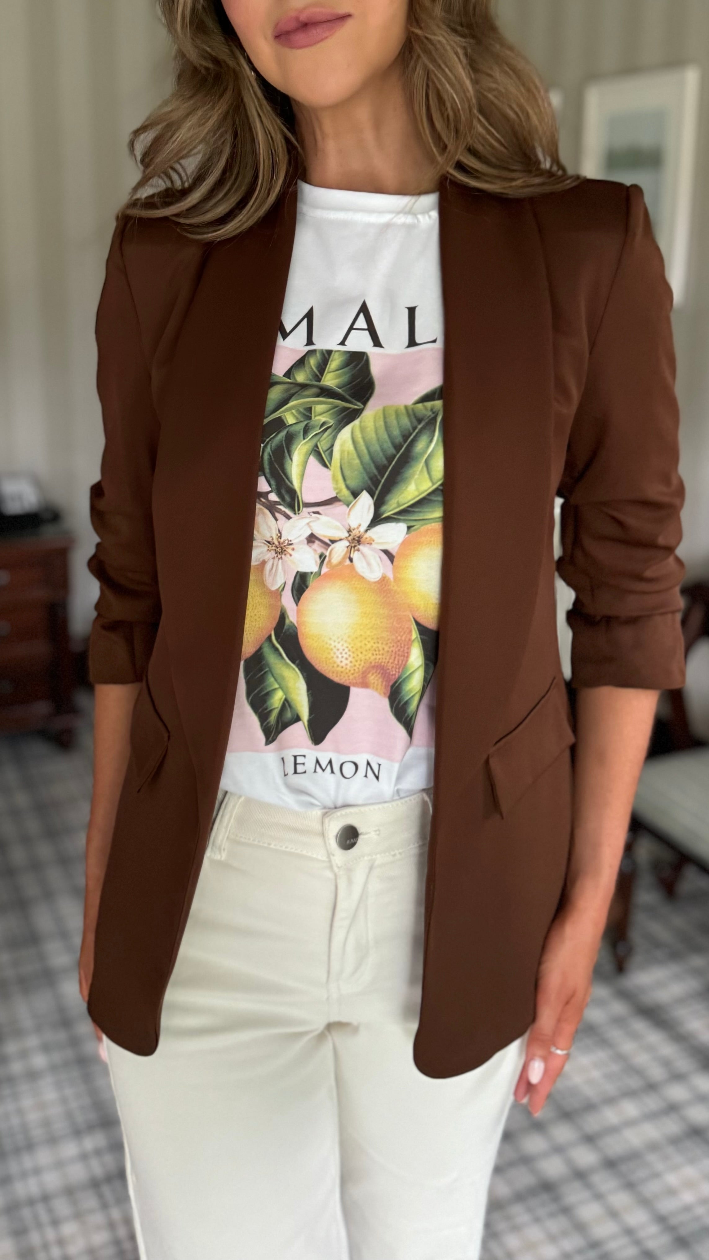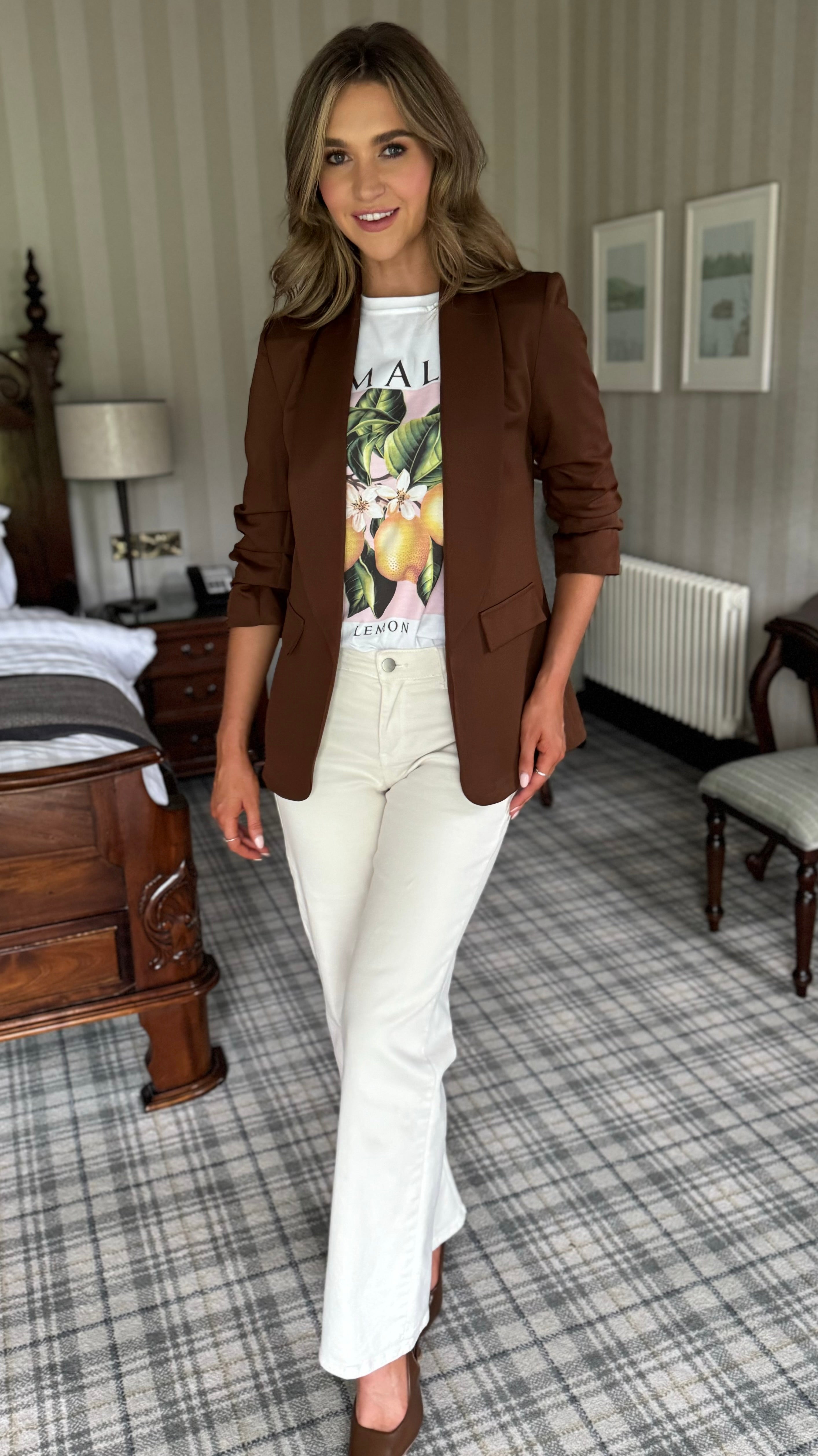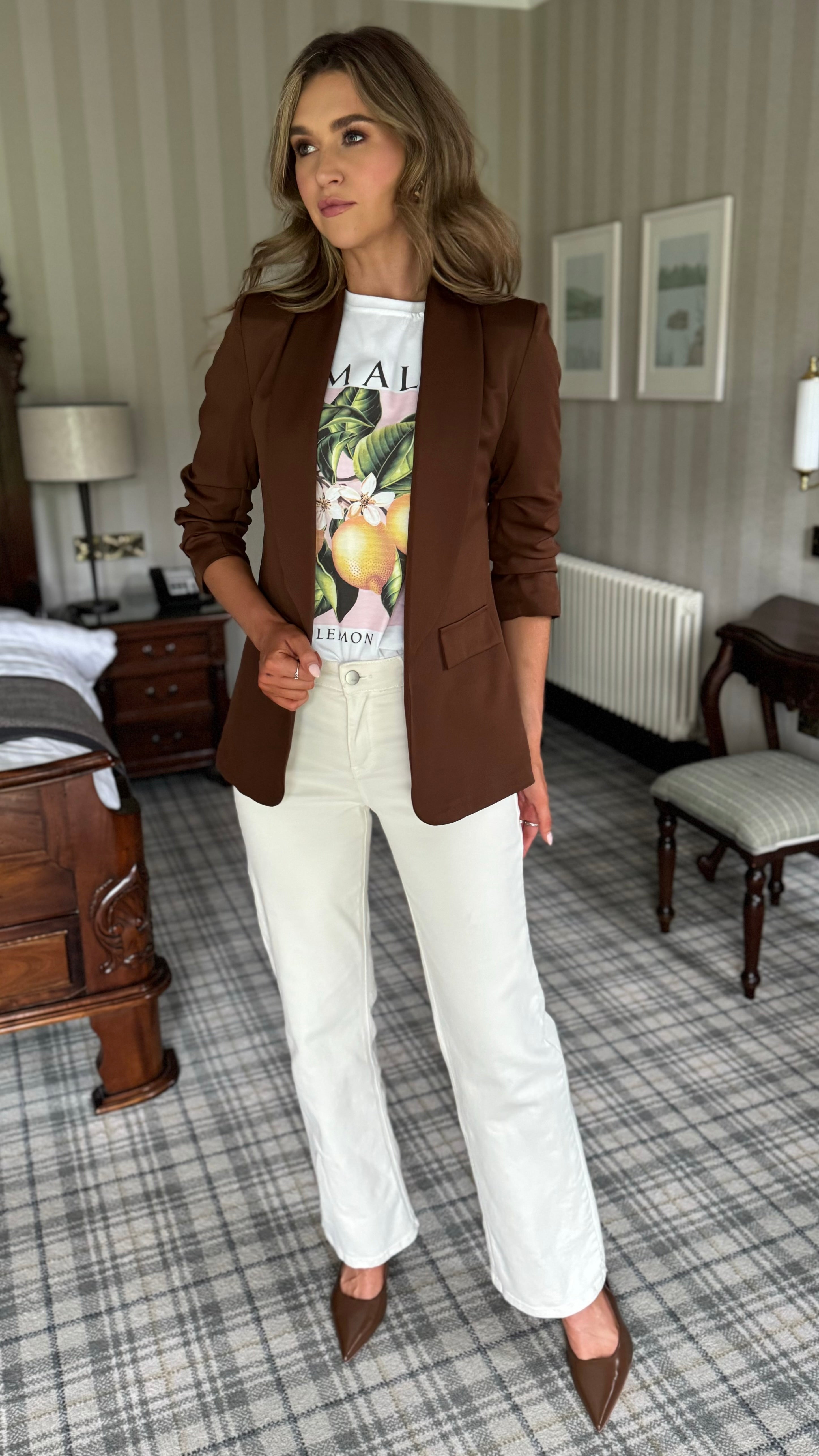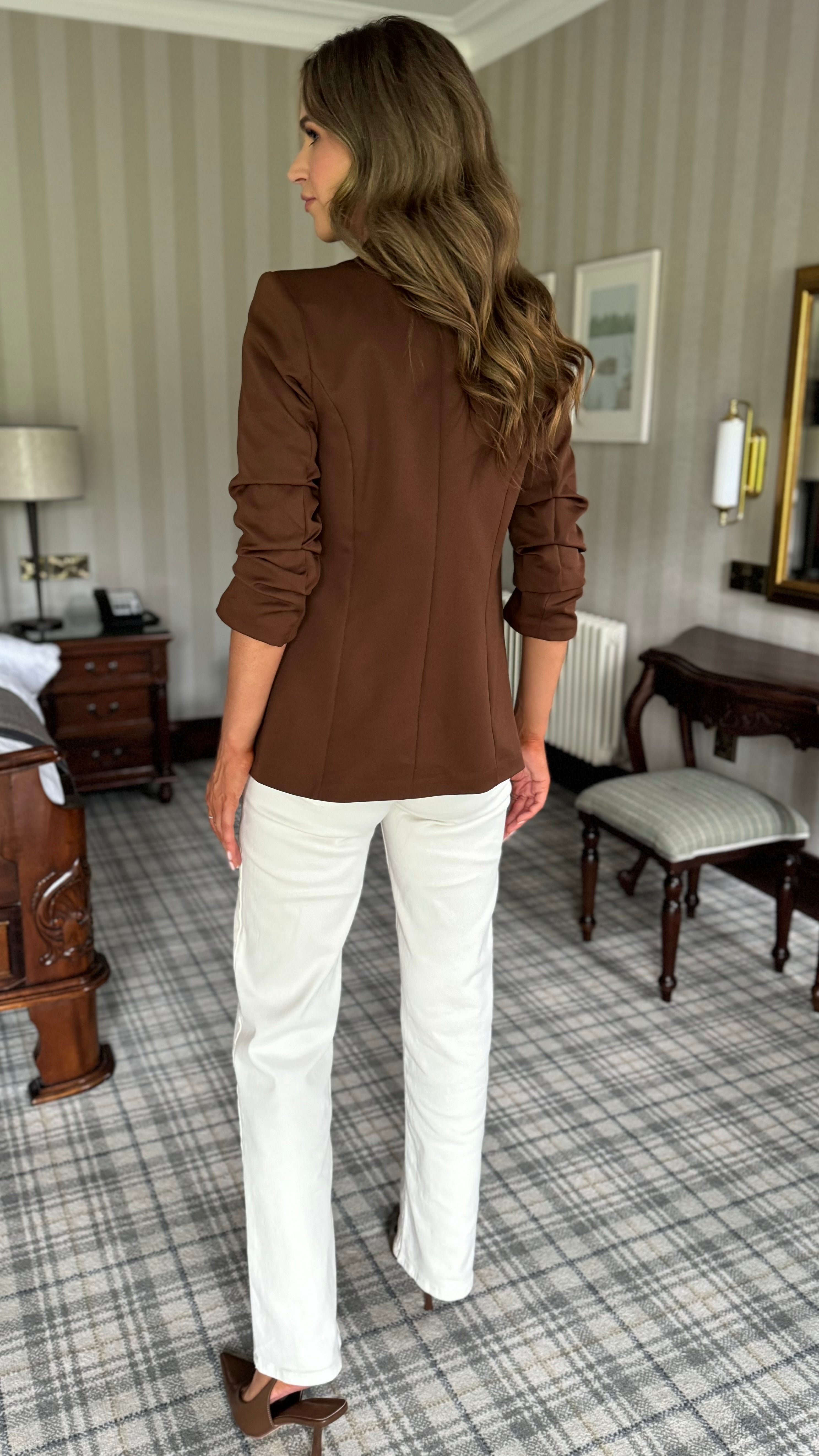 Elevate your wardrobe with the McKinley Brown Ruched Sleeve Blazer, a refined piece that blends classic tailoring with modern detail. Its ruched sleeves add a subtle yet distinctive texture, enhancing the blazer’s elegant silhouette. Perfect for professional settings or stylish evenings, this blazer offers a polished look that effortlessly transitions from day to night. Crafted to complement your sophisticated style, it pairs seamlessly with tailored trousers or a sleek dress for a confident, poised appearance.