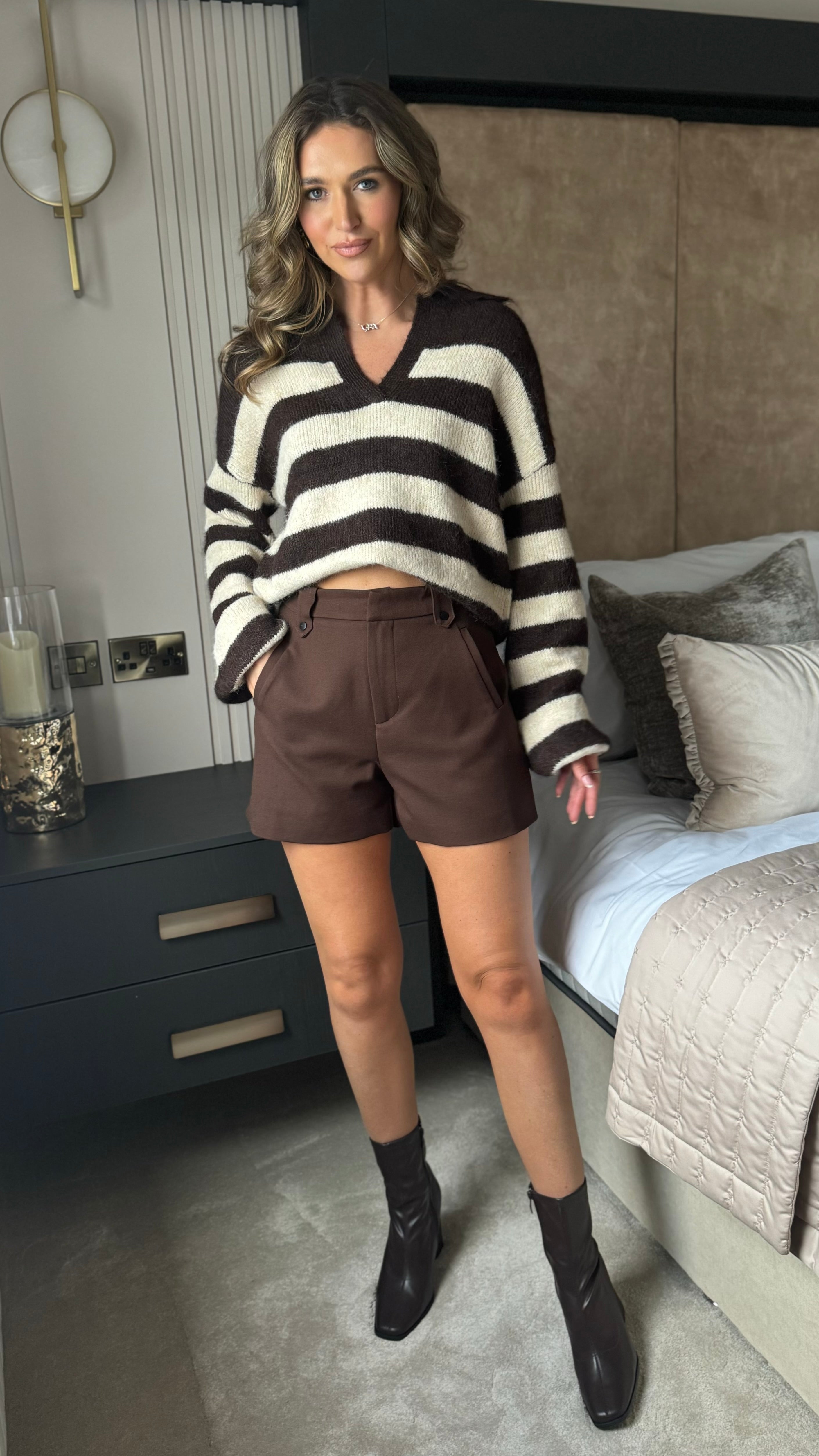 Cozy up in the Nia Brown & Beige Stripe Jumper, designed with a charming collar detail and a flattering V neckline that adds a dash of flair. Its wide sleeves offer a relaxed fit, while the soft and fluffy material keeps you snug and comfy. The classic stripe pattern brings a playful twist to your casual look, making this jumper a must-have for effortless style and warmth.