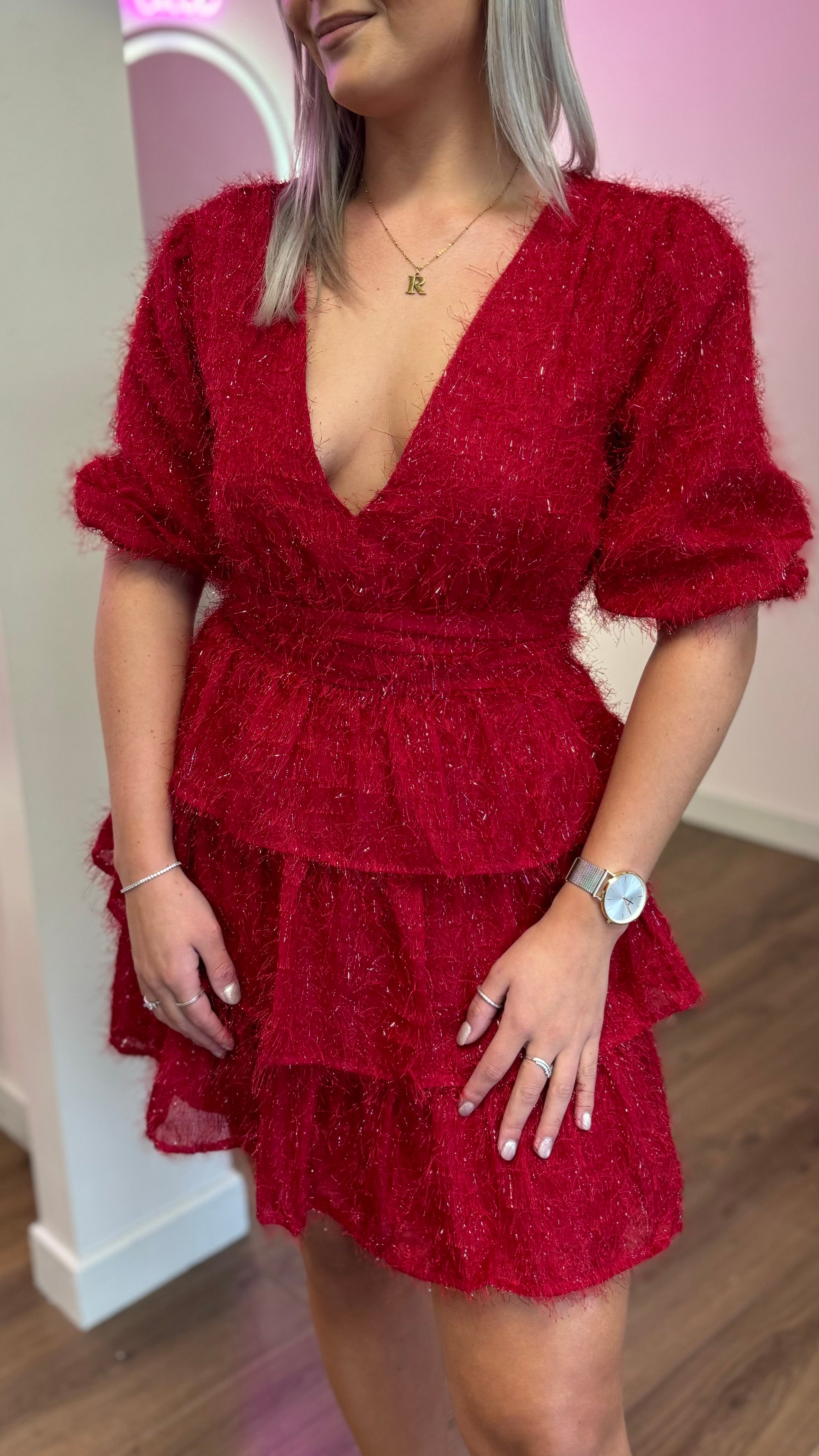 Elevate your evening look with this stunning red tiered mini dress that's pure magic! The flattering V-neckline and gathered shoulders create an effortlessly chic silhouette, while half-length sleeves add a touch of sophistication. A cinched waist beautifully emphasizes your curves, and shimmering glitter details catch the light with every move. The tiered skirt adds playful dimension and movement, while a concealed back zip ensures a seamless finish. Perfect for nights when you want to sparkle and shine!