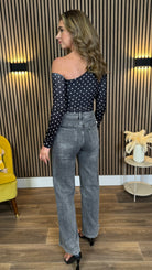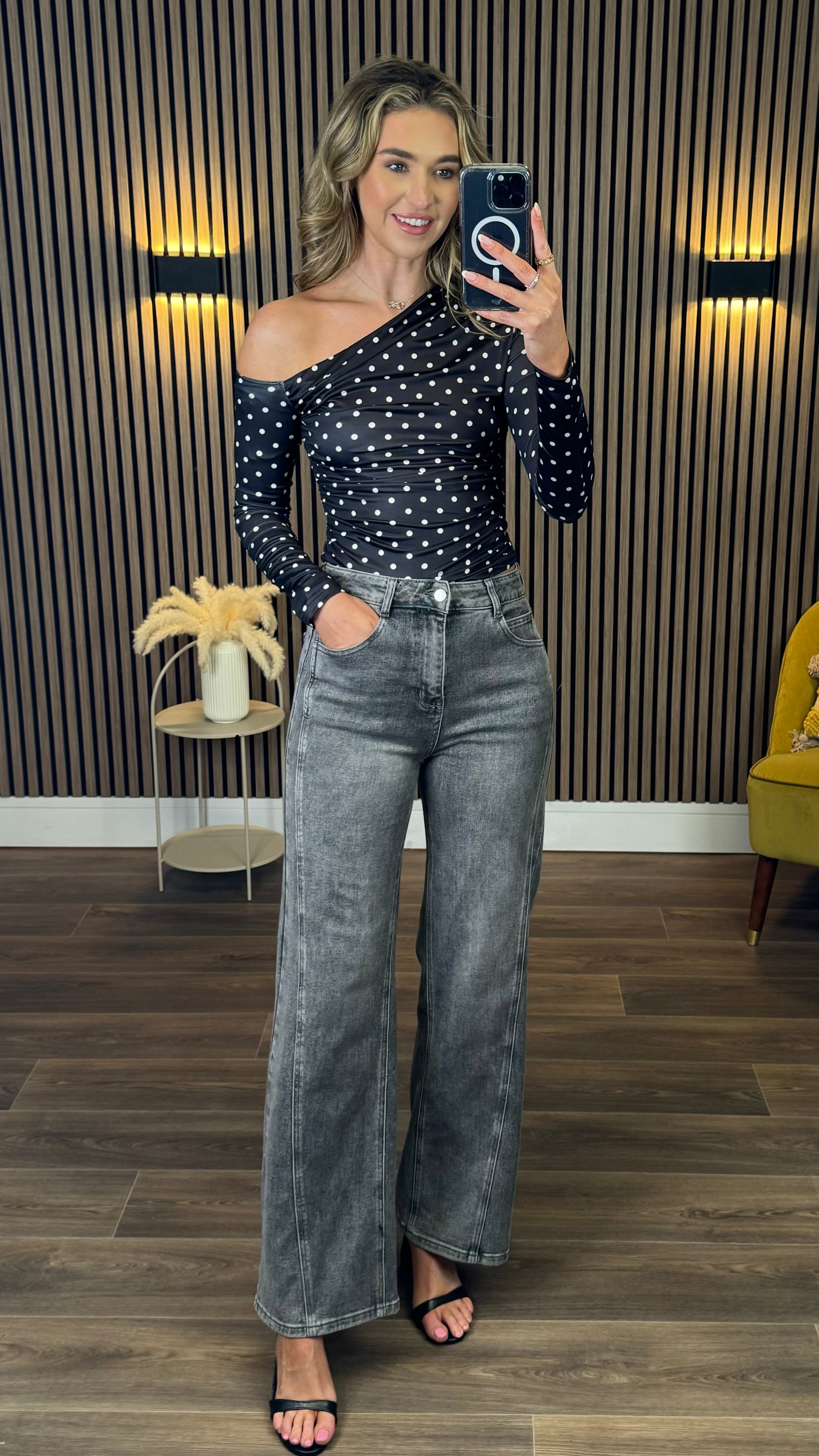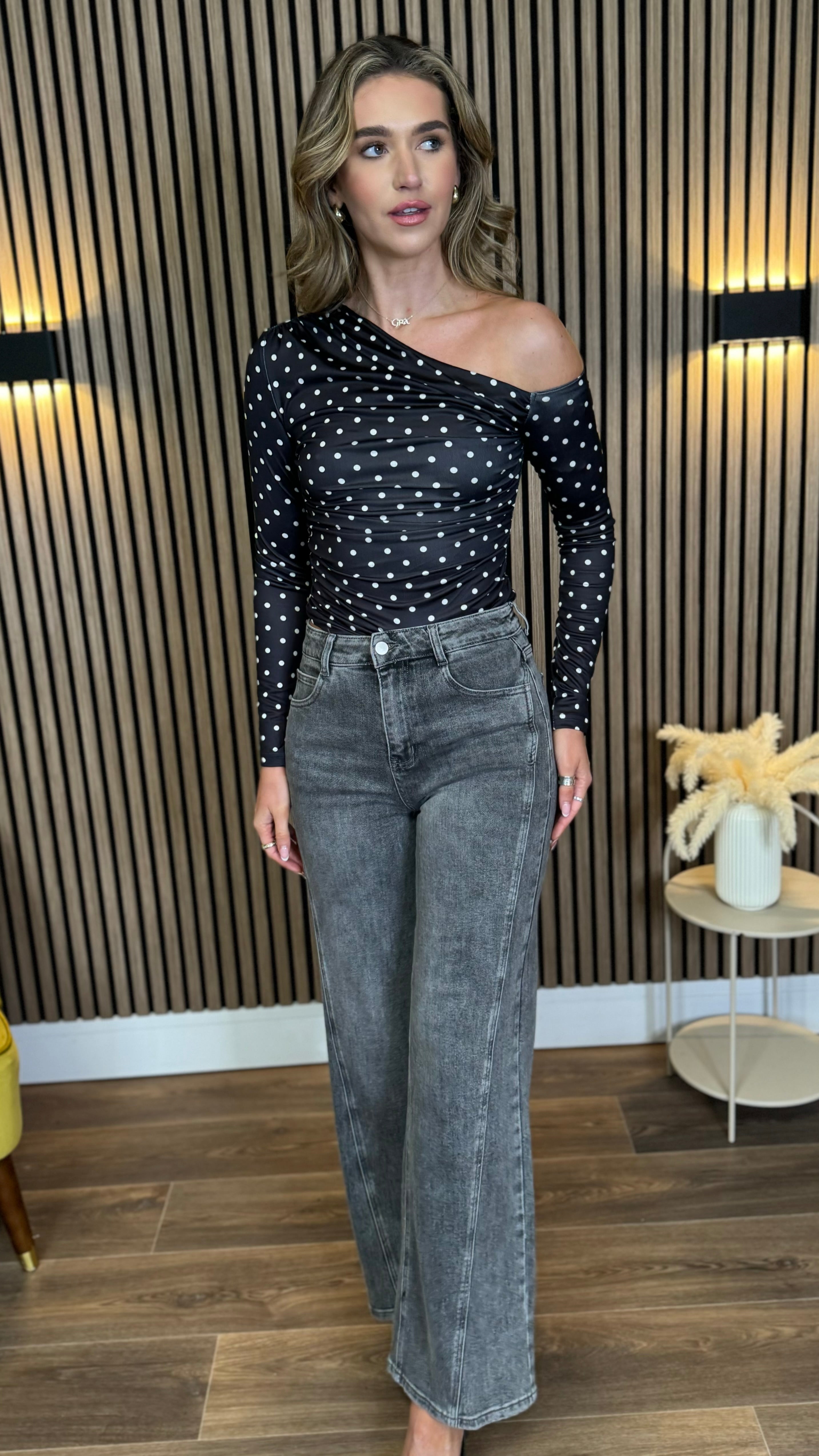 Make a statement with the Nuna Black Polka Dot Asymmetric Top—a playful piece that's equal parts chic and unexpected. Featuring long sleeves and an eye-catching asymmetric cut, this top brings movement and dimension to your everyday wardrobe. Strategic ruching adds texture and flatters your silhouette, while the classic polka dot pattern keeps things fun and timeless. Whether you're dressing up for a night out or elevating your casual look, this on-trend top delivers personality with effortless style.