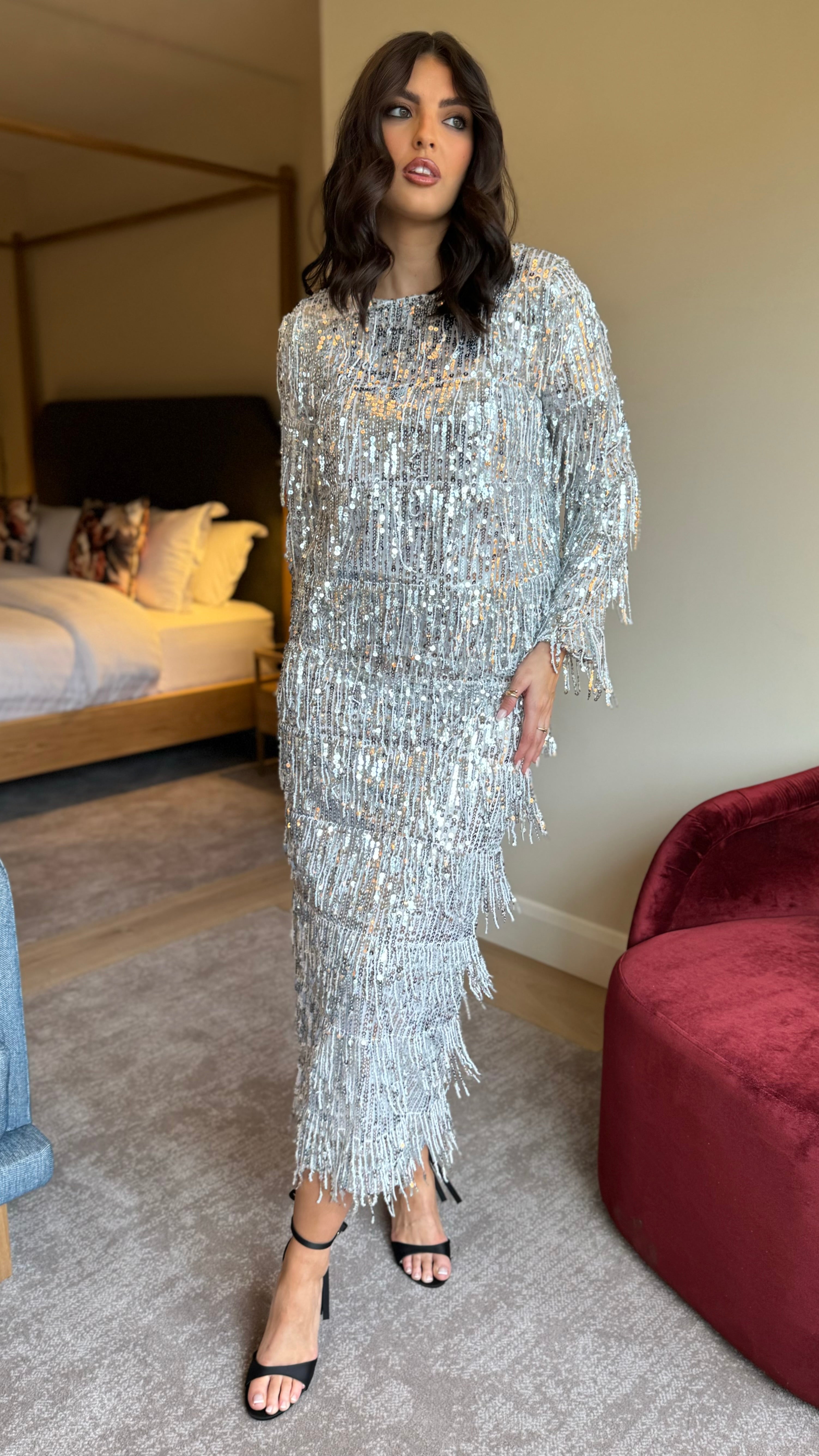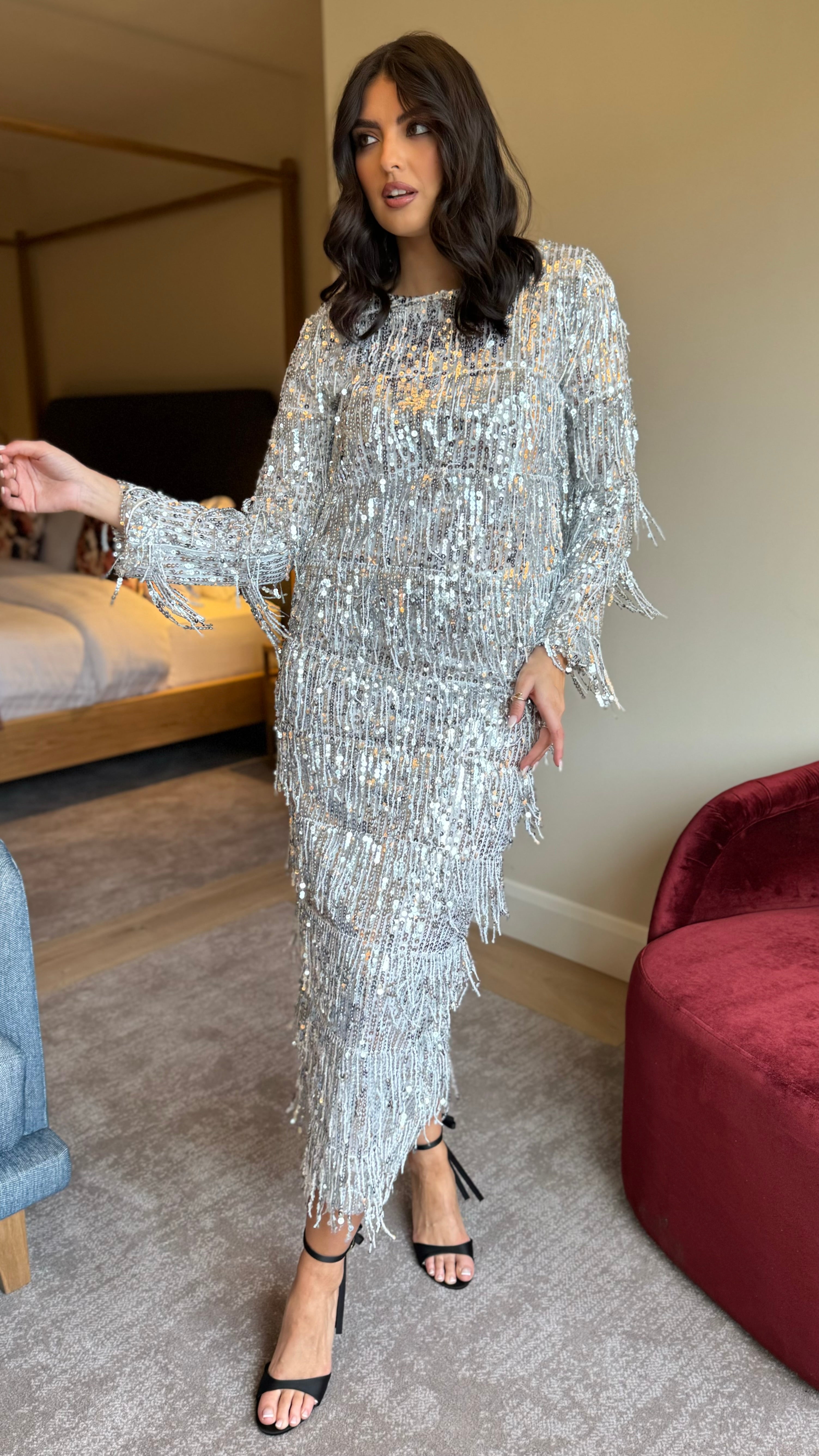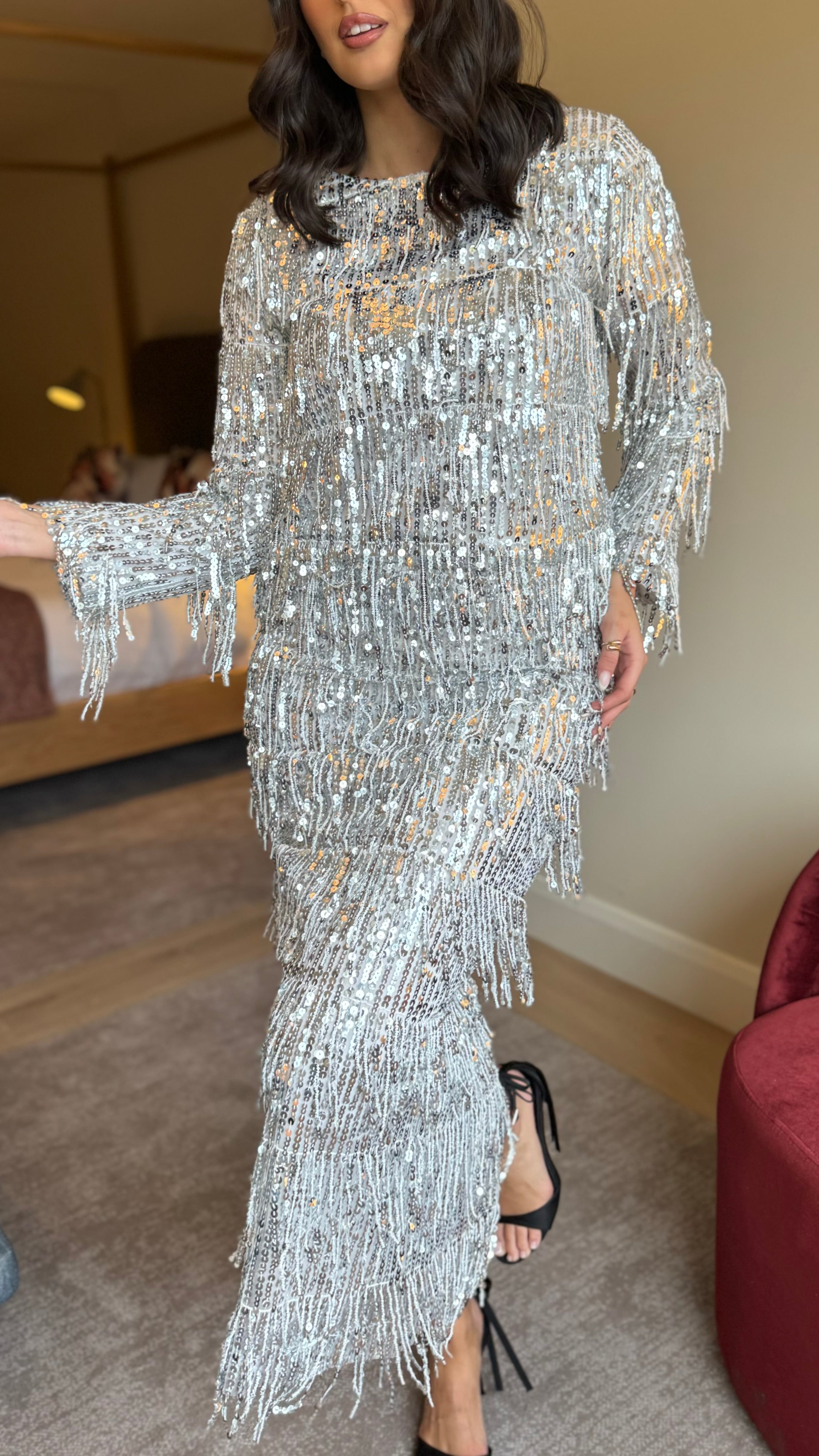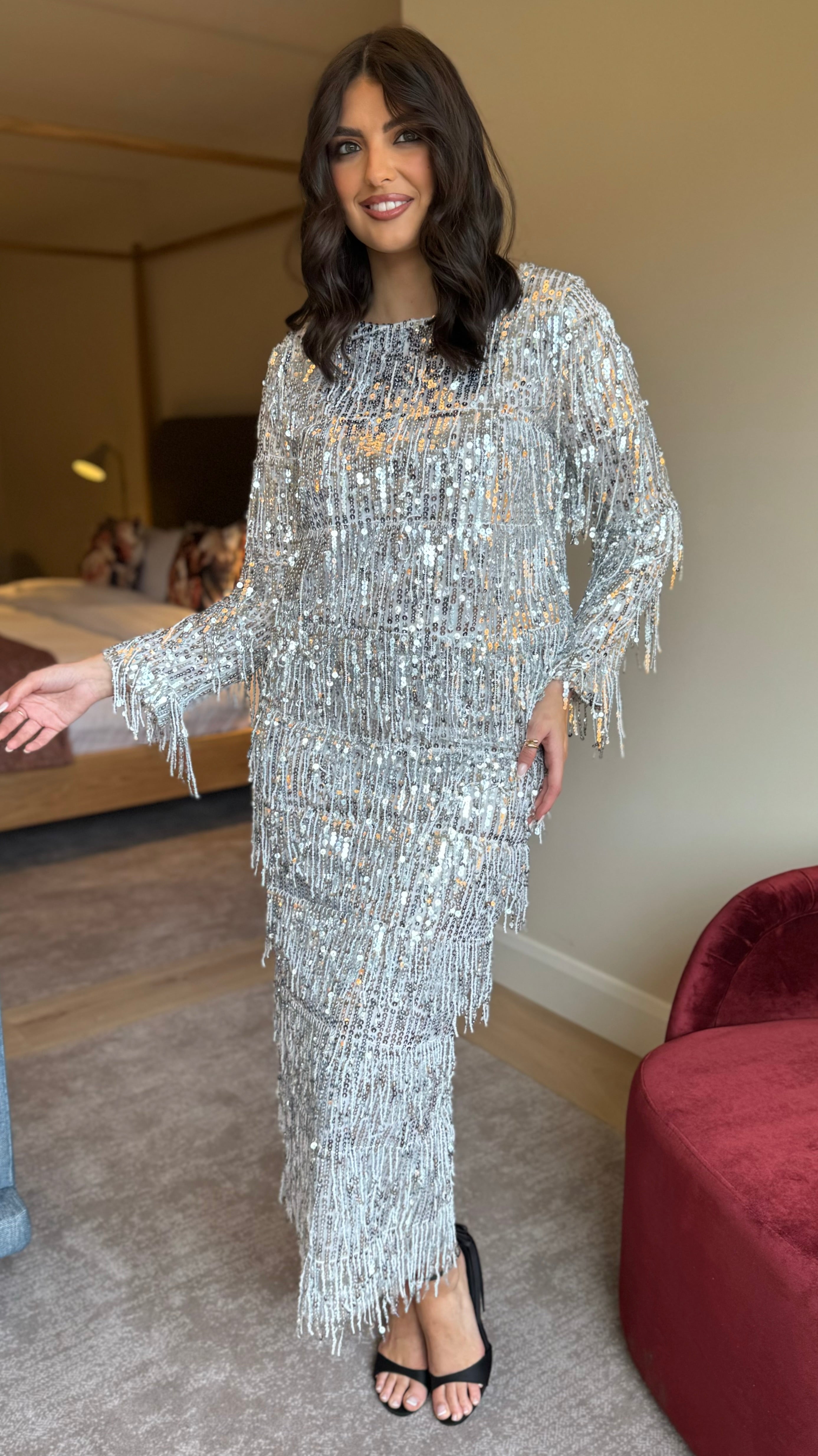 Shimmer and sway in this show-stopping midaxi skirt that's pure sparkle magic. Covered in shimmering silver sequin tassels that dance with every move, it's designed to turn heads at any occasion. The comfortable elasticated waistband ensures an easy, flattering fit, while the soft lining keeps you feeling fabulous all night long. Perfect for anyone ready to add some serious glitter to their wardrobe.