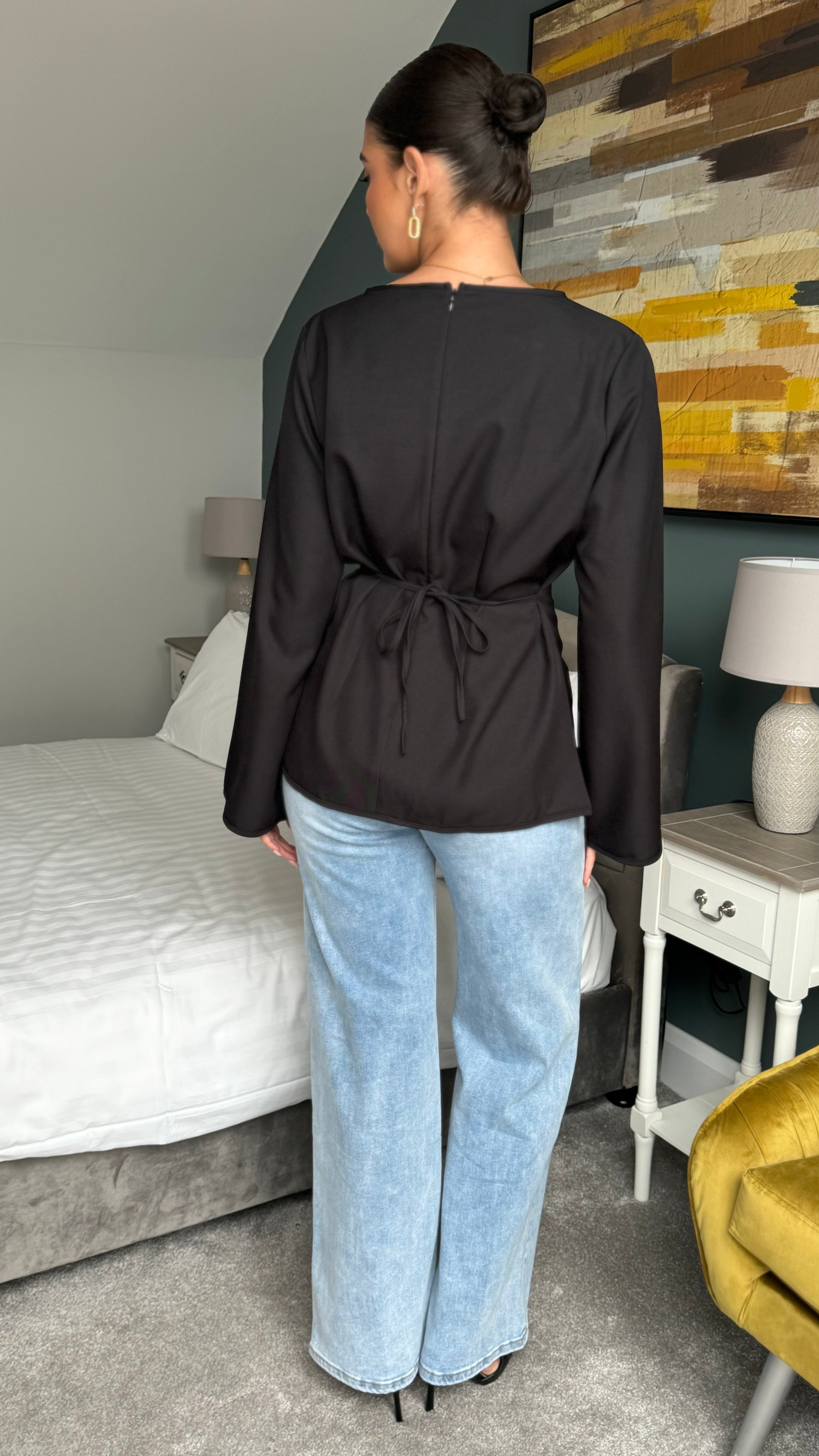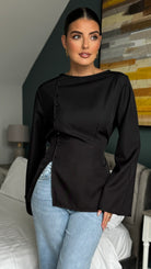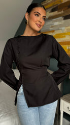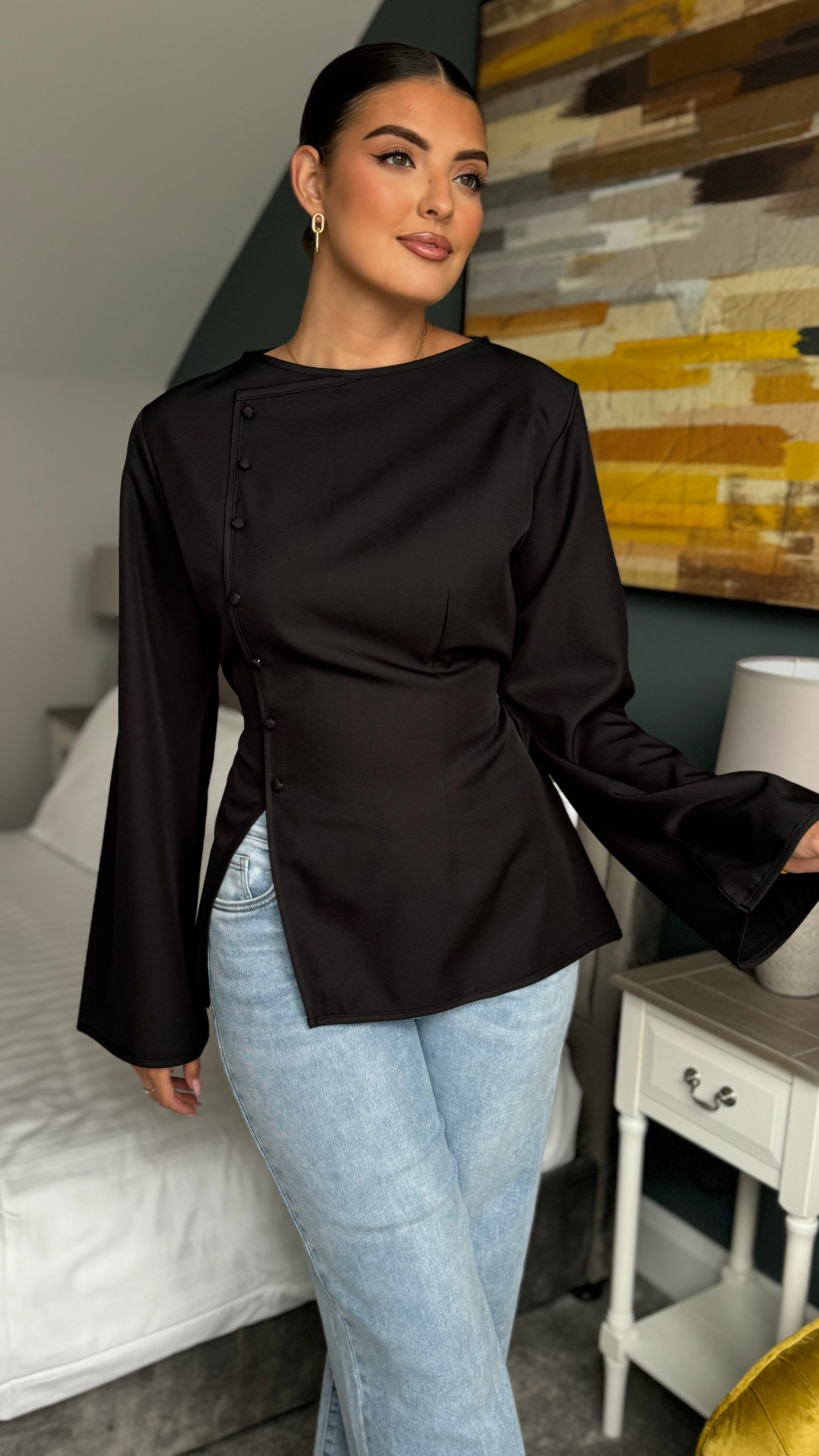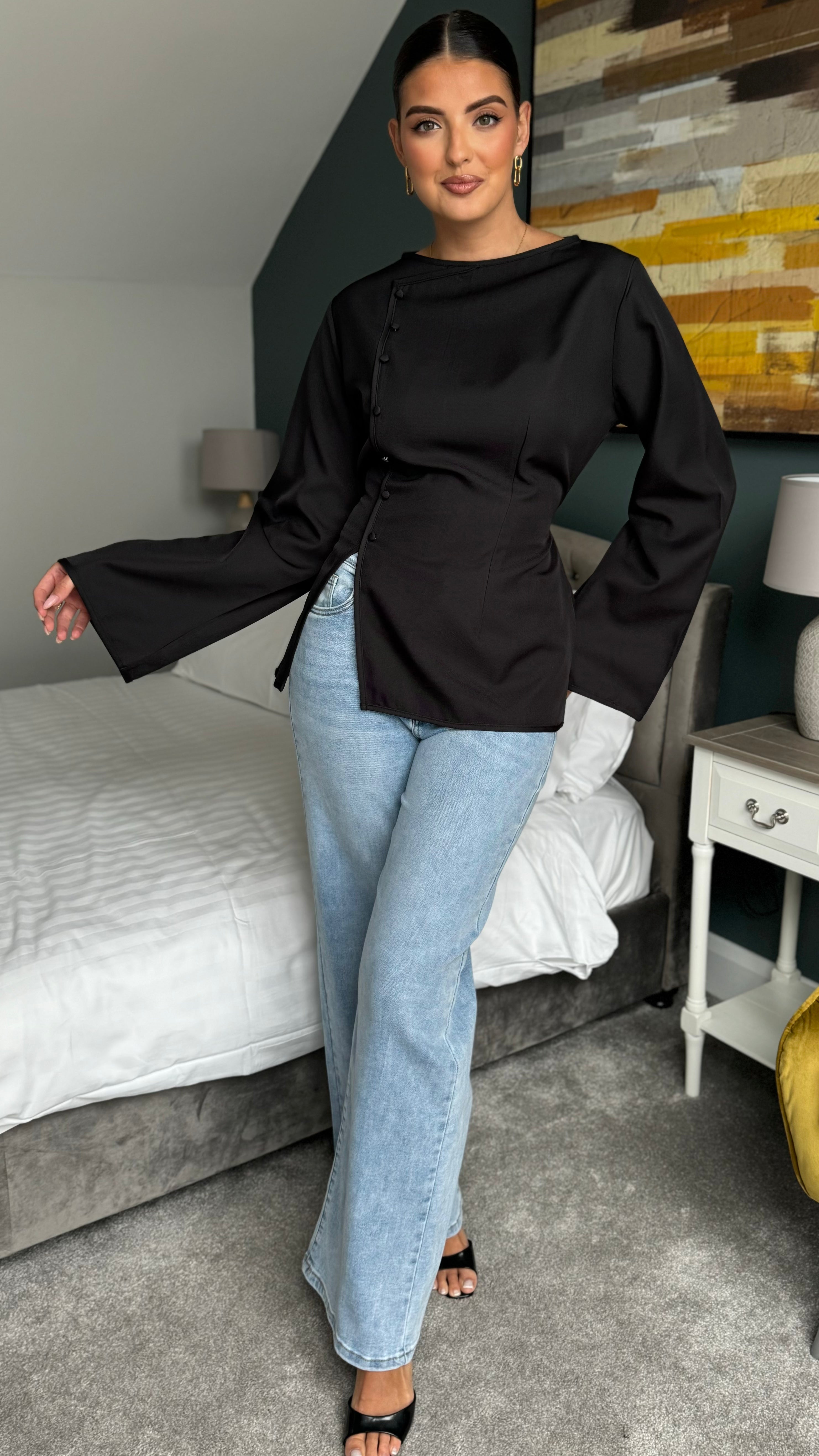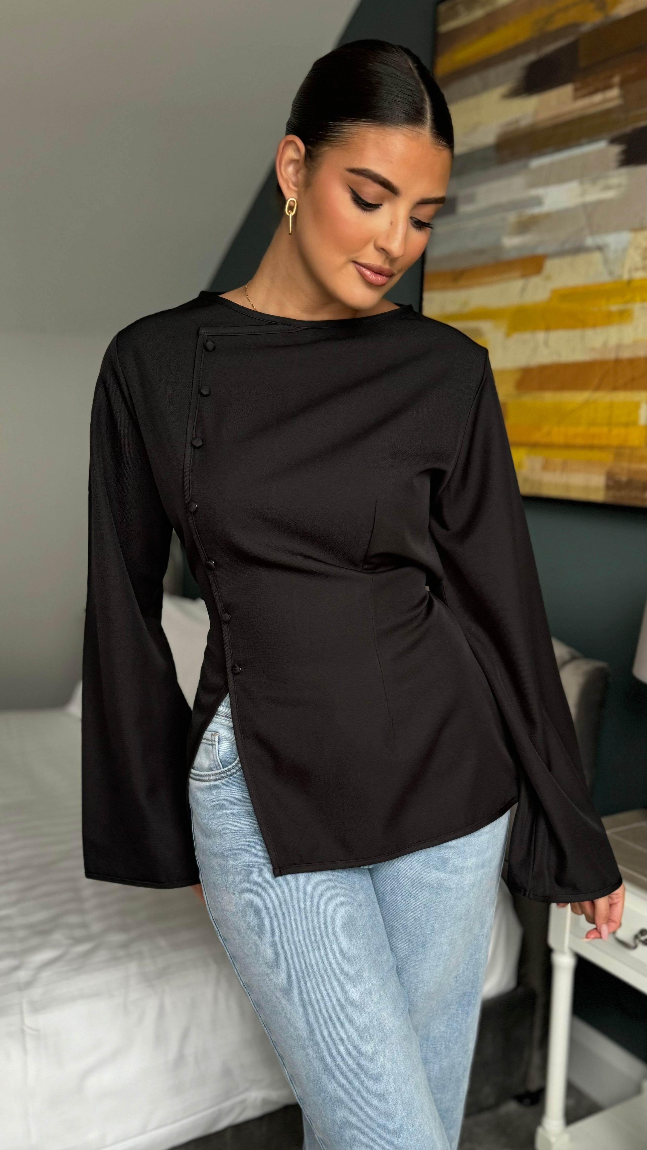 Elevate your everyday wardrobe with this striking black top, designed for effortless sophistication. The asymmetric button detail and front split create visual interest, while generously cut wide sleeves offer comfort and movement. A classic round neckline keeps the look refined, and adjustable back ties let you customize the waist cinching for a flattering, personalized fit. Perfect for layering or wearing solo, this piece transitions seamlessly from day to evening.
