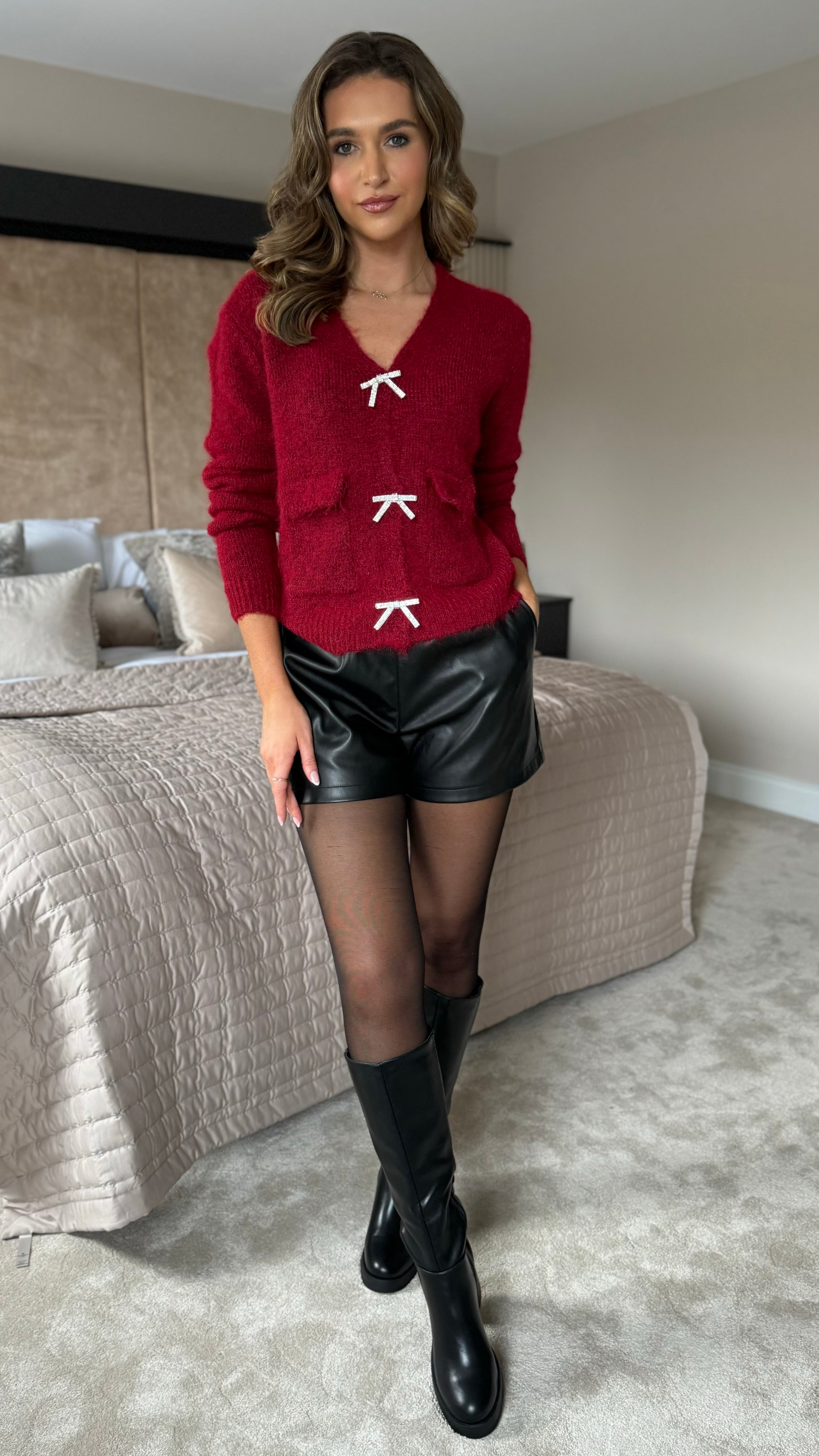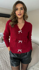 Opal Burgundy Rhinestone Bow Detail Cardigan