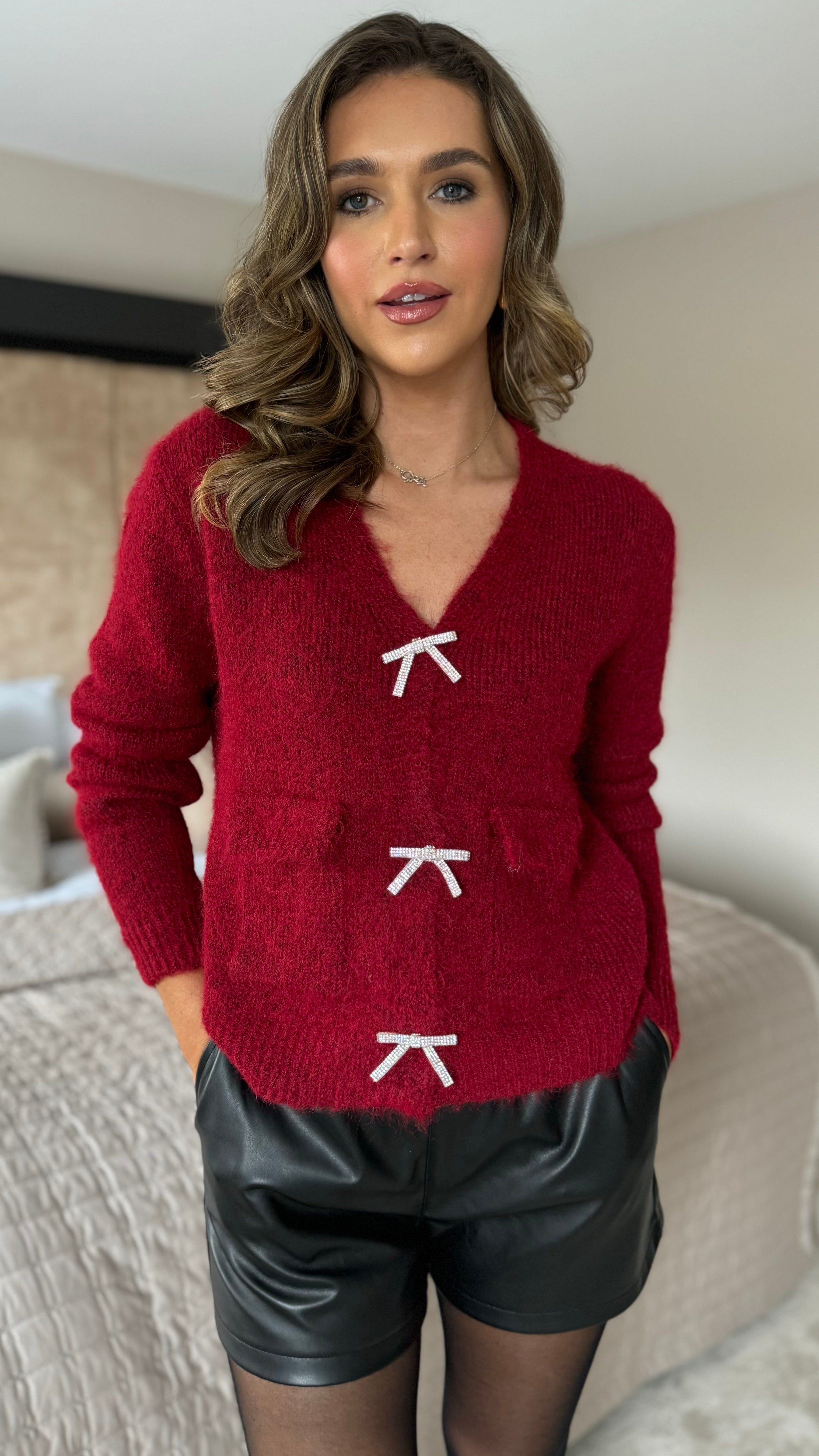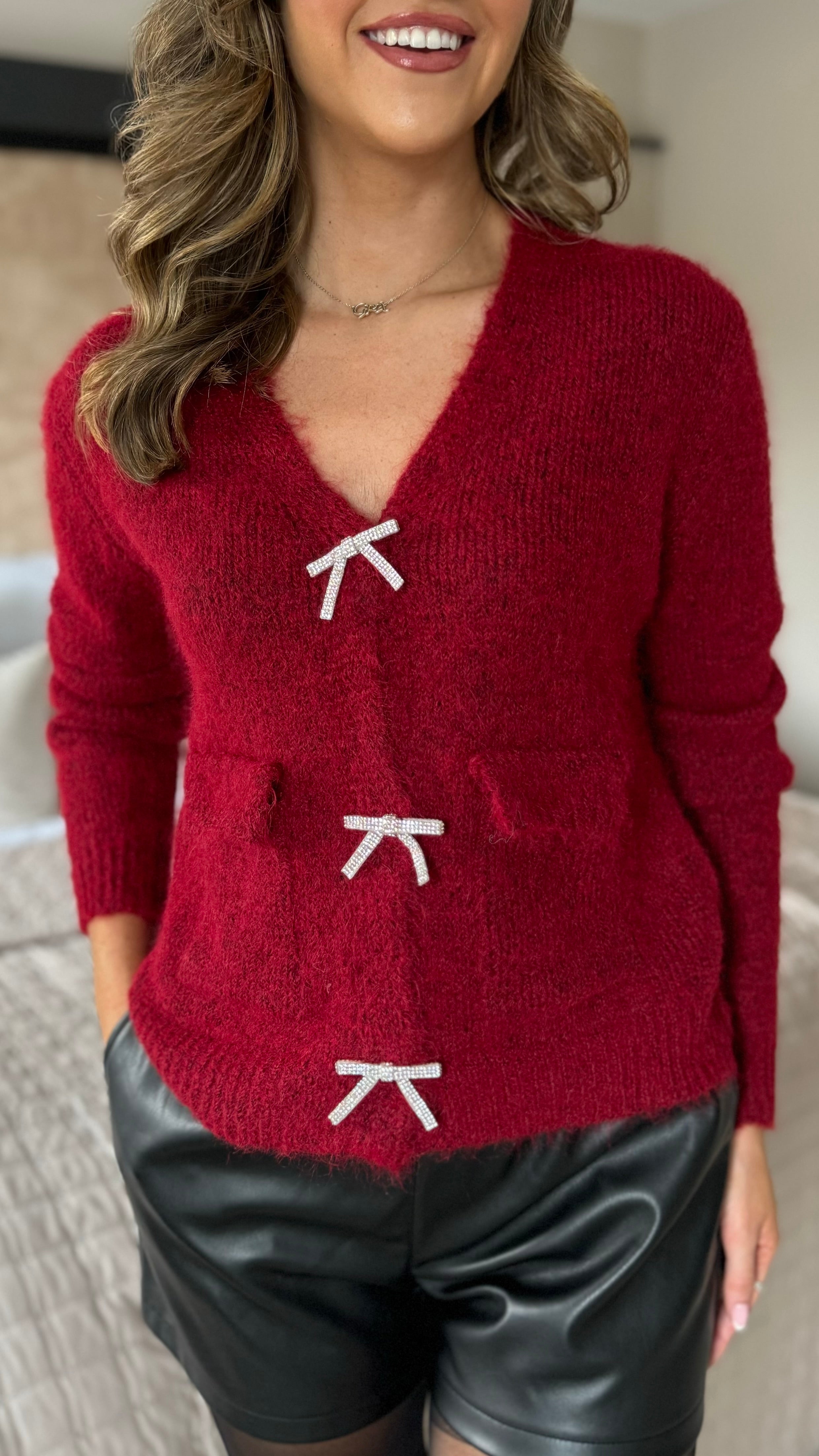 Embrace cozy charm with this Opal Burgundy Cardigan, featuring sparkling rhinestone bow fastenings that add a playful touch. Its flattering V-neckline frames your look perfectly, while the soft, fluffy fabric keeps you snug and stylish all day long. A fun and elegant layering piece you'll love to wear!