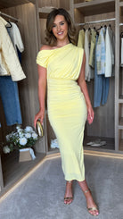 Presley Yellow Off The Shoulder Draped Top Midi Dress (PRE ORDER)