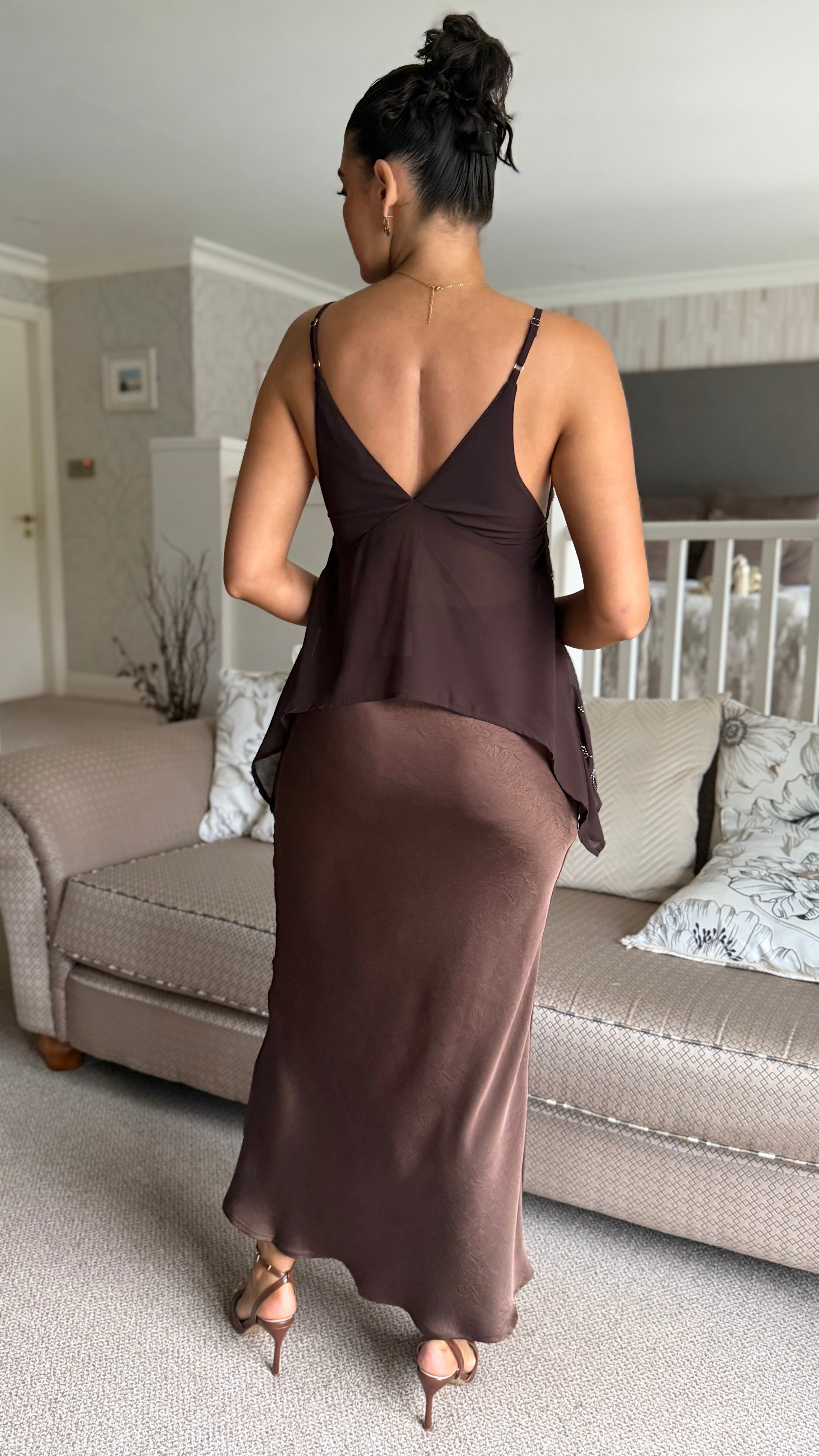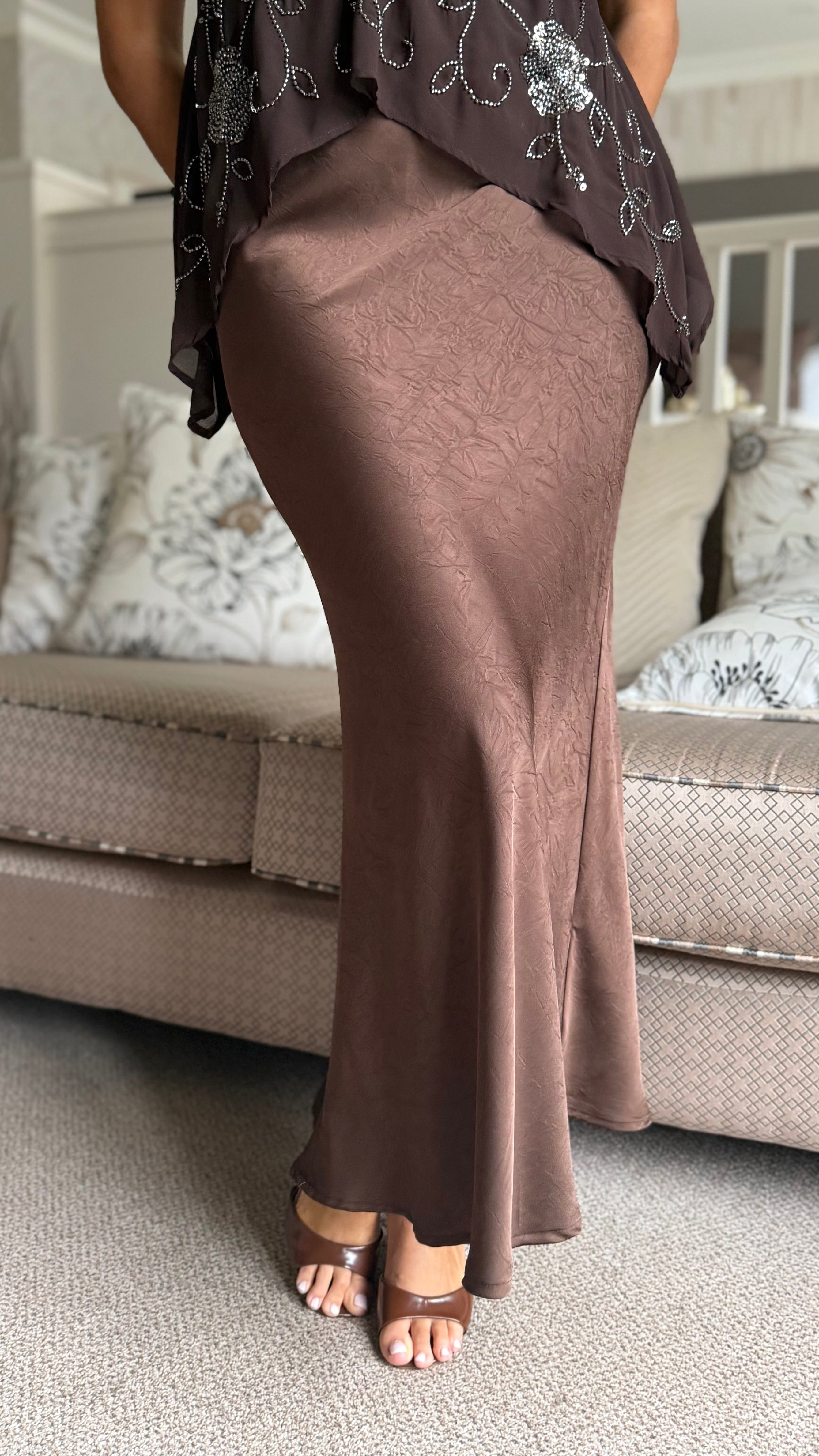 Indulge in luxury with the Raelynn Brown Satin Midi Skirt. The soft satin material drapes elegantly for a sophisticated look. The ivory hue adds a touch of femininity and romance. Perfect for any occasion, this midi skirt is sure to turn heads.