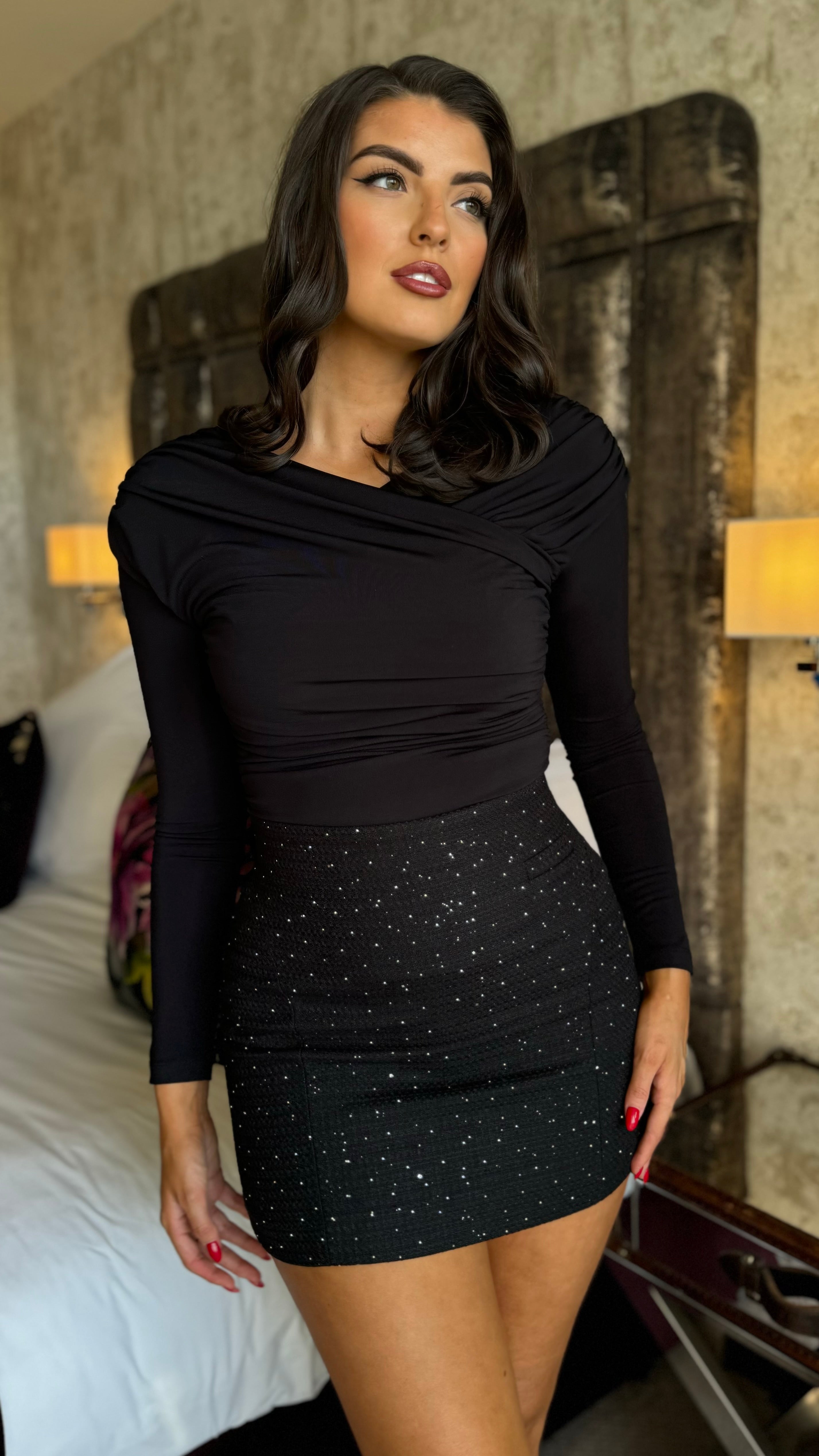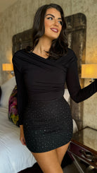 Rock a rebellious edge with this striking black mini skirt that's all attitude. Crafted from textured tweed-like fabric, it features eye-catching studded diamanté details that catch the light with every move. The flattering A-line silhouette skims your curves while the soft lining keeps you comfortable all day long. A concealed back zip ensures a seamless finish. Perfect for turning heads at nights out or adding instant cool-girl vibes to your everyday look.