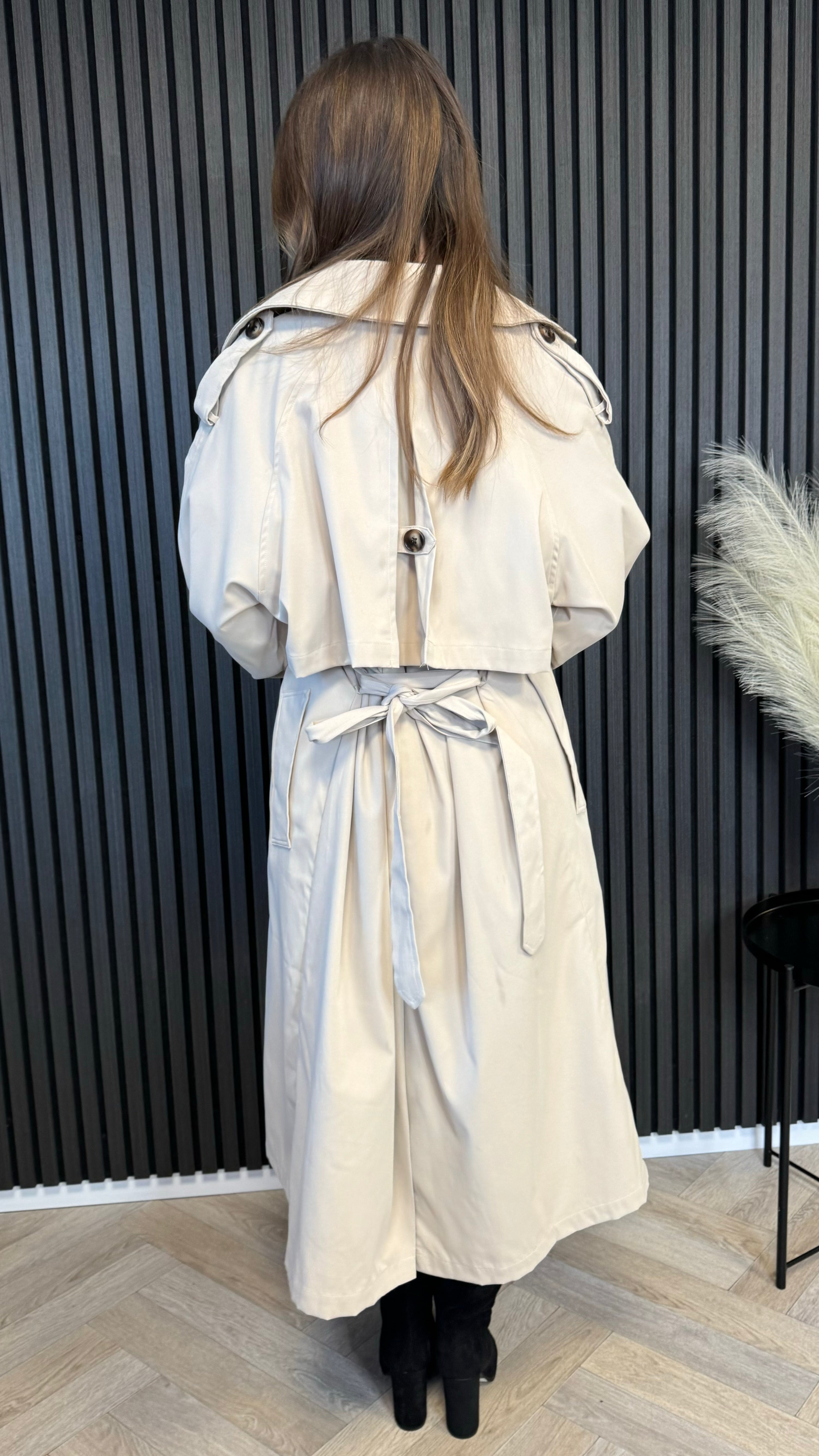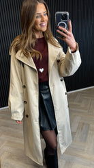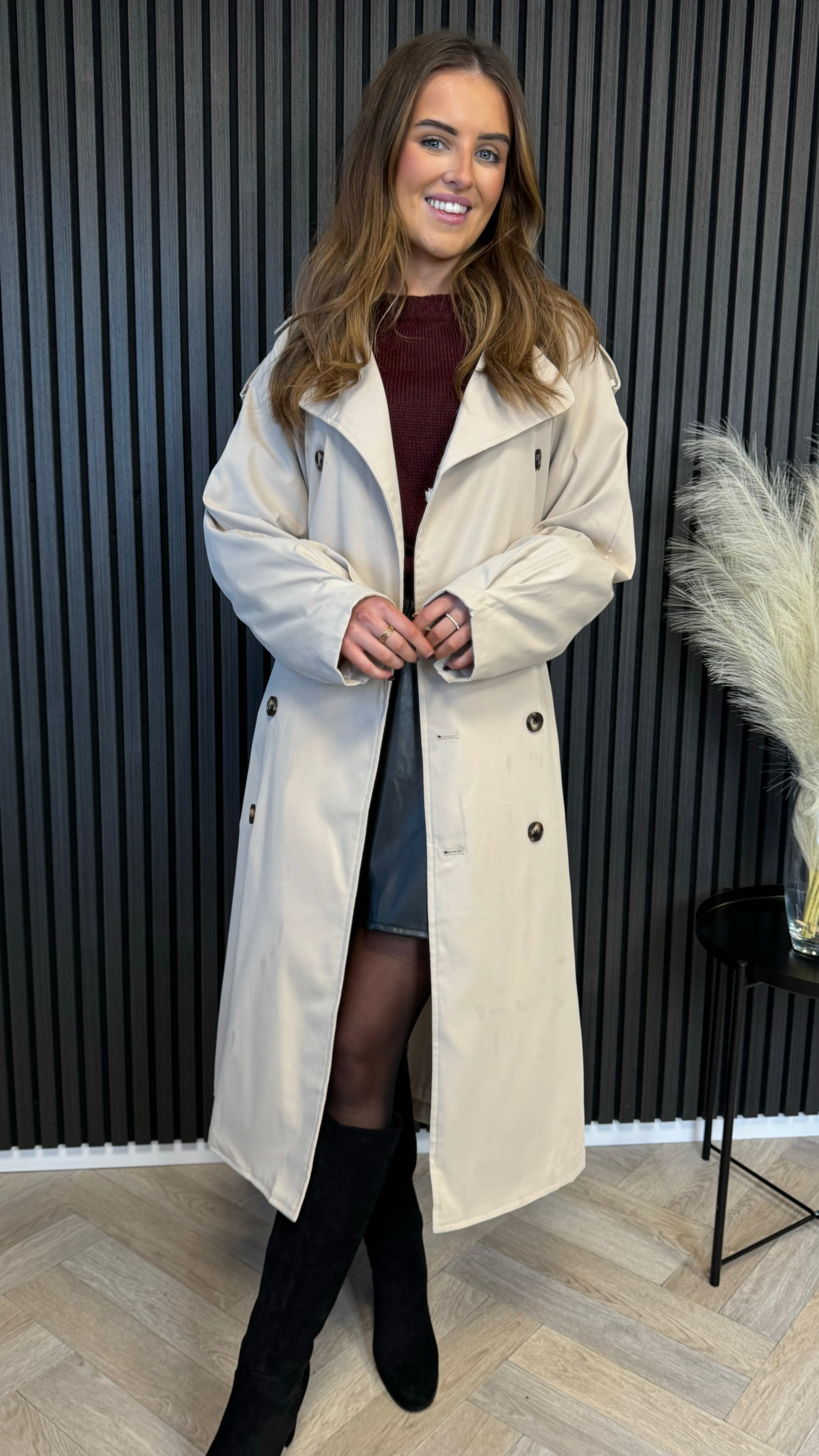 Stay stylish and protected with the Regina Beige Midi Trench Coat! Made from lightweight fabric, this trench coat features a button and tie-up closure, along with side inner patch pockets for convenience. With its classic design and included belt, you'll be ready for any weather in style.