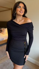 Sanna Black Off Shoulder Ruched Long Sleeve Top