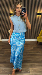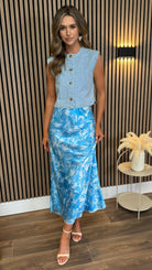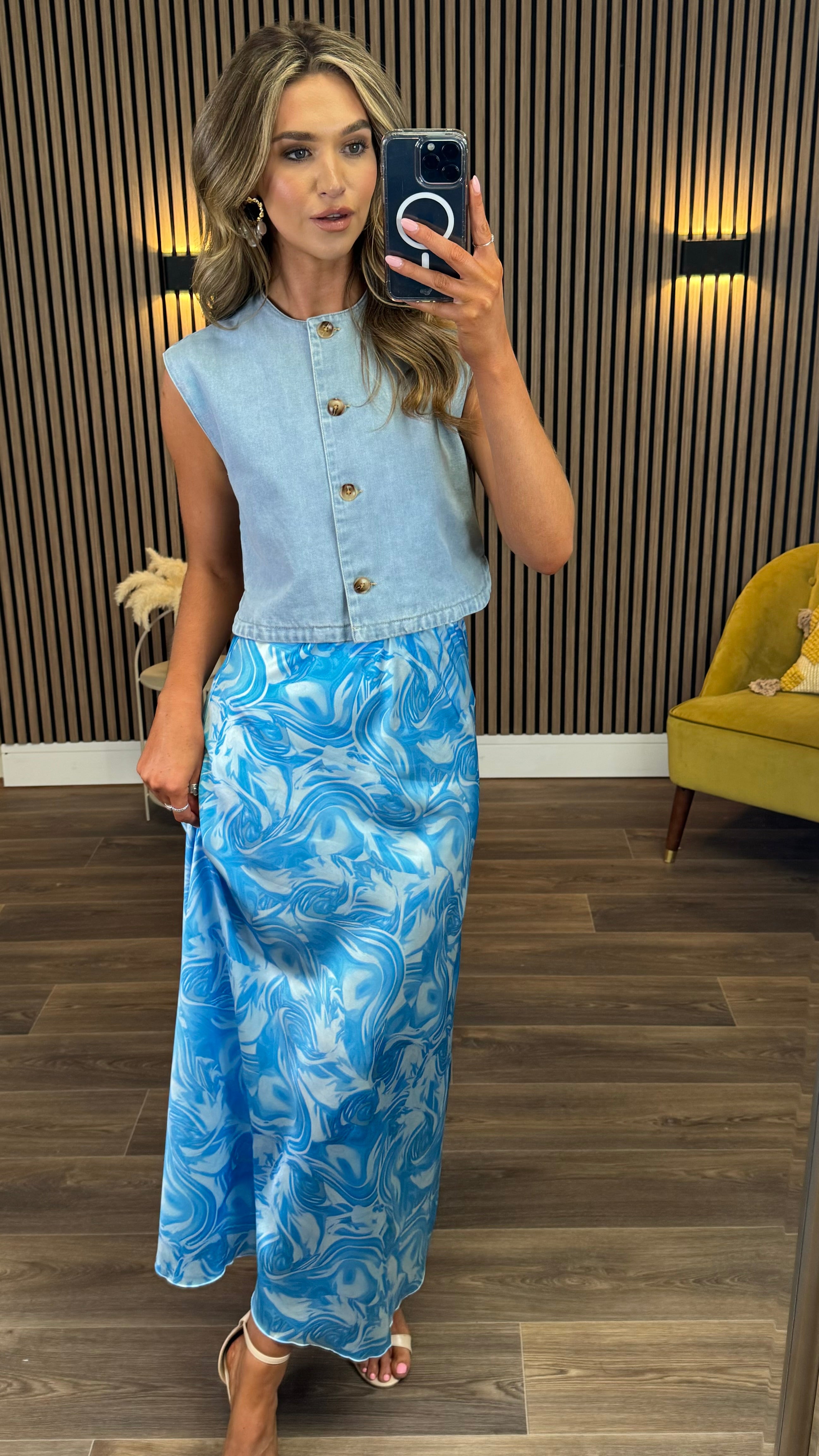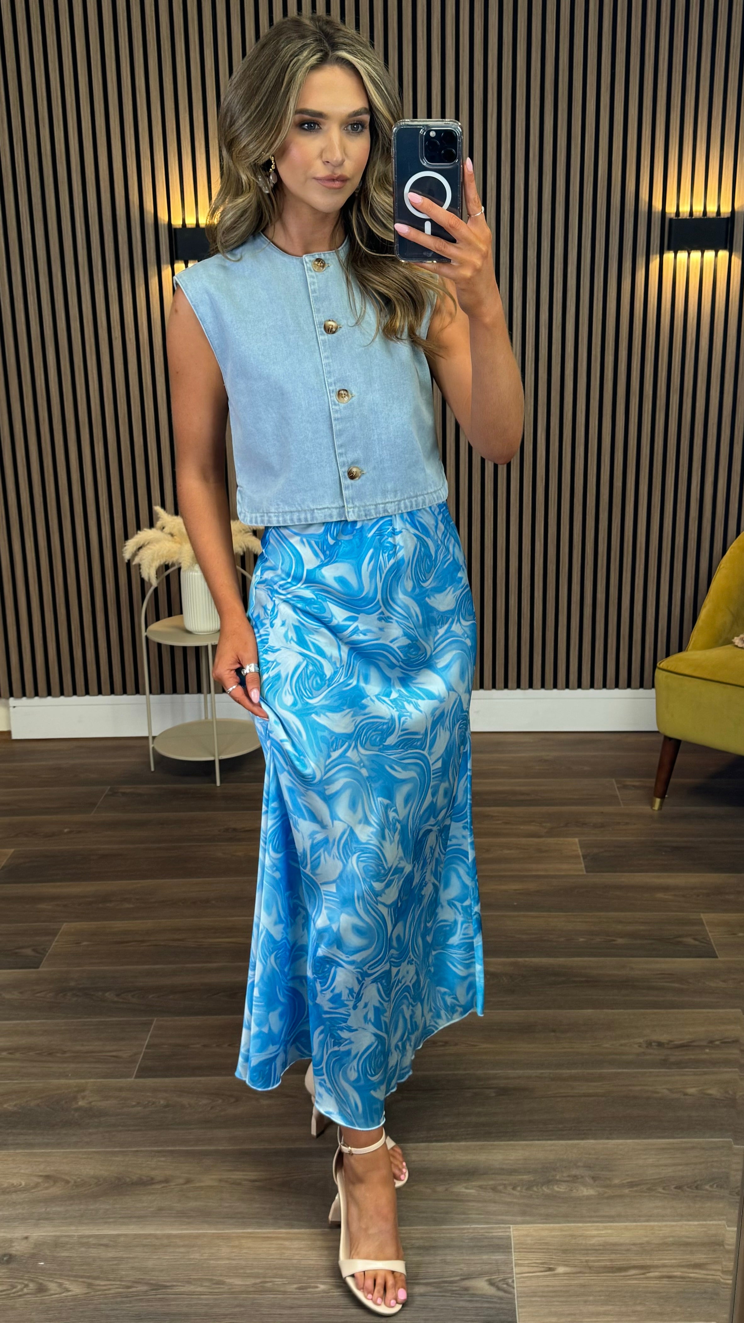 Introducing the Savi Blue Abstract Print Satin Midi Skirt! Take your style to abstract new heights with this playful and eye-catching skirt. Made of smooth satin material, the midi length adds a touch of sophistication, while the blue abstract print adds a unique and fun touch. Perfect for any occasion! 🎨