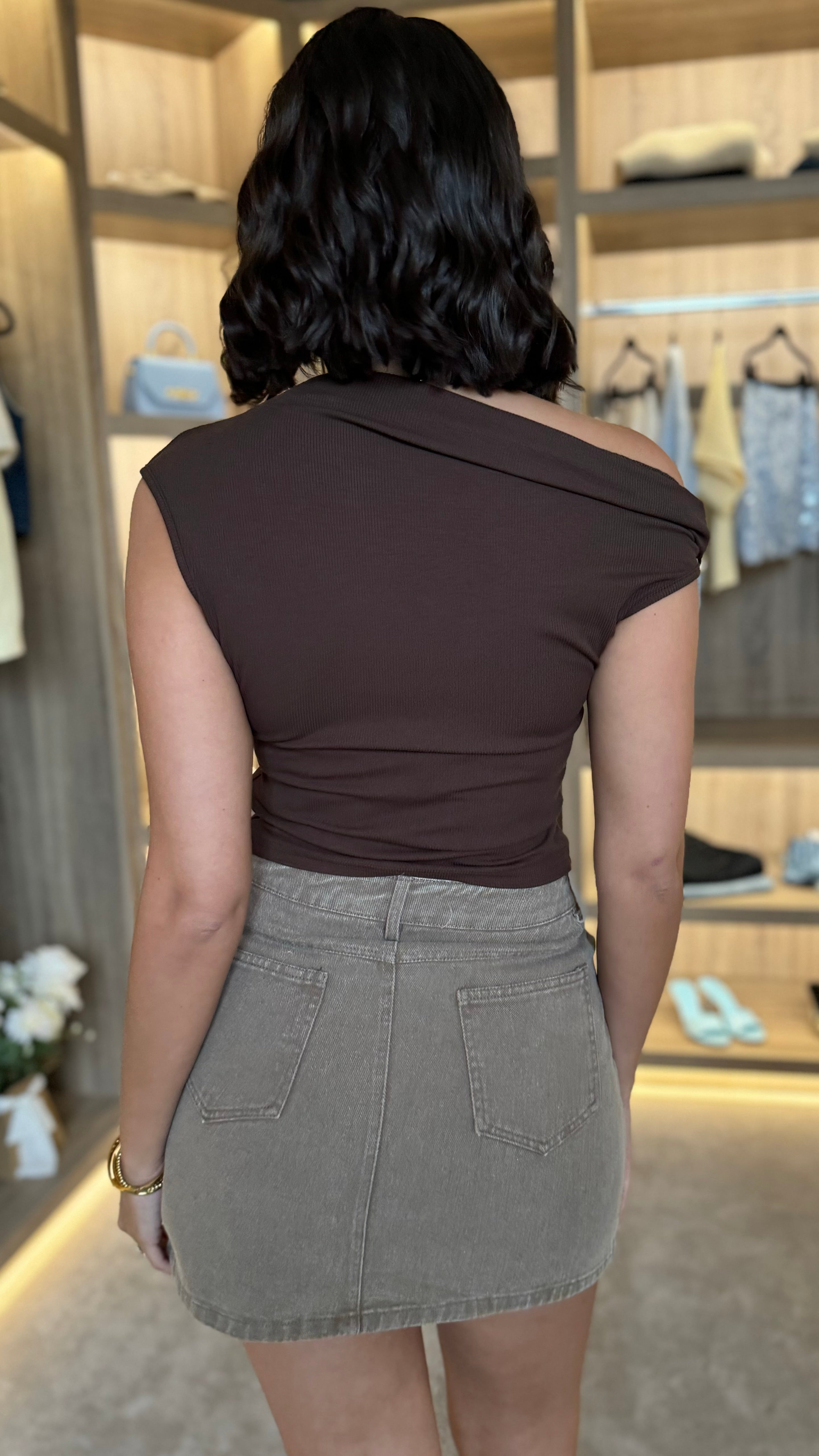 Sophia Chocolate Brown Asymmetric Neckline Top