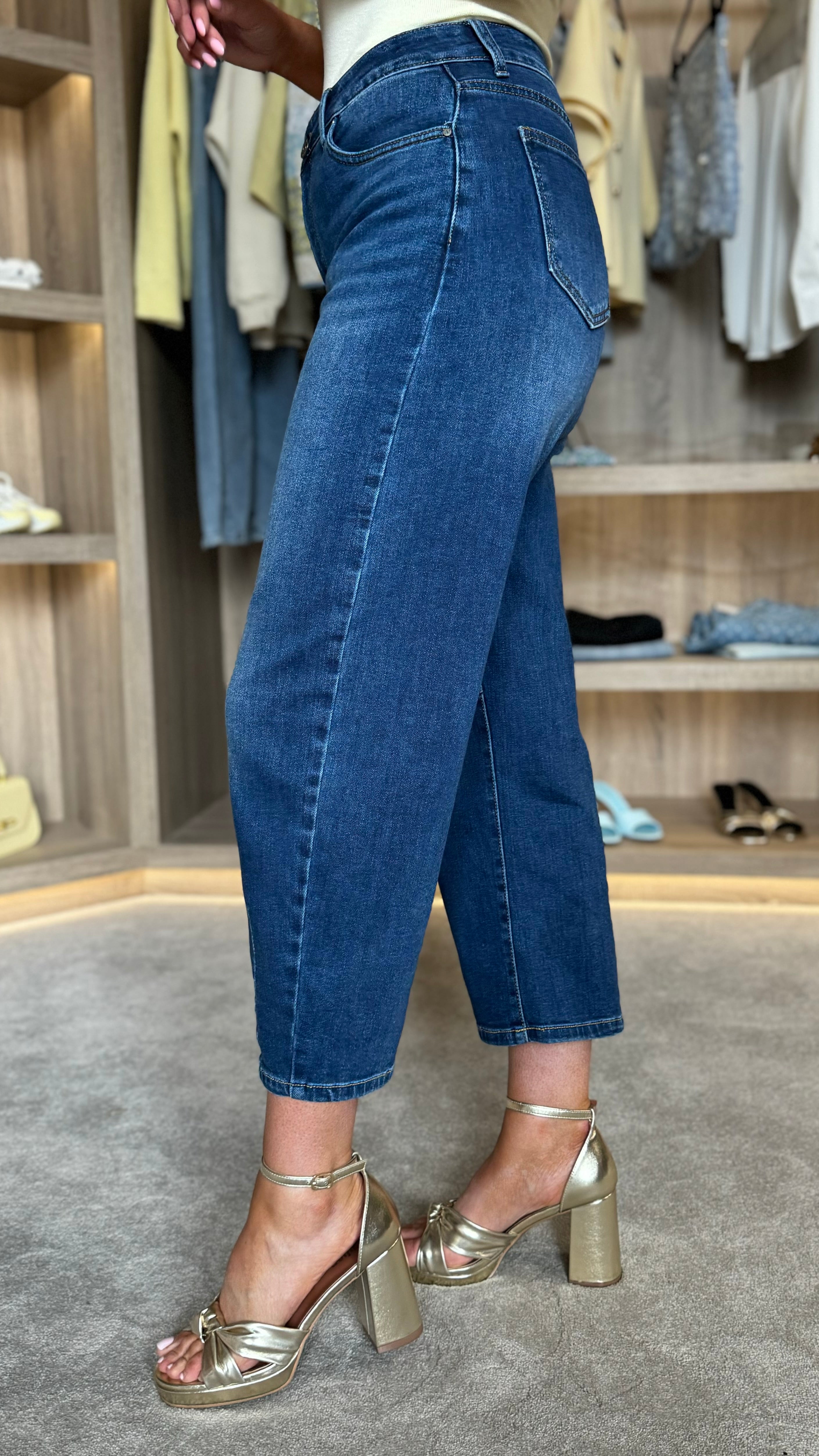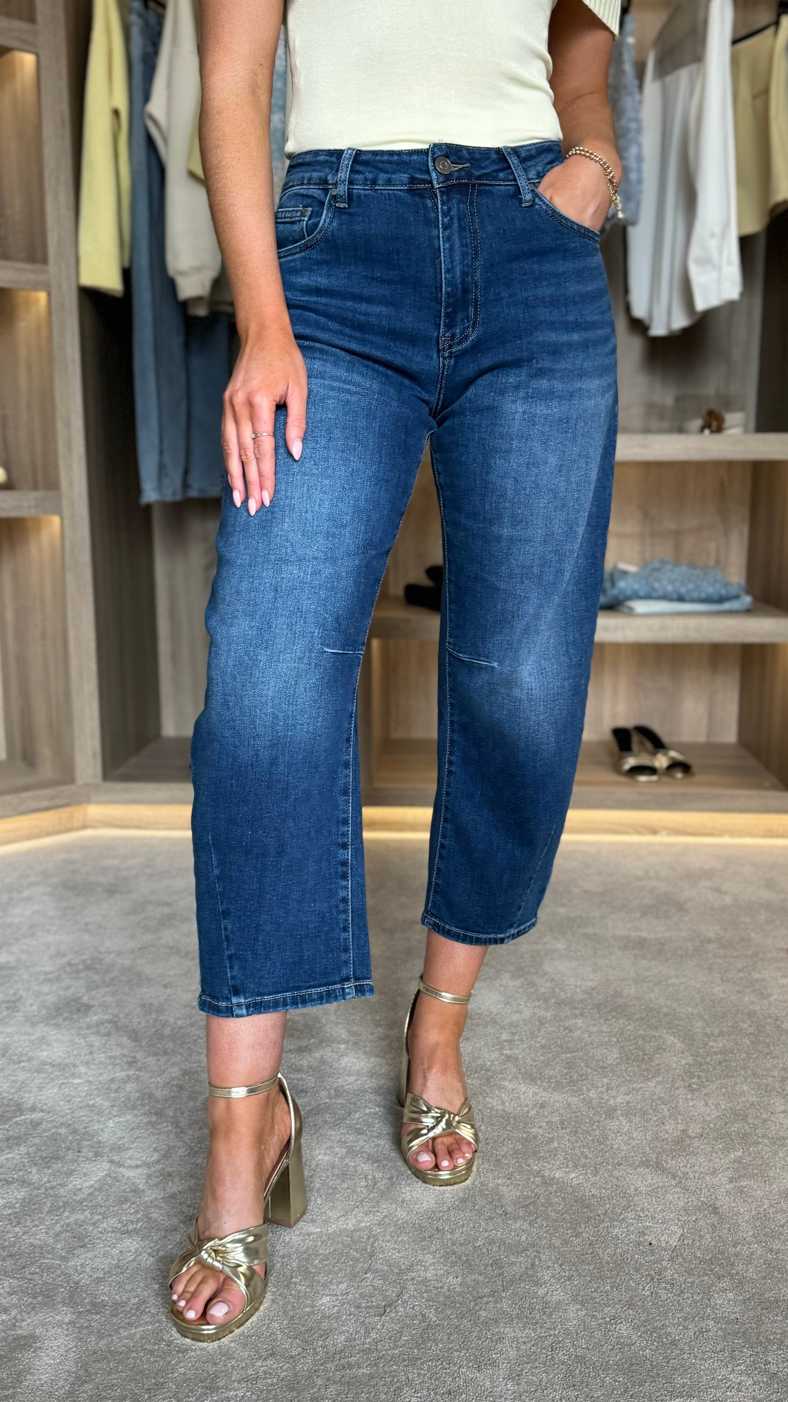 Tate Dark Blue Barrel Jeans feature a flattering mid-rise waist with a cropped, barrel-leg silhouette that balances structure and ease. Functional belt loops and front and back pockets provide practical styling options and everyday storage. The light blue wash offers versatile pairing potential across your wardrobe, from casual basics to layered looks.