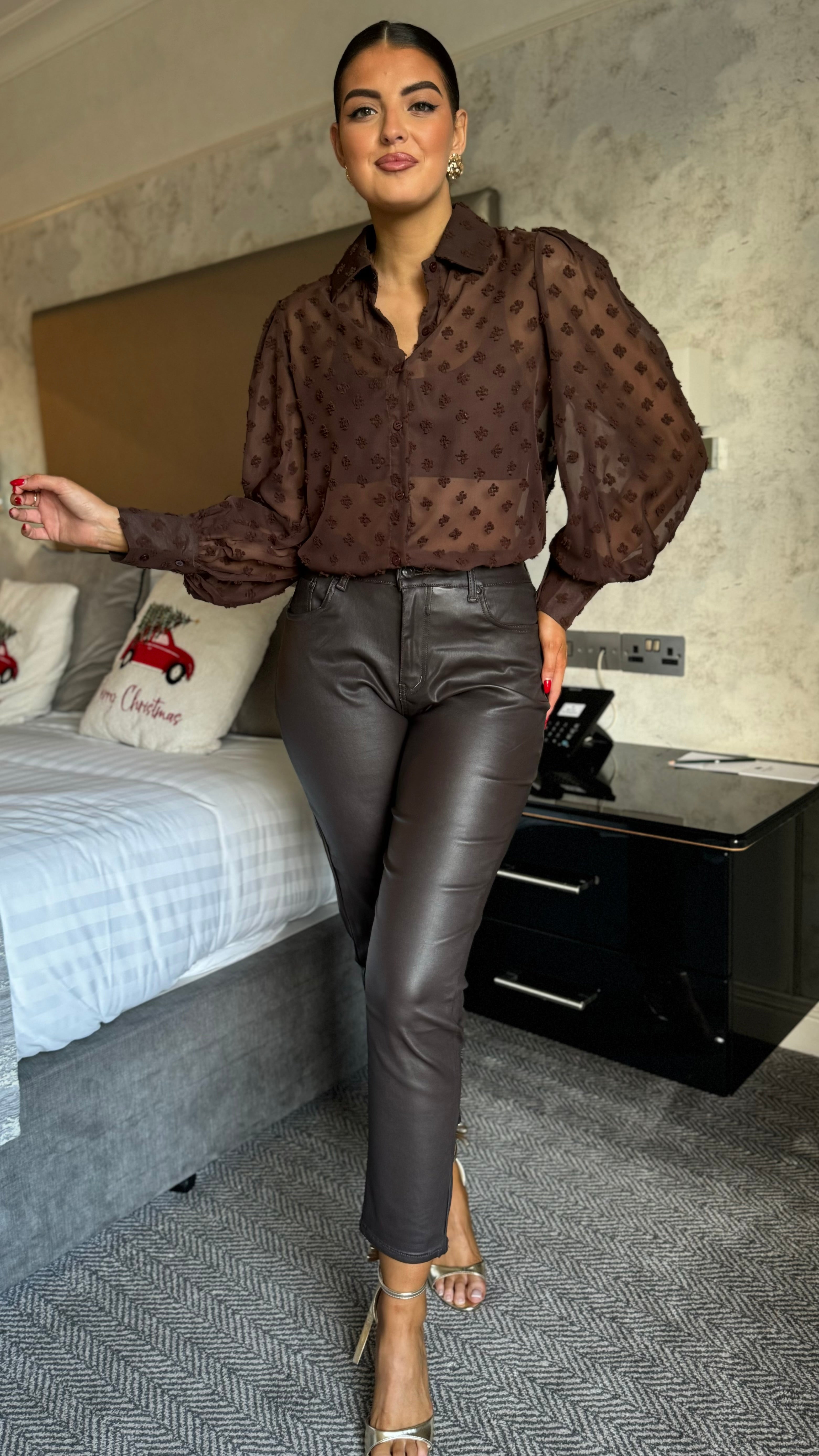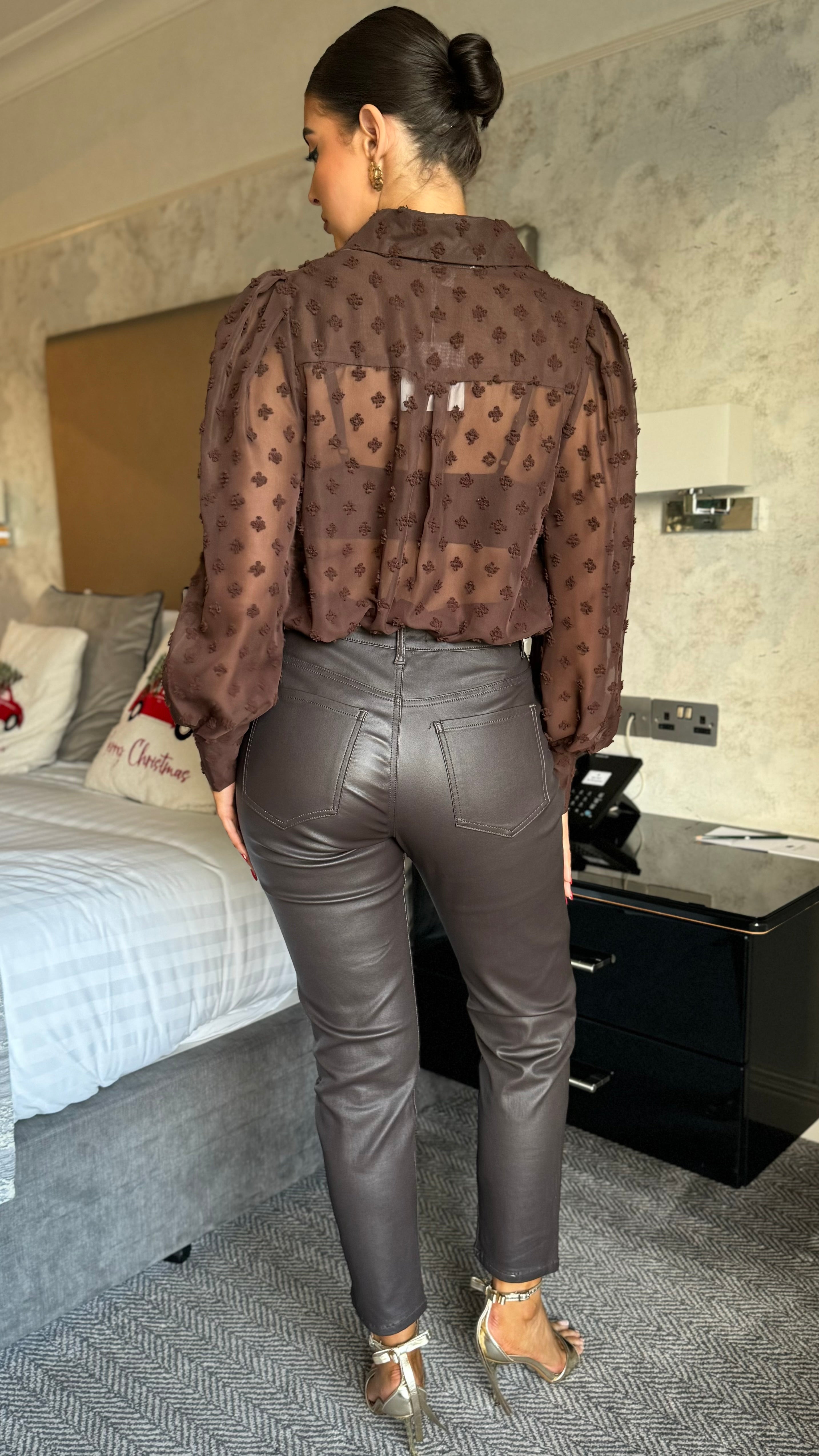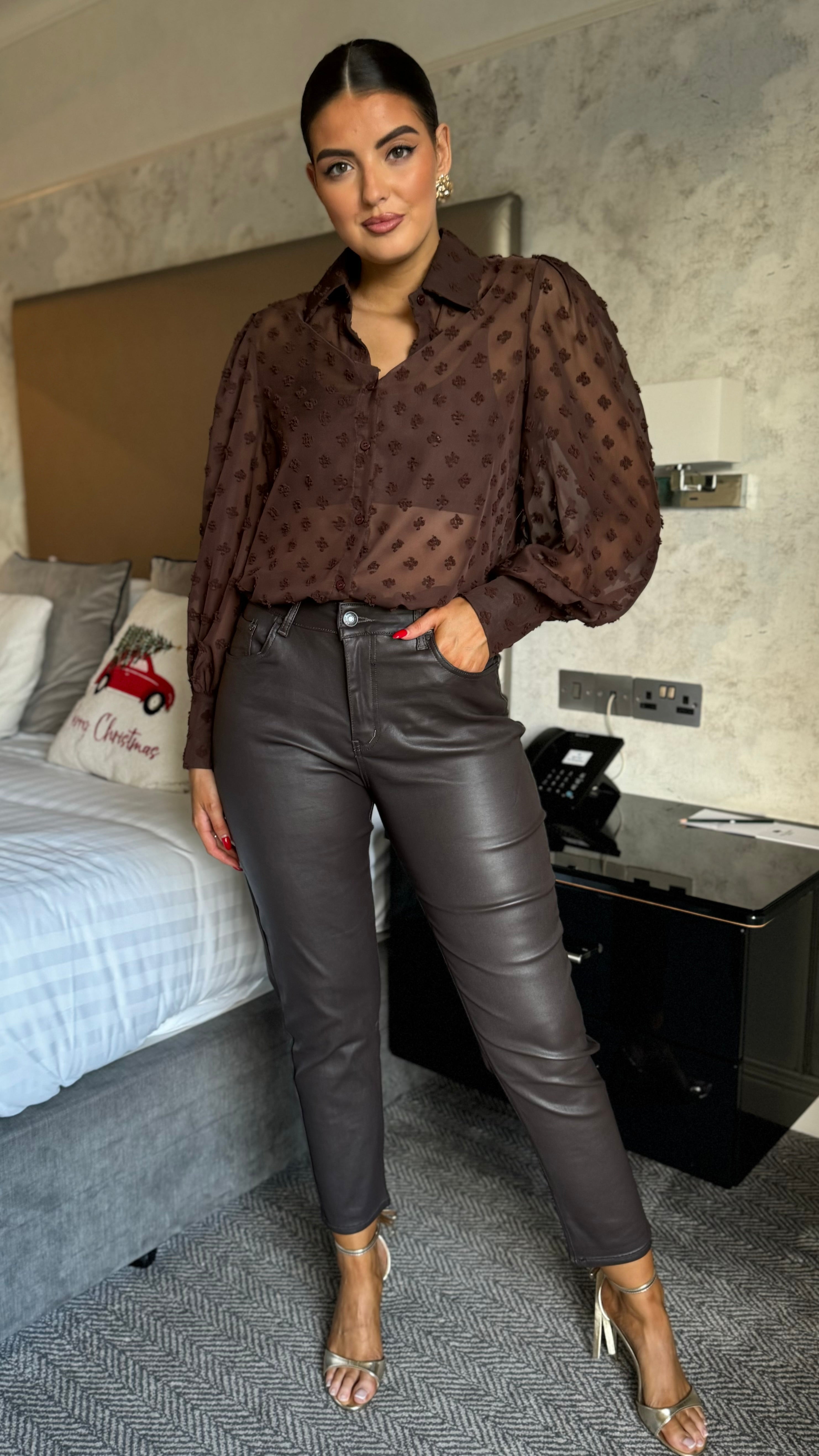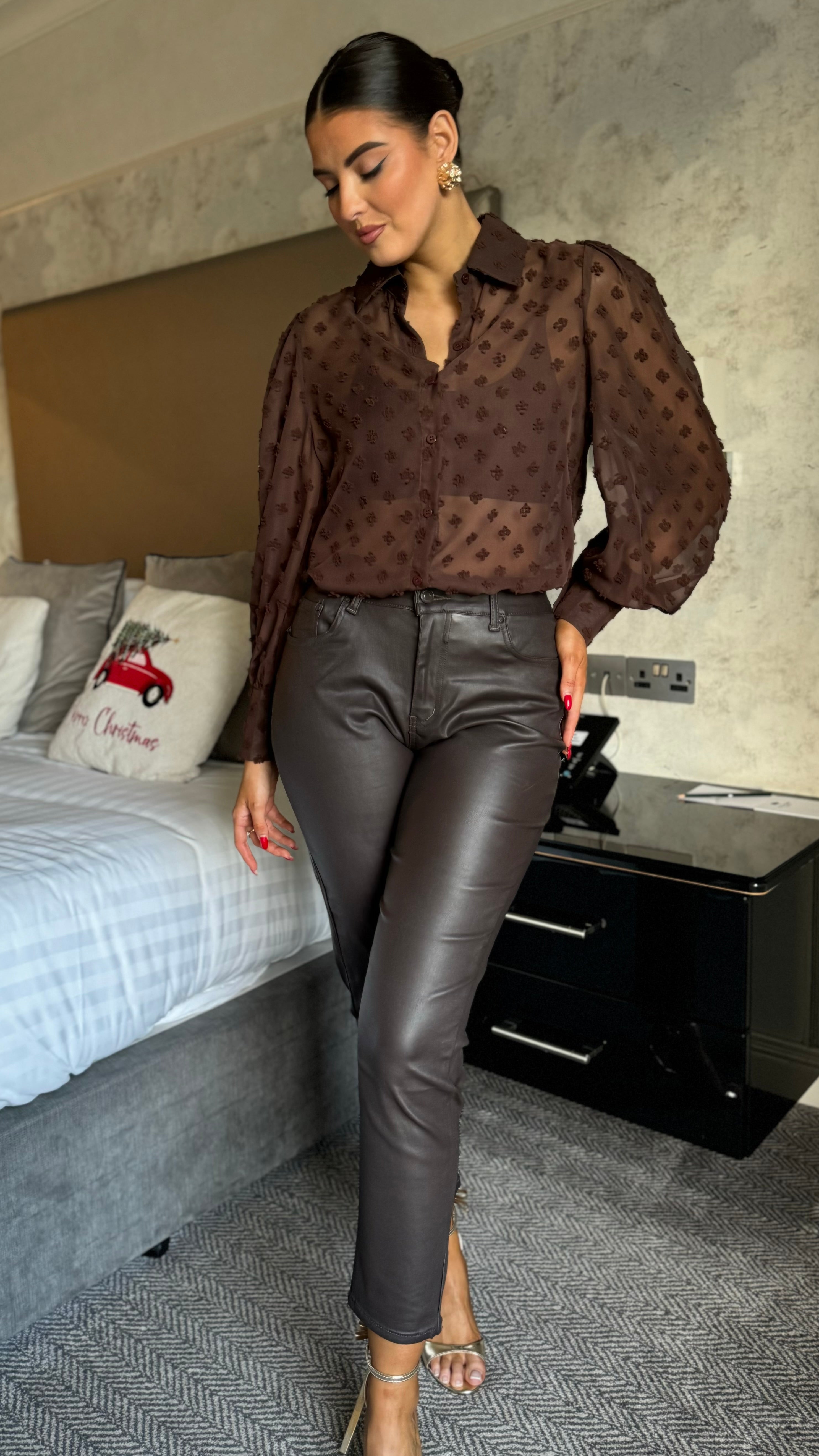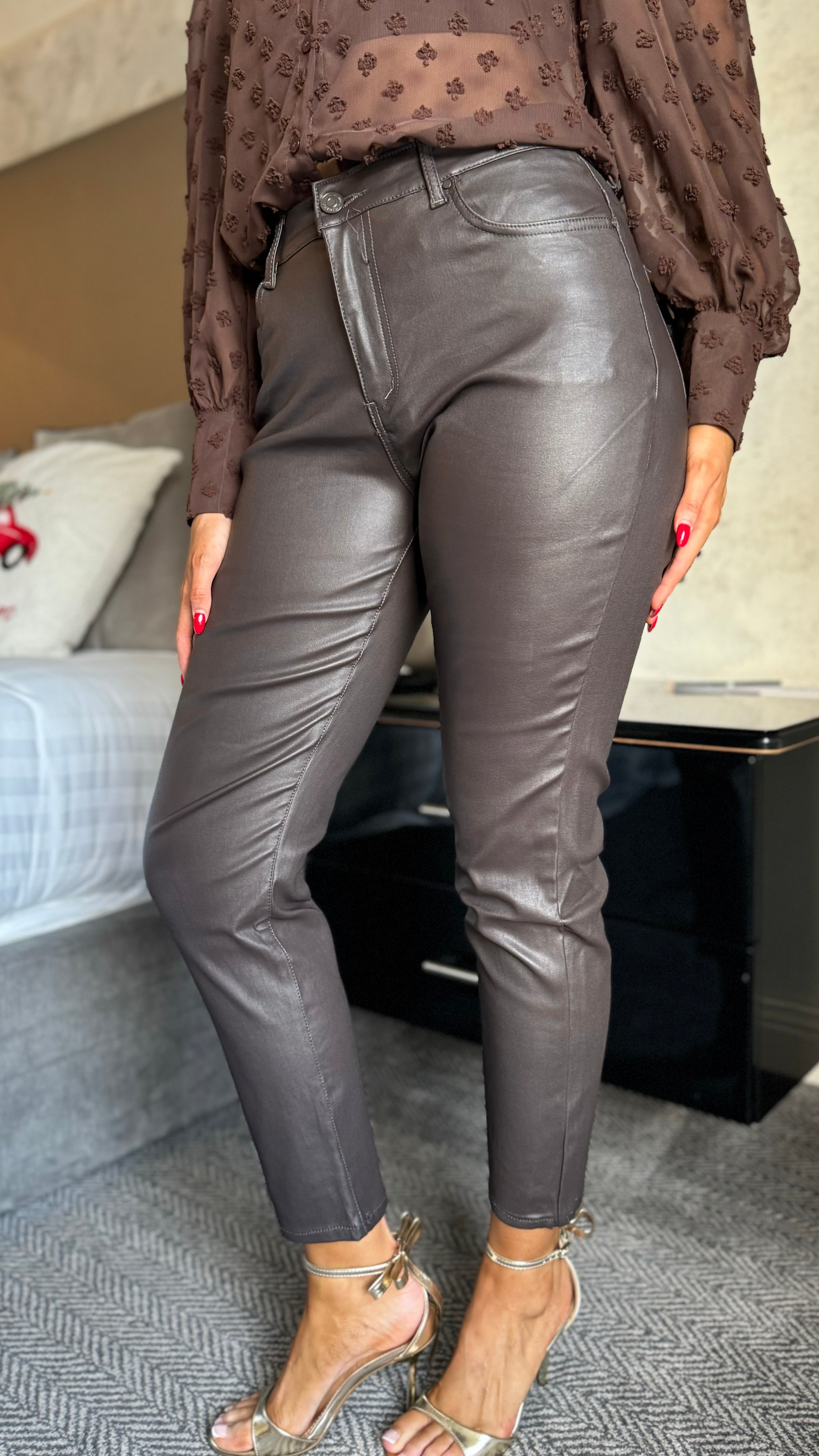 Elevate your denim game with these Taylor Brown Faux Leather Cropped Jeans—the perfect blend of retro cool and modern edge. Featuring a flattering high-waist, relaxed mom-fit silhouette that skims beautifully through the hips and thighs, these jeans deliver comfort without compromise. The stretchy fabric moves with you, while the matte leather-look finish adds instant sophistication to any outfit. Complete with a functional zipped fly and classic five-pocket styling, they're your new go-to for effortless, statement-making style.