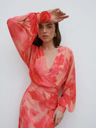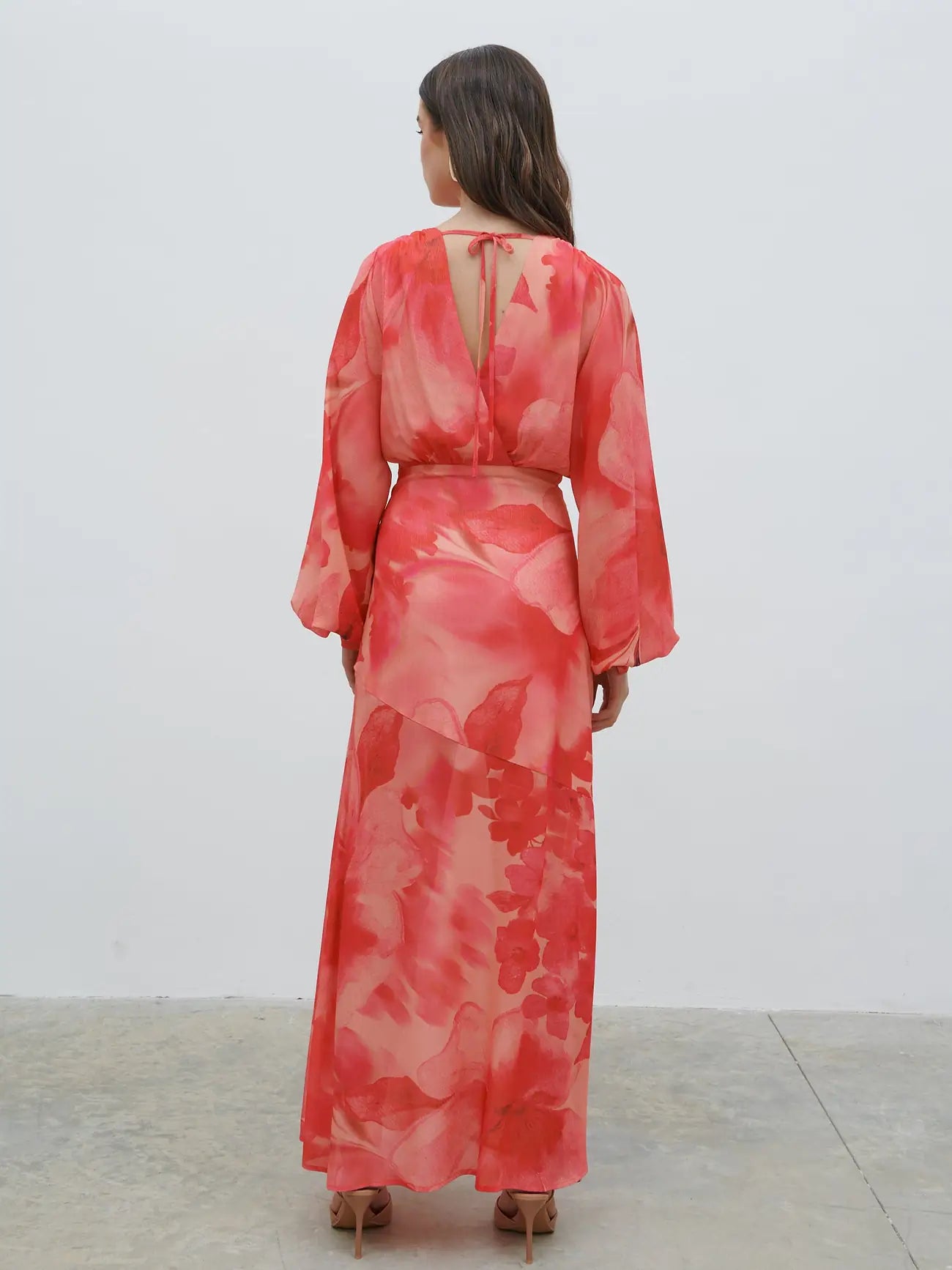 Theia Pink & Red Floral Batwing Ruffle Detail Maxi Dress
