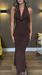 Turn heads effortlessly in the Tommy Brown Halterneck Diamante Detail Maxi Dress. Featuring a chic cowl neck and figure-flattering halterneck design, this dress offers a playful blend of elegance and edge. The delicate mesh and partially lined fabric create a light, breathable feel, while the elasticated back ensures a comfortable, perfect fit. Sparkle your way through any occasion with this stunning maxi dress that dances with every step.